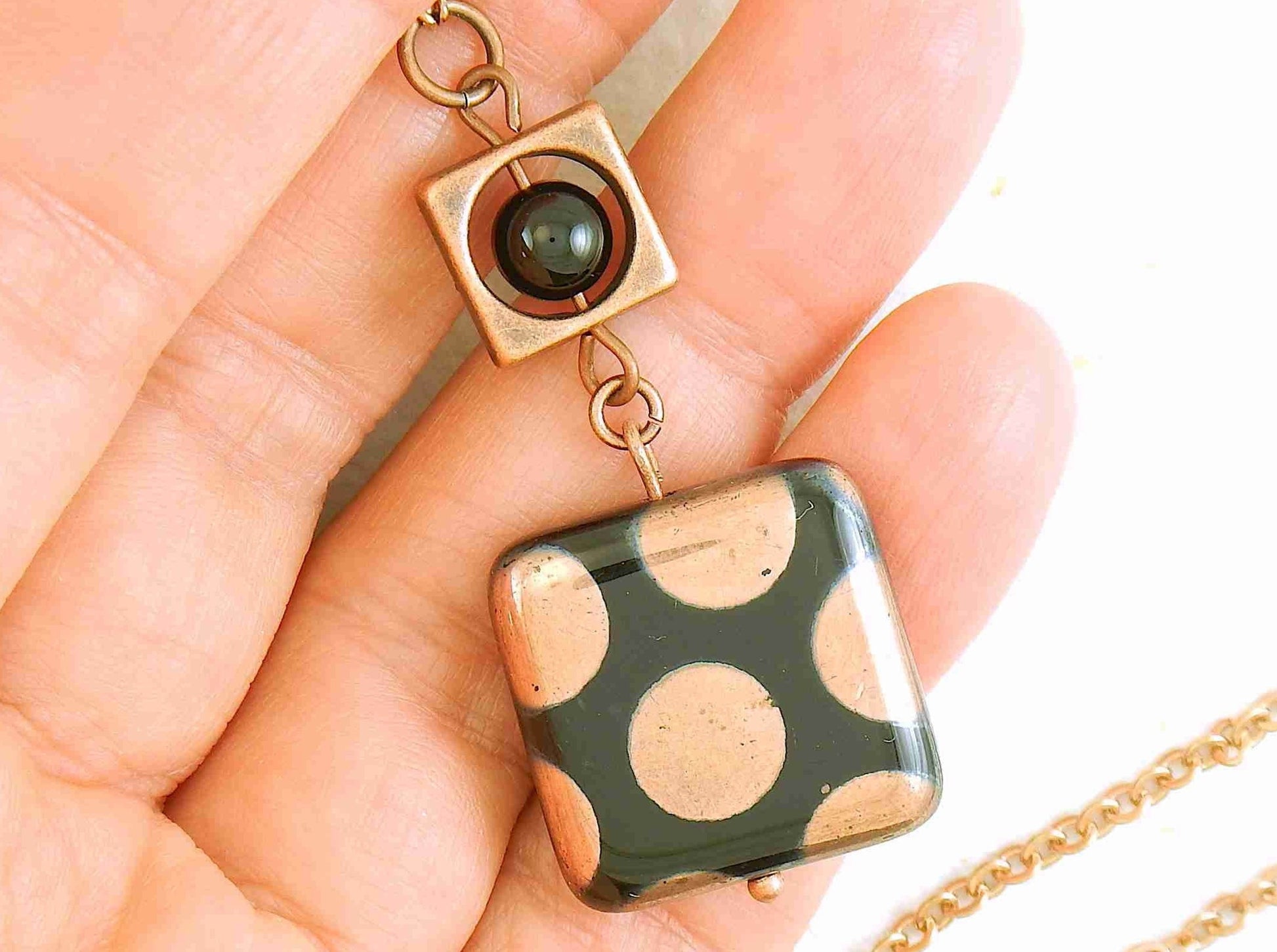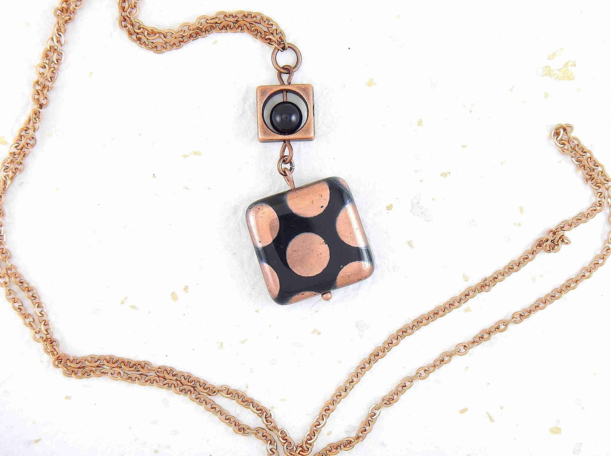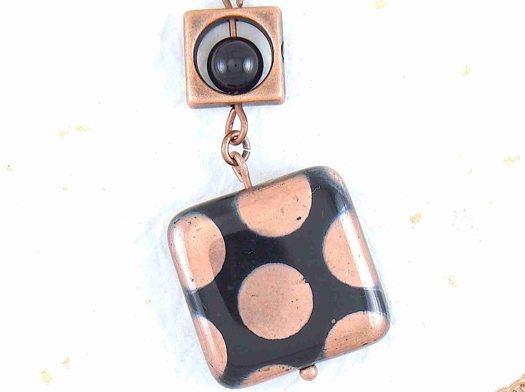 25-inch necklace with black Czech glass square, copper or silver polka dots, matching stainless steel chain