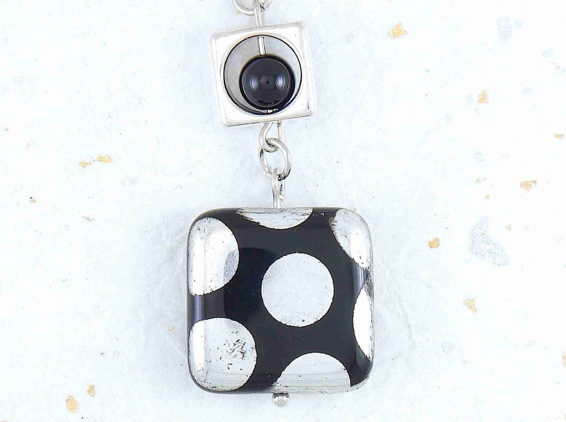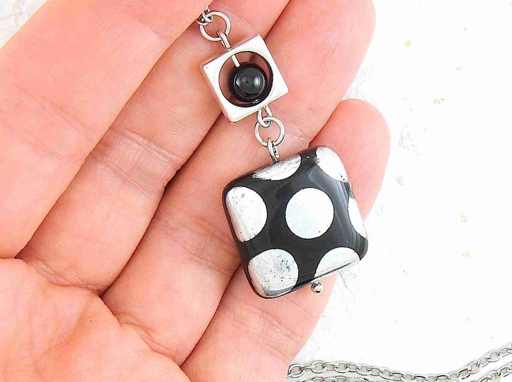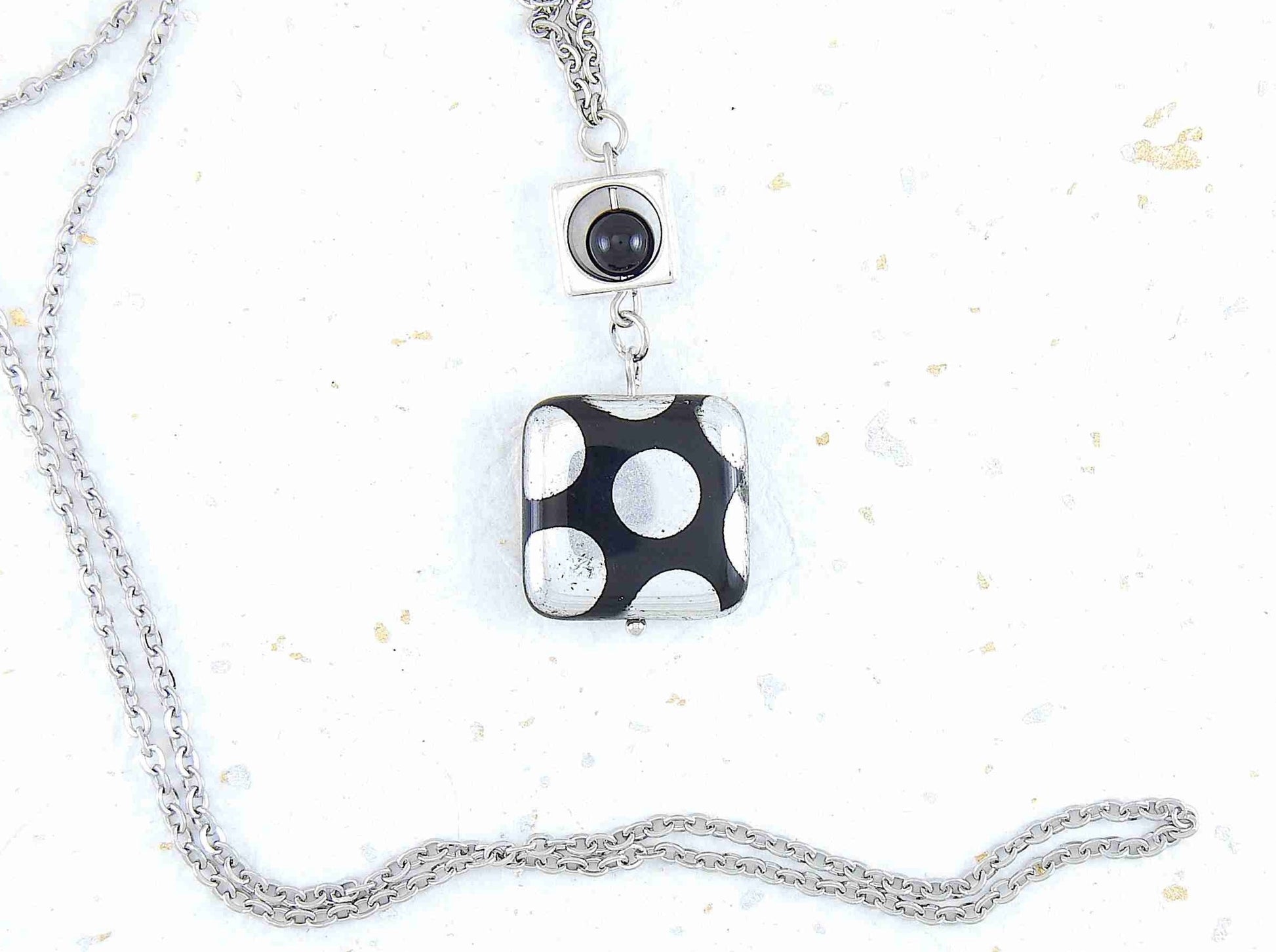 25-inch necklace with black Czech glass square, copper or silver polka dots, matching stainless steel chain