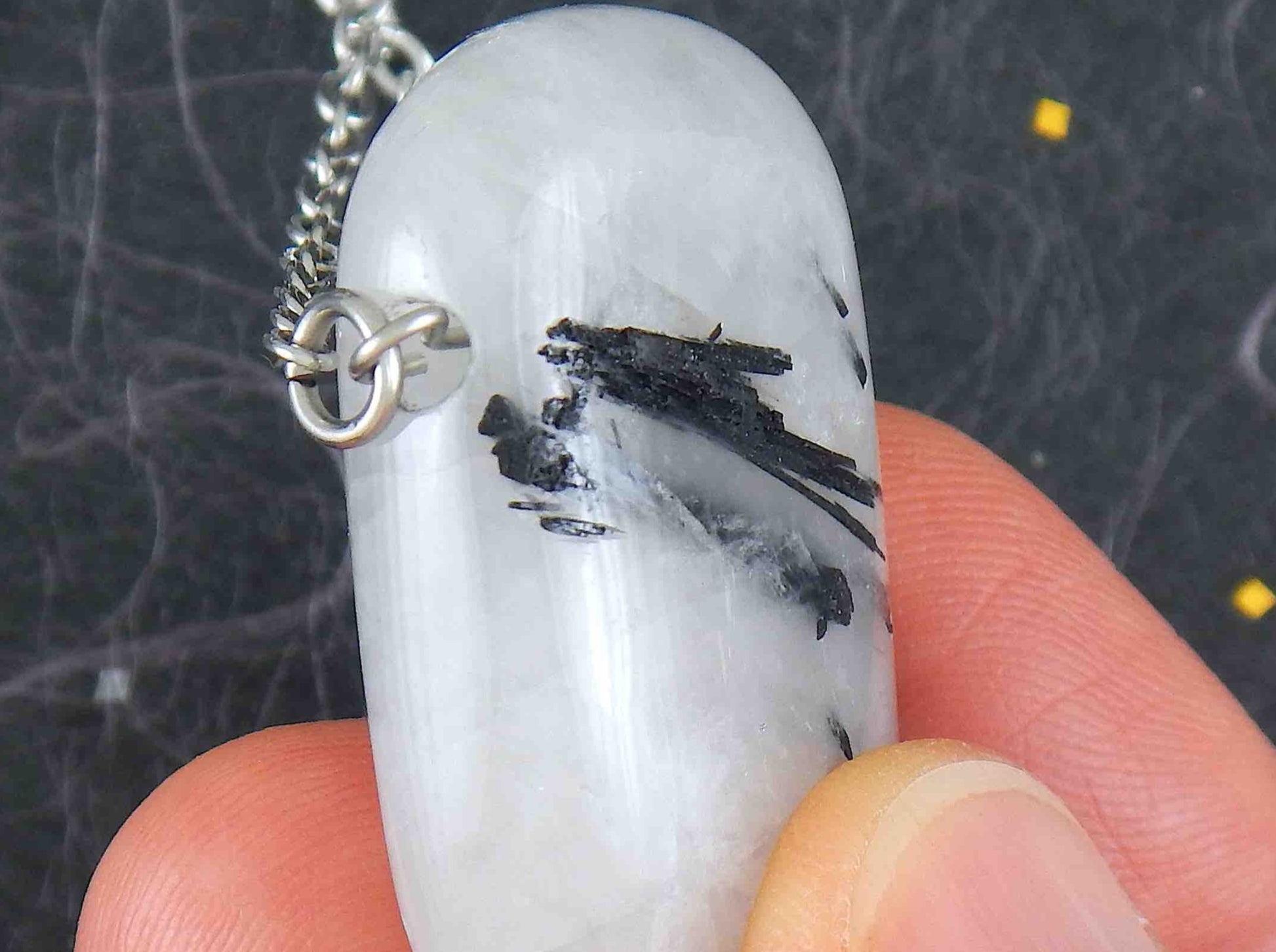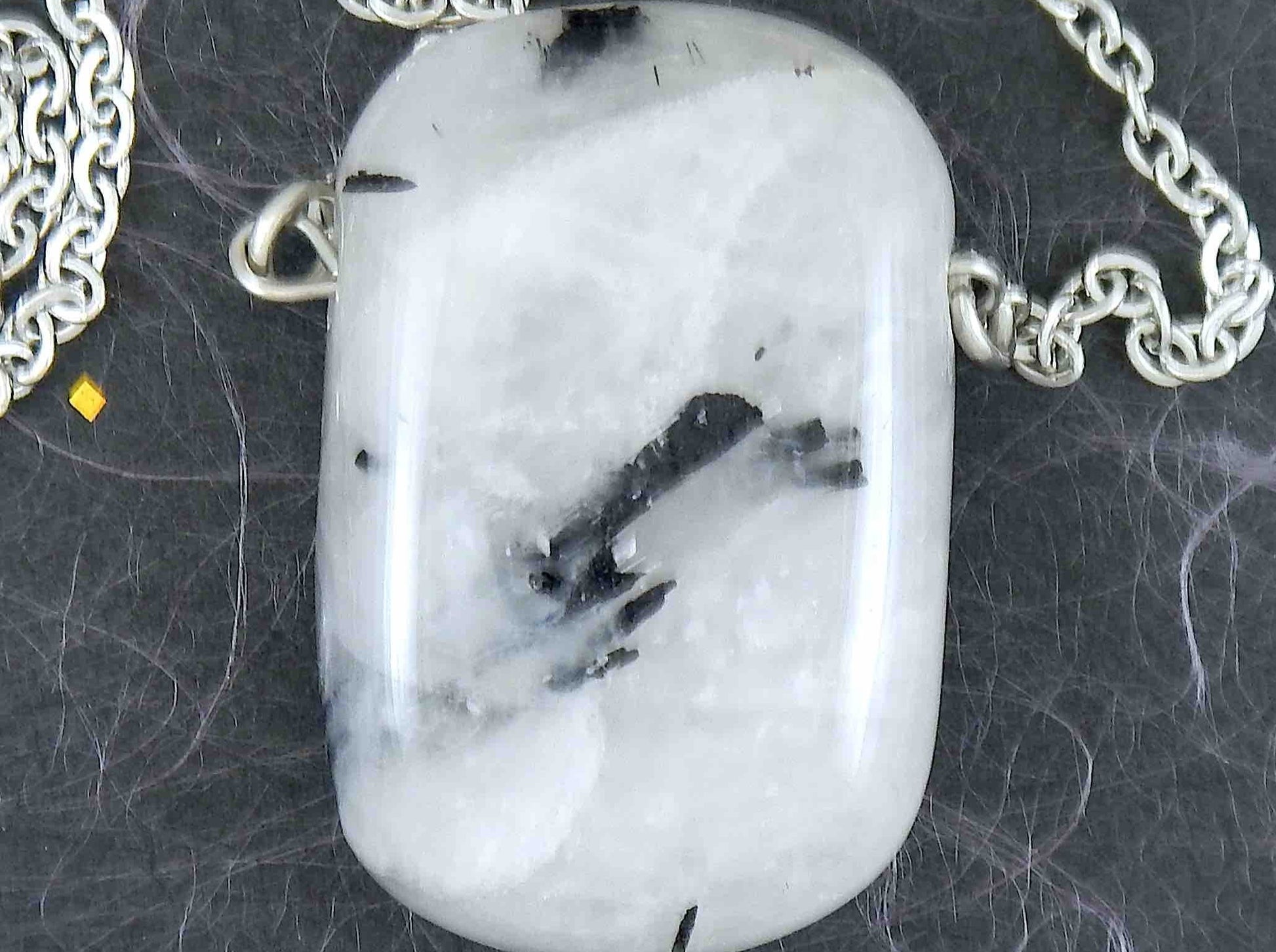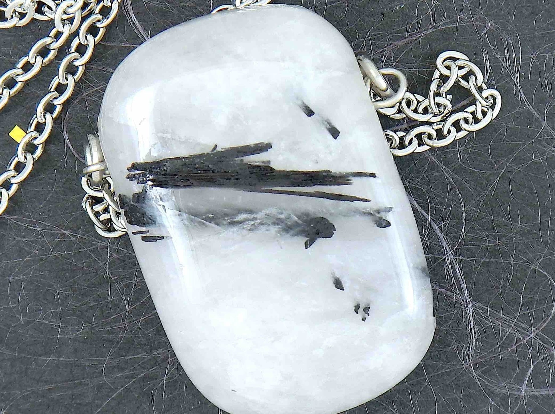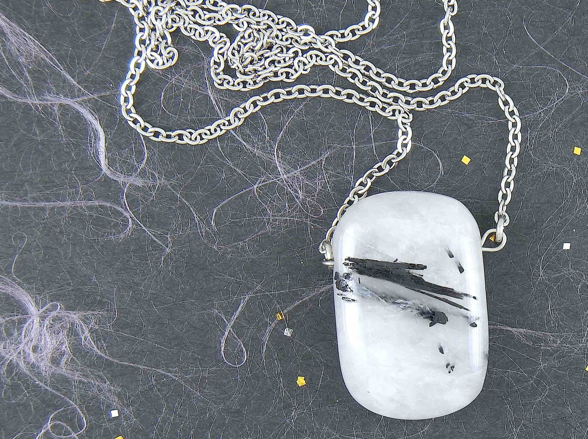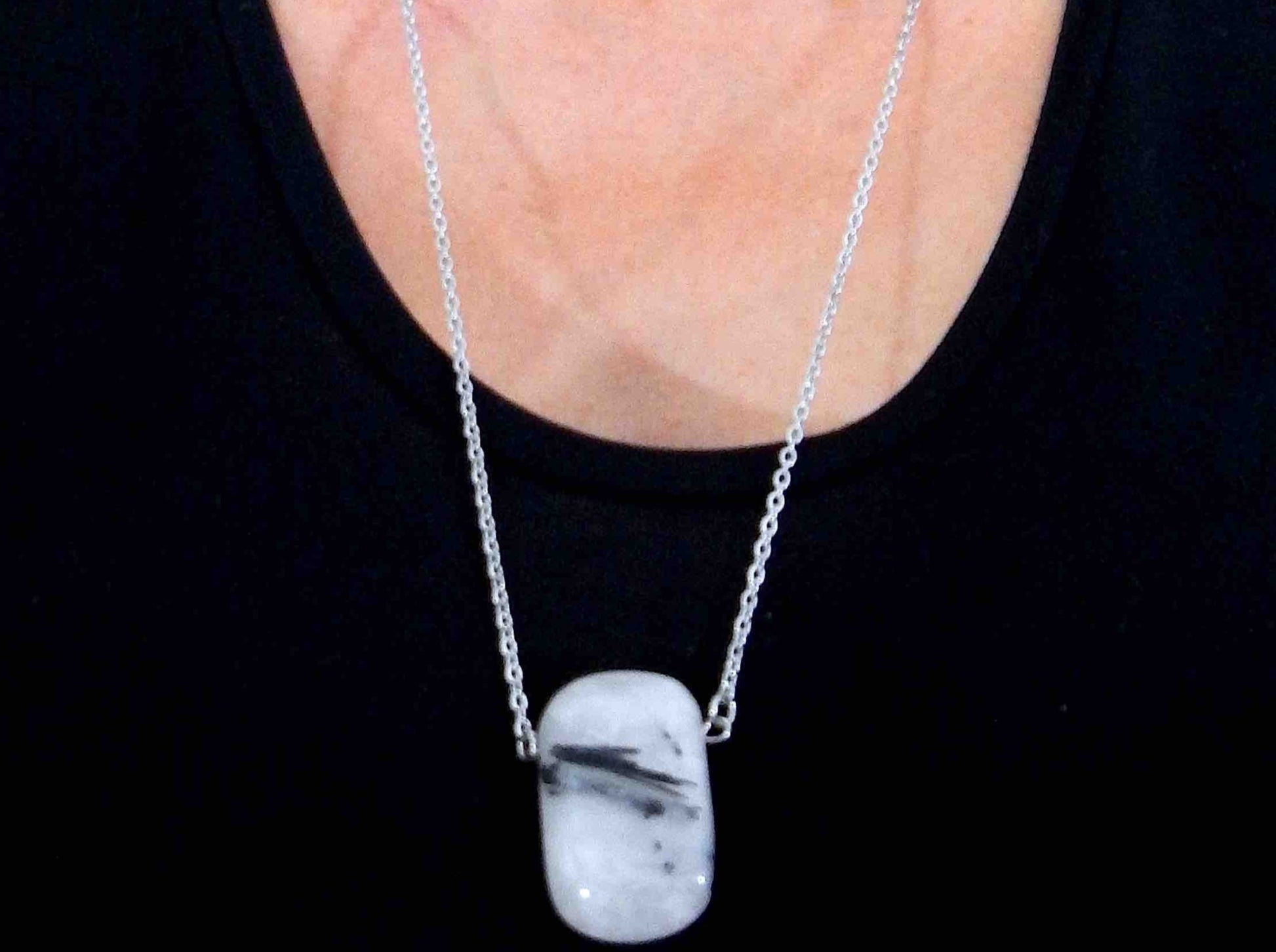 26-inch necklace with rectangular black and white tourmalined quartz stone pendant (a rare mix), stainless steel chain