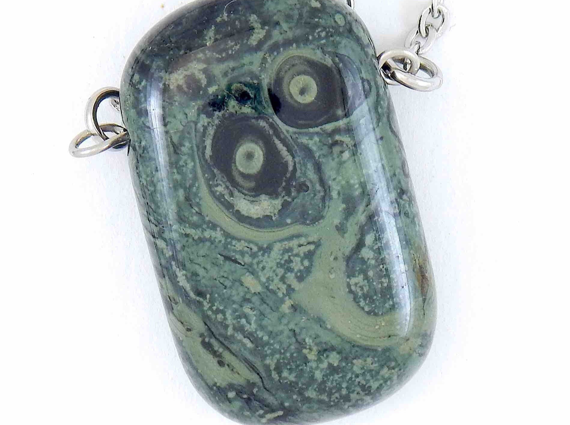 26-inch necklace with rectangular dark green and black marbled kambaba jasper stone pendant, stainless steel chain