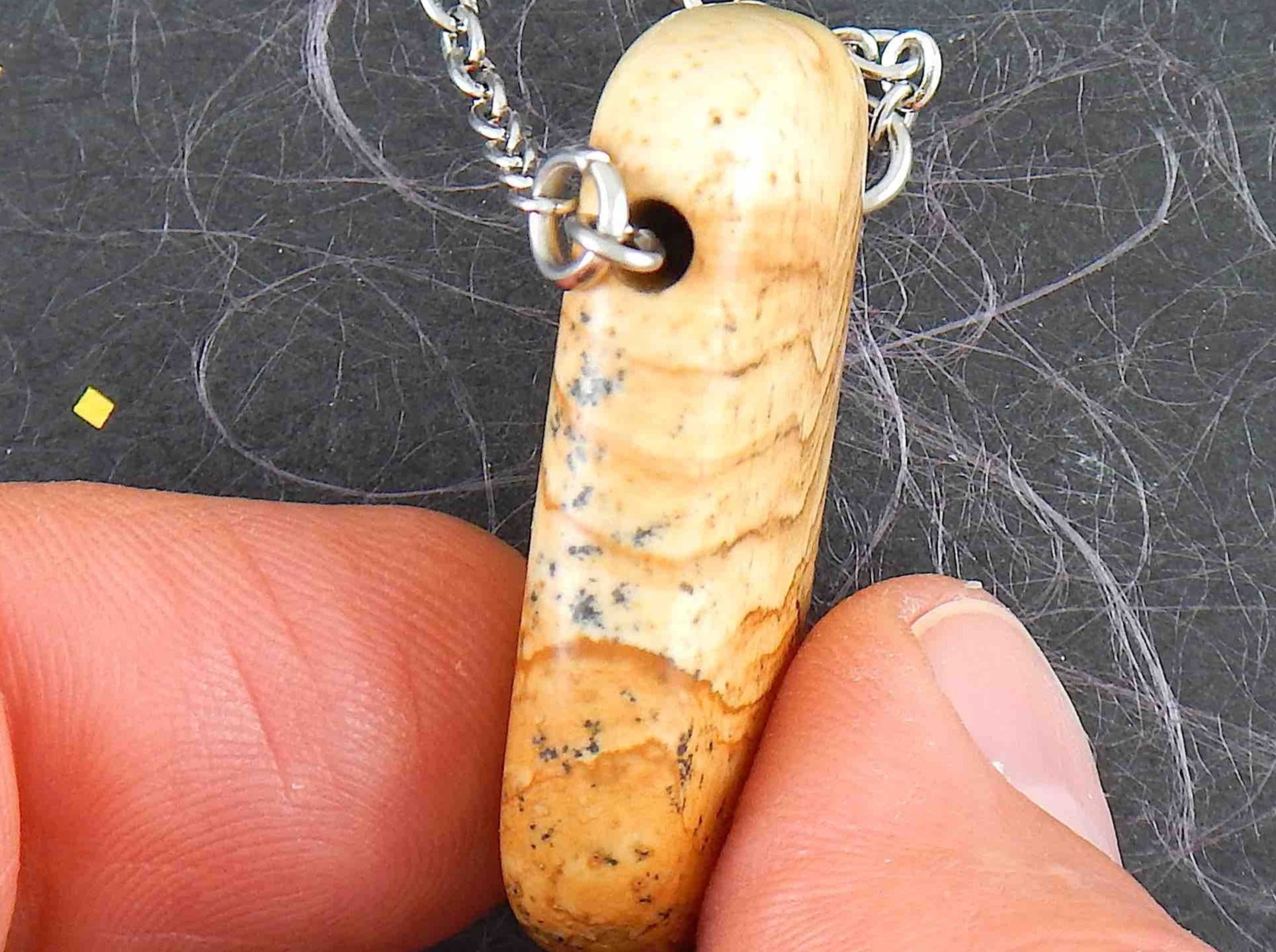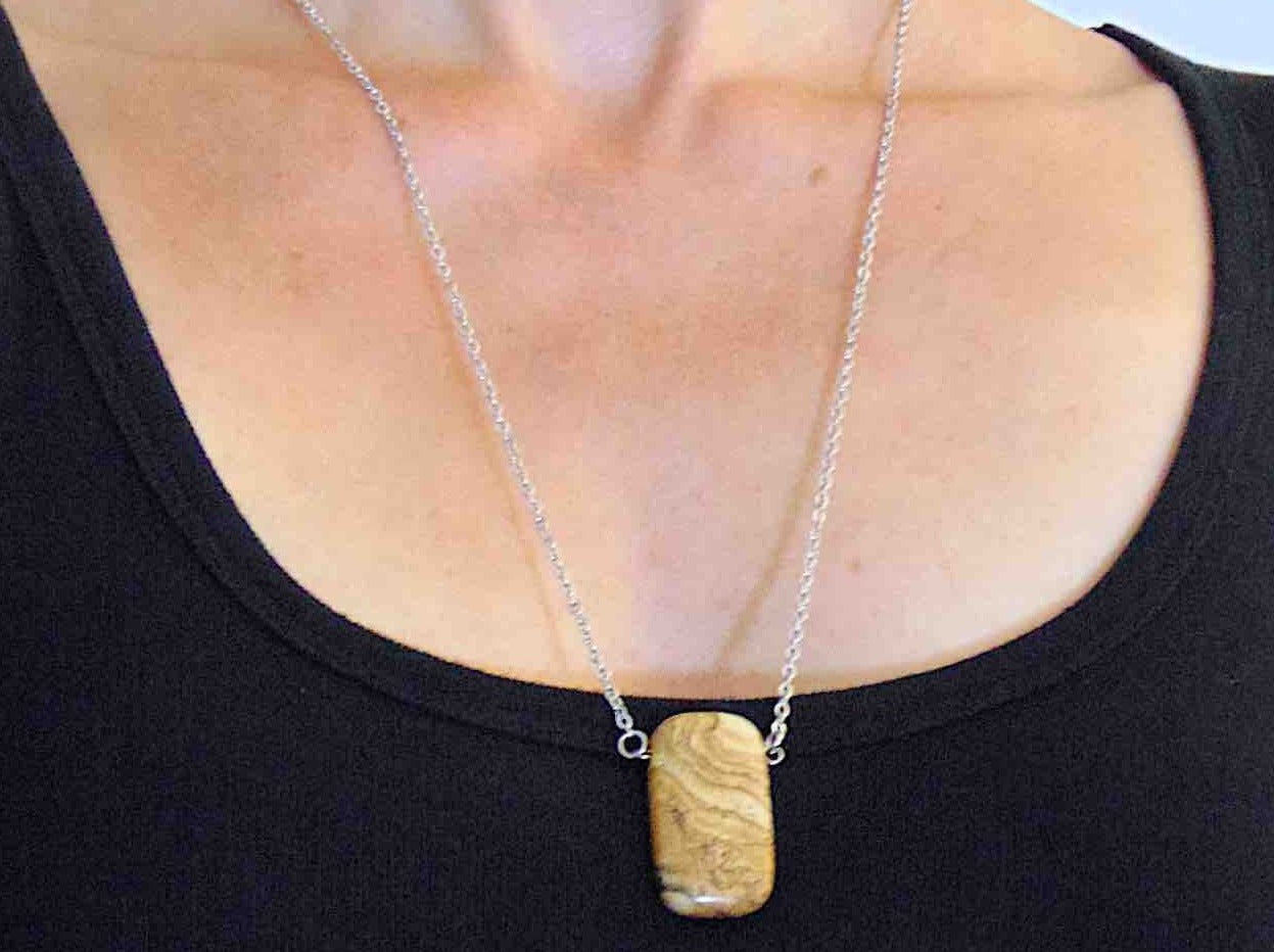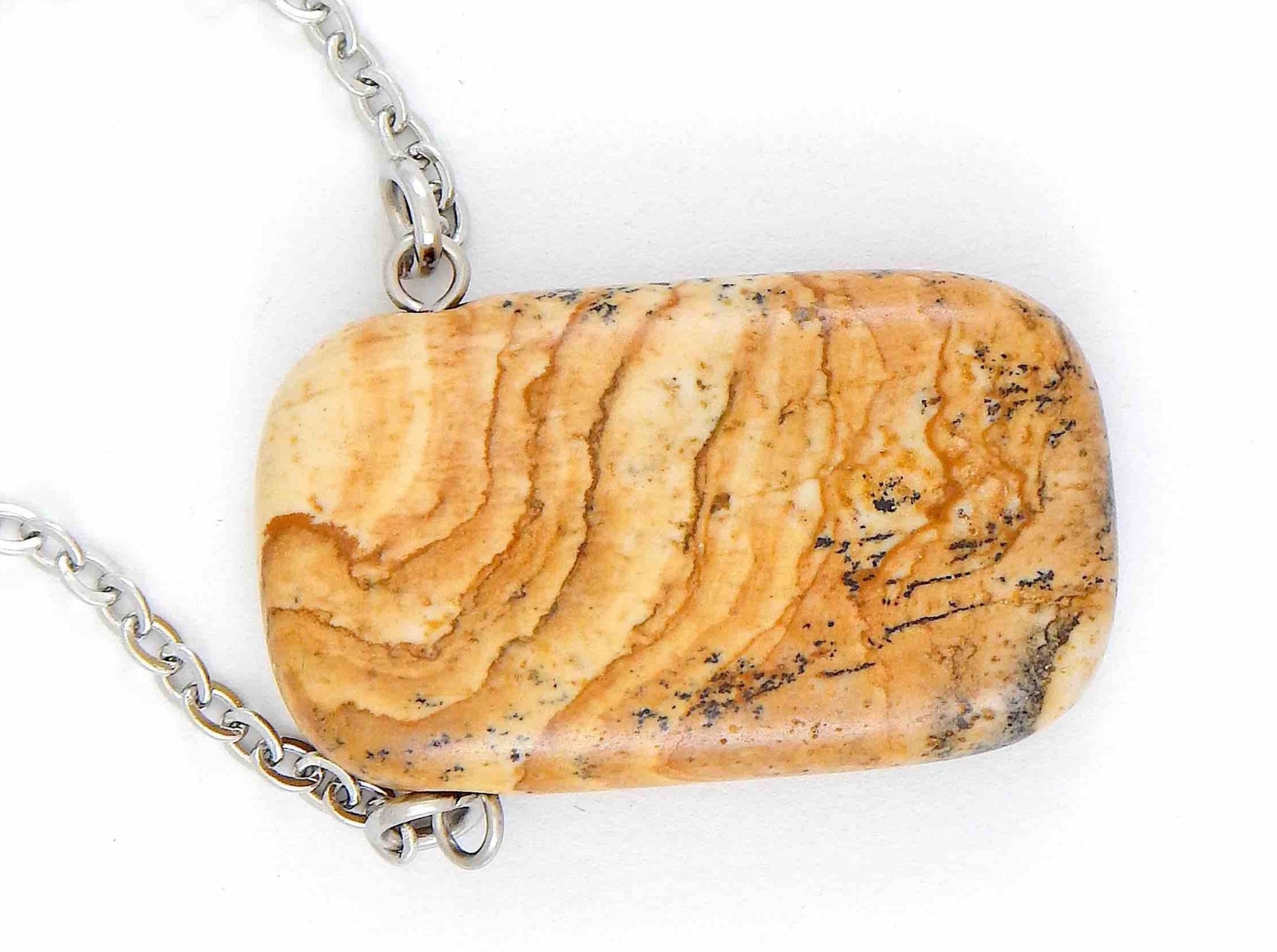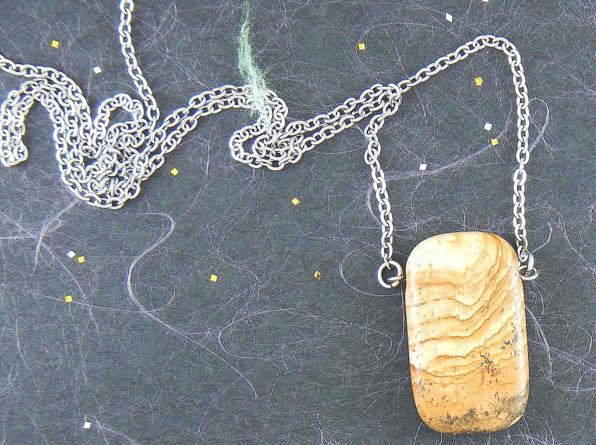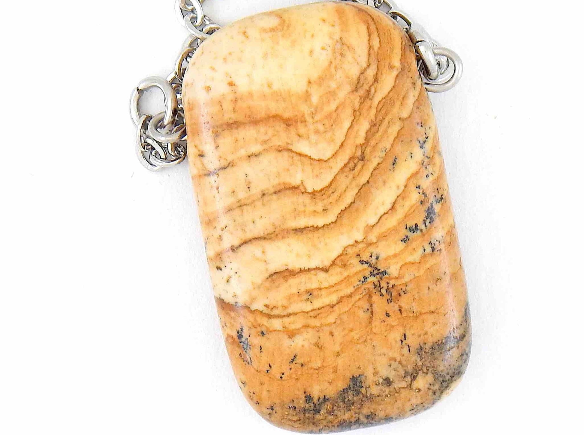 26-inch necklace with rectangular light caramel landscape jasper stone pendant, stainless steel chain