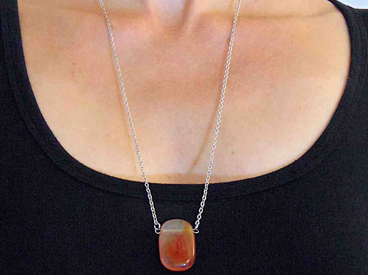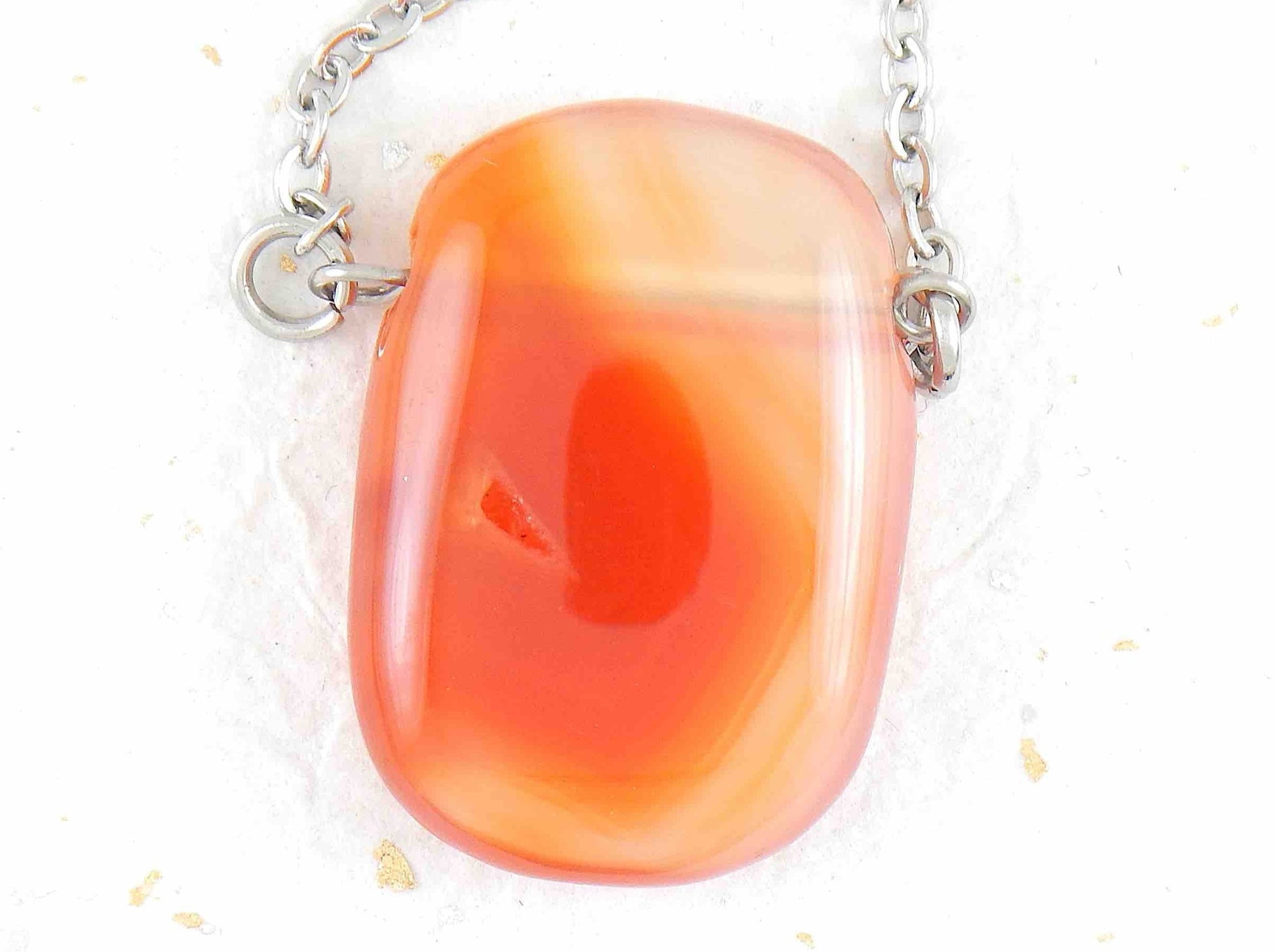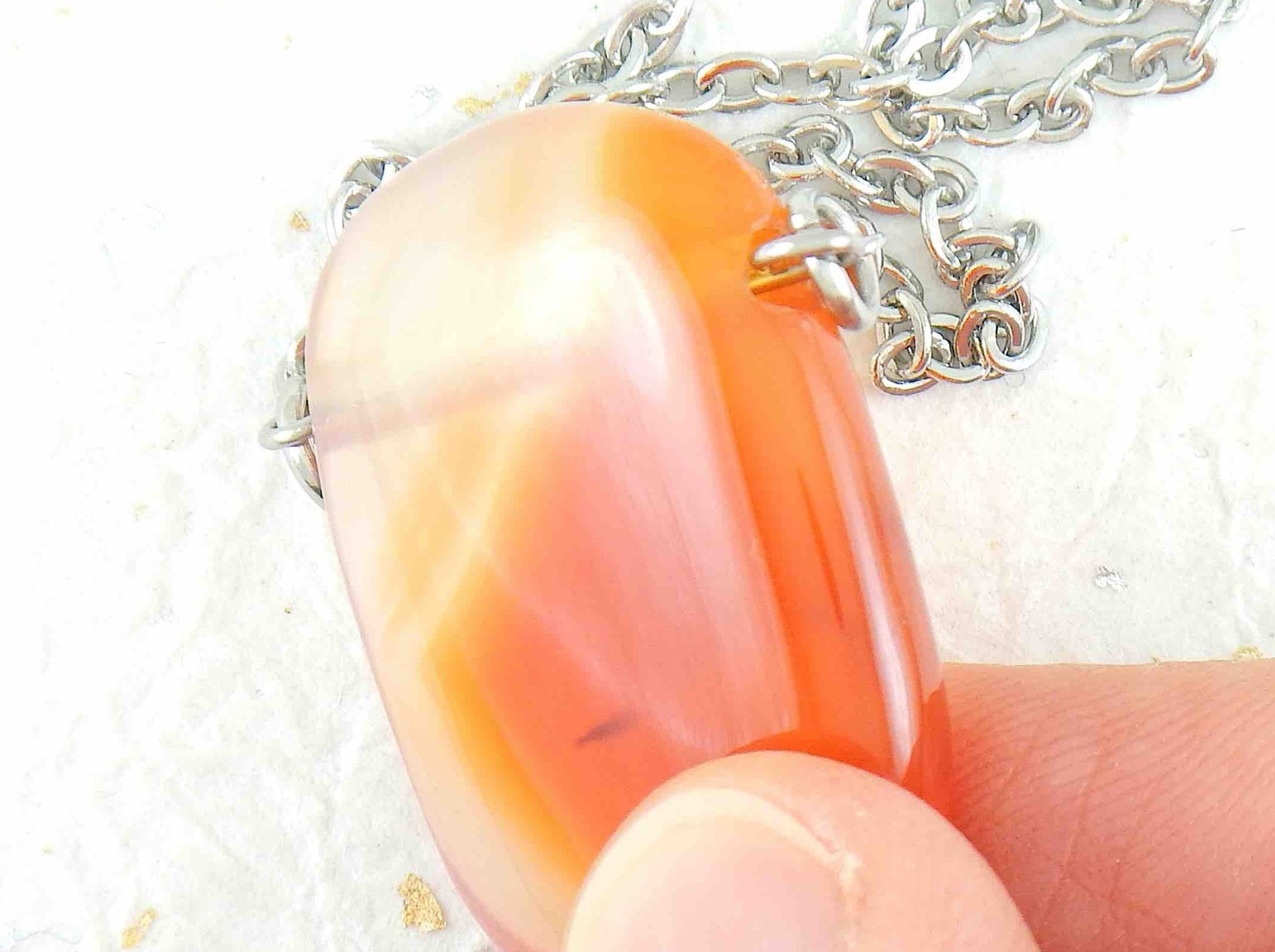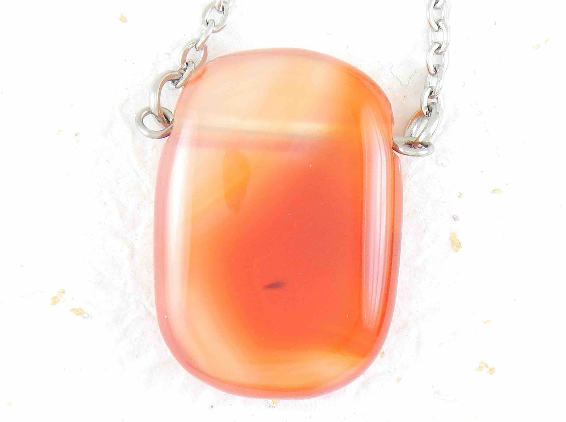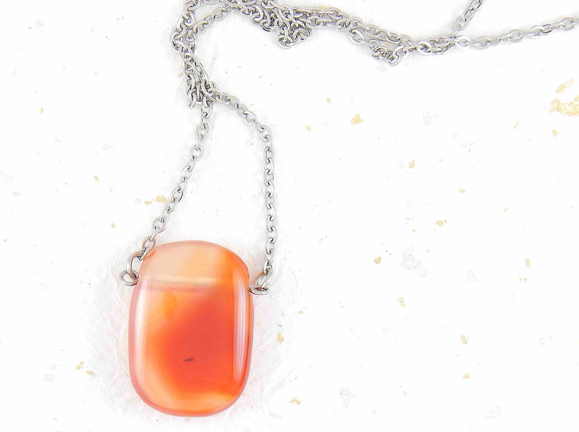 26-inch necklace with rectangular orange and clear carnelian stone pendant, stainless steel chain