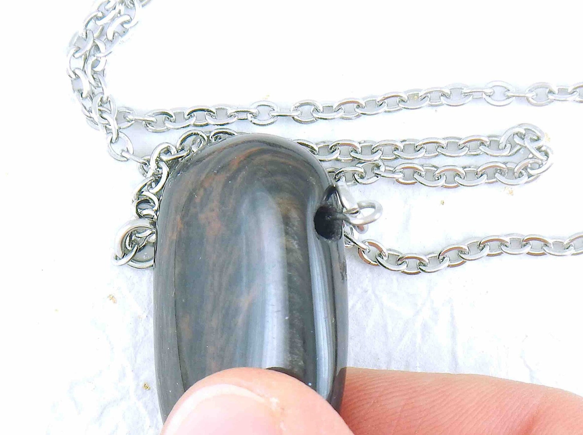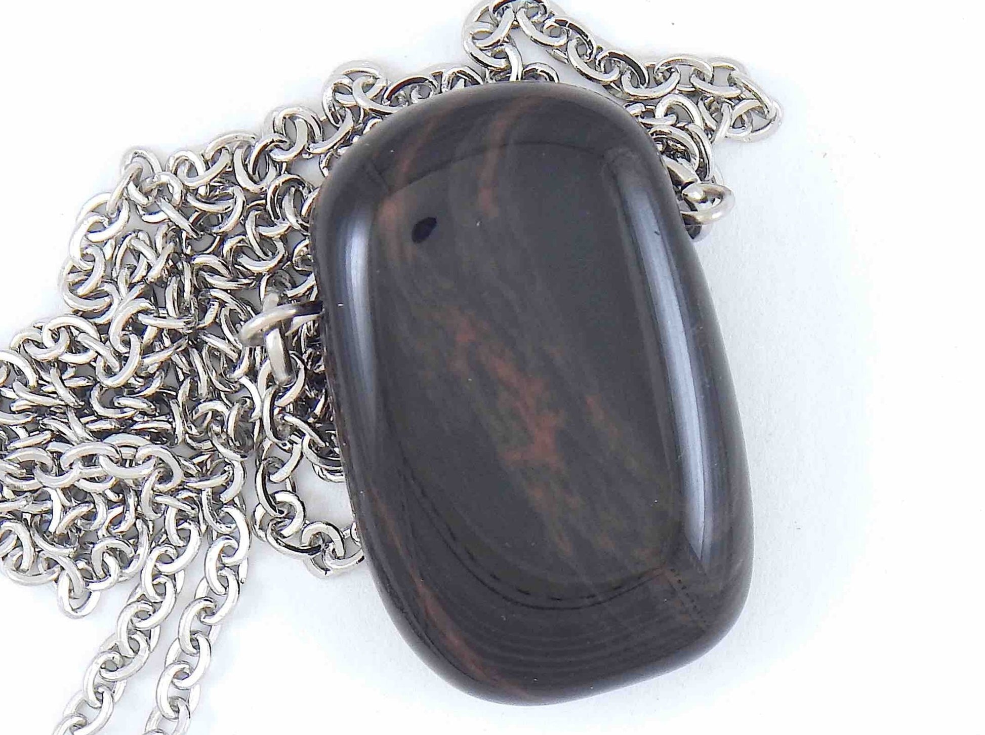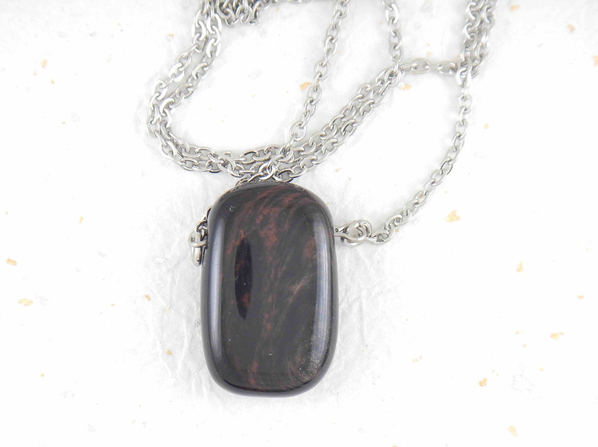 26-inch necklace with rectangular reddish gold obsidian stone pendant, stainless steel chain