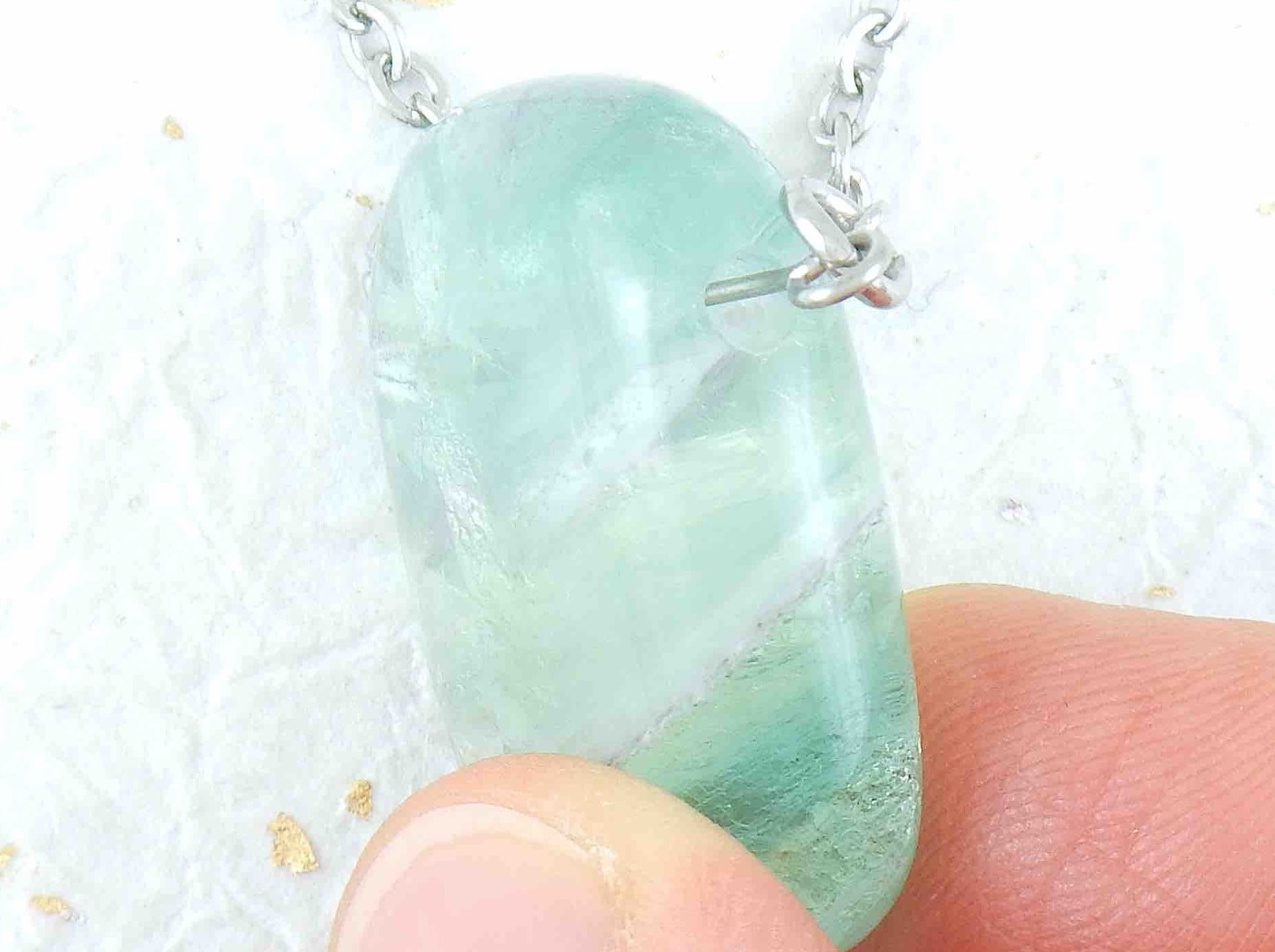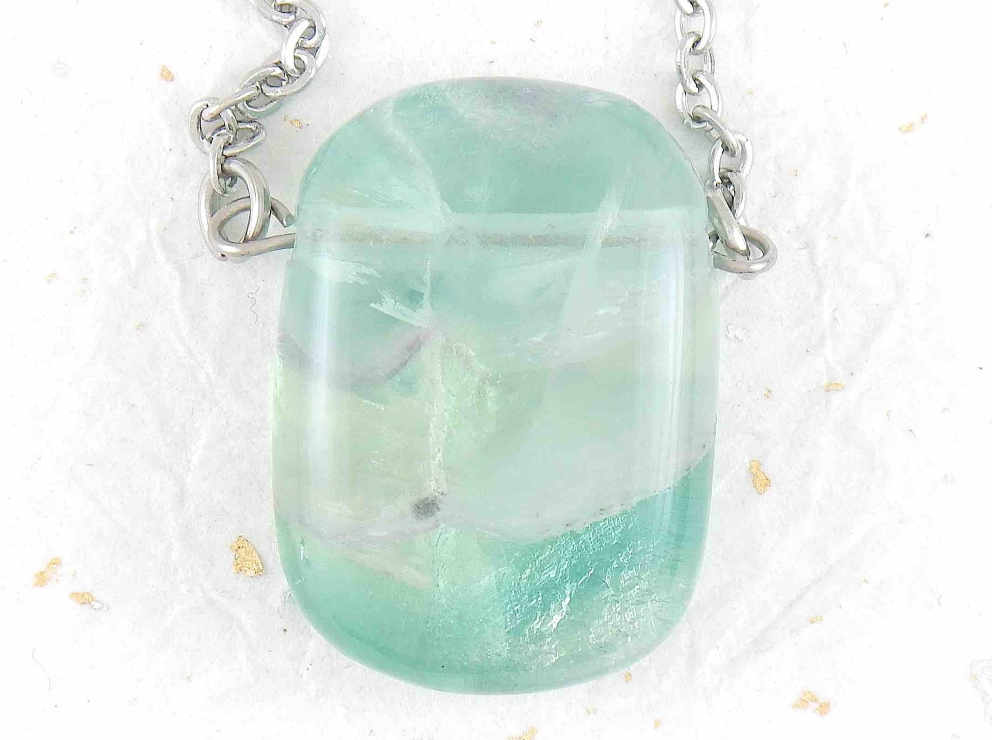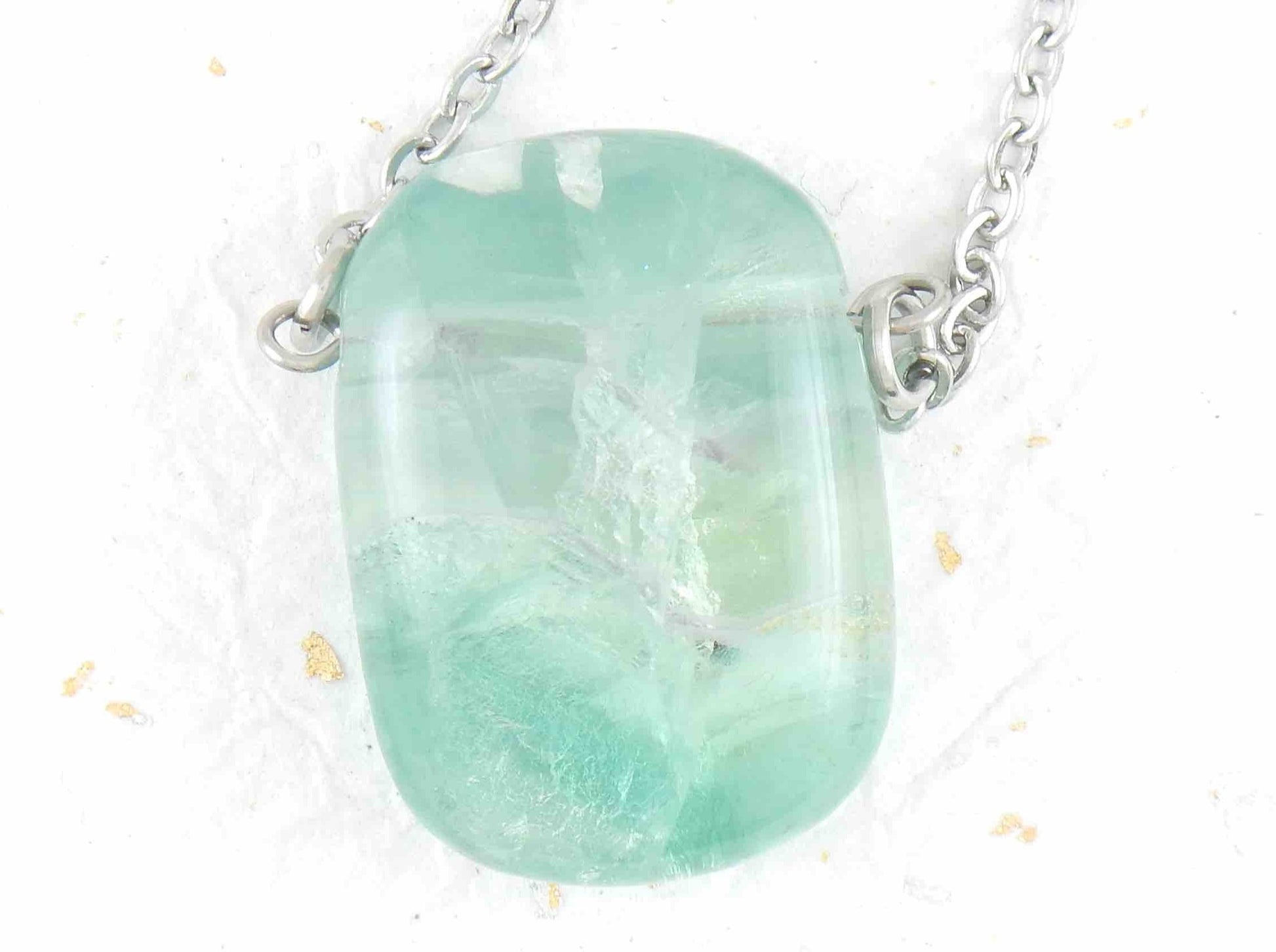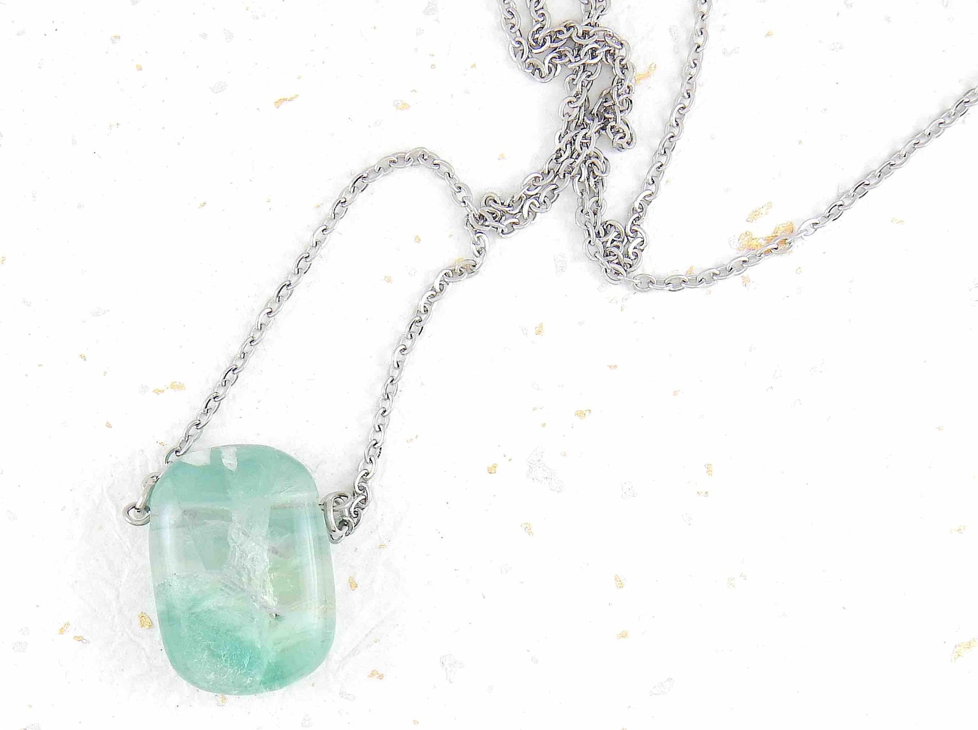 26-inch necklace with rectangular translucent light green fluorite stone pendant, stainless steel chain
