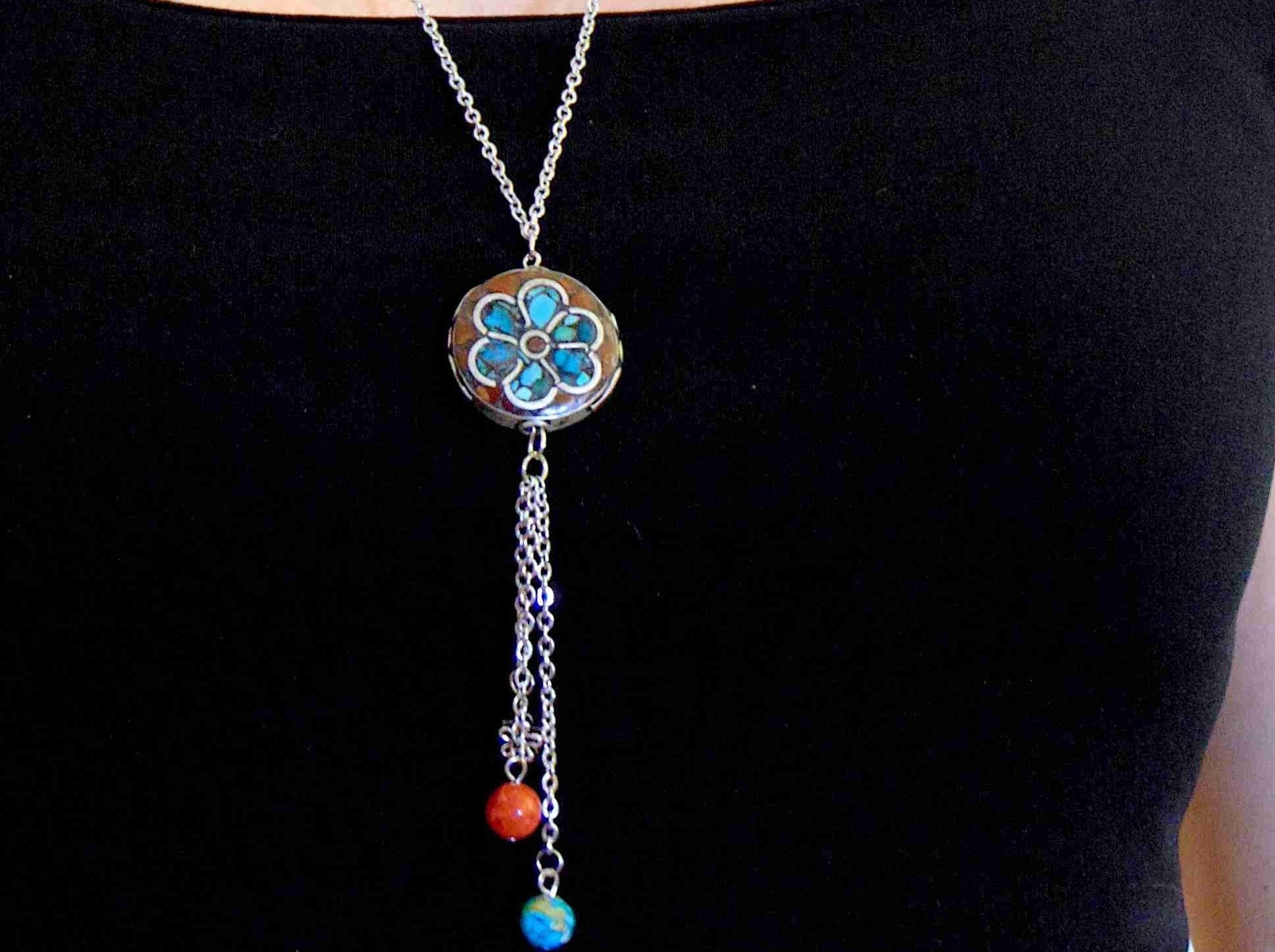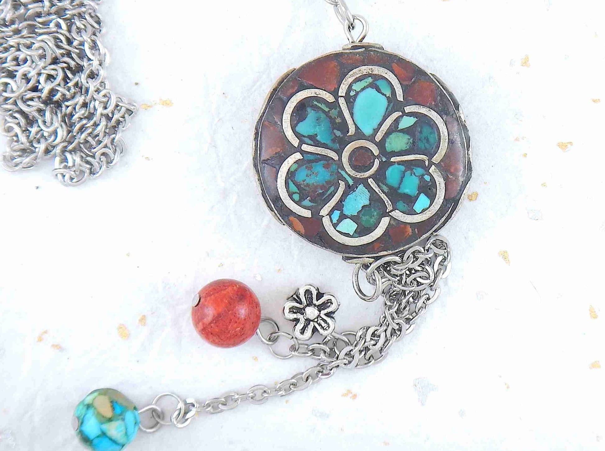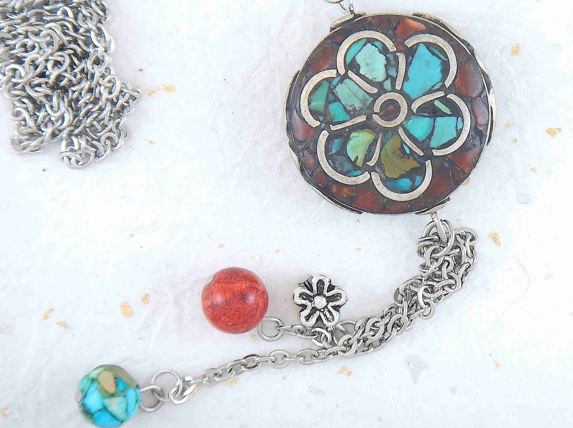 26-inch necklace with Tibetan disk, coral and turquoise mosaic in pewter, flower pattern, matching pendants, stainless steel chain