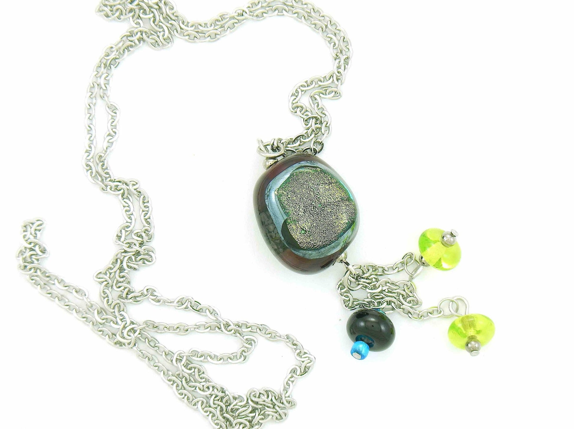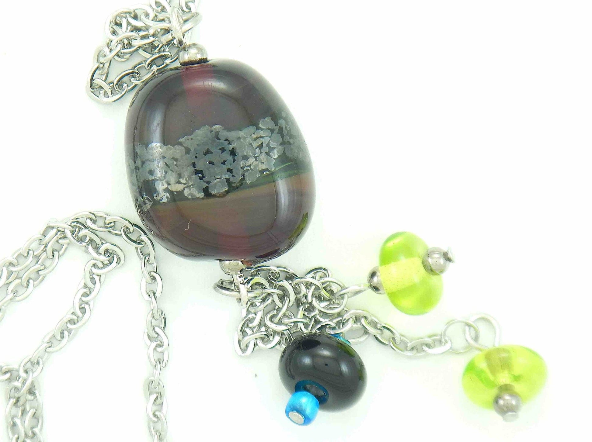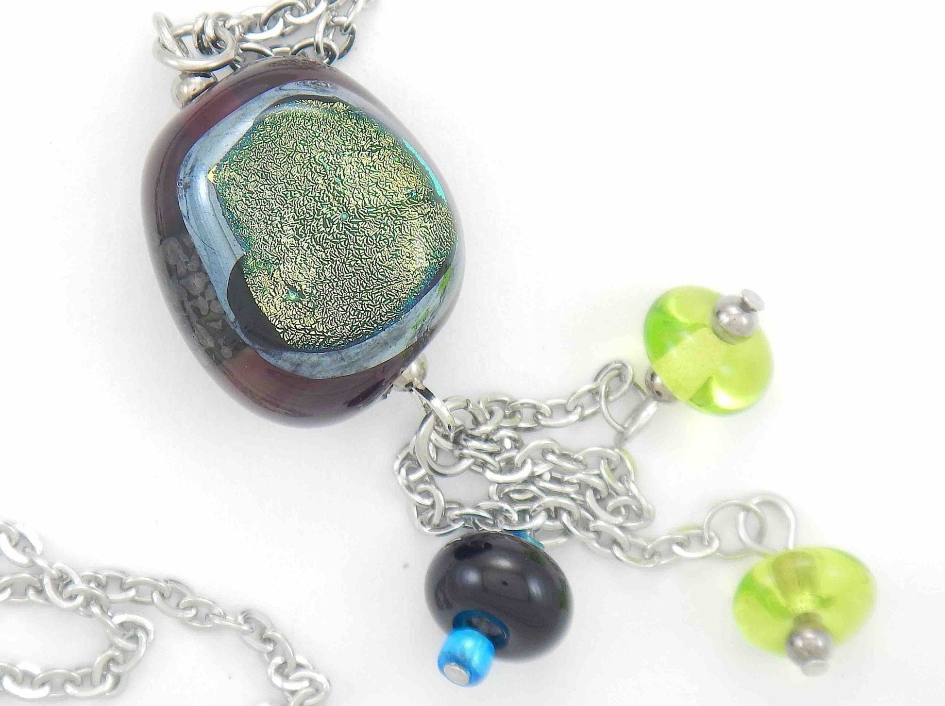 27-inch necklace with funky glass bead and matching pendants in dark red-lime green-black (Murano-style glass handmade in Montreal), stainless steel chain