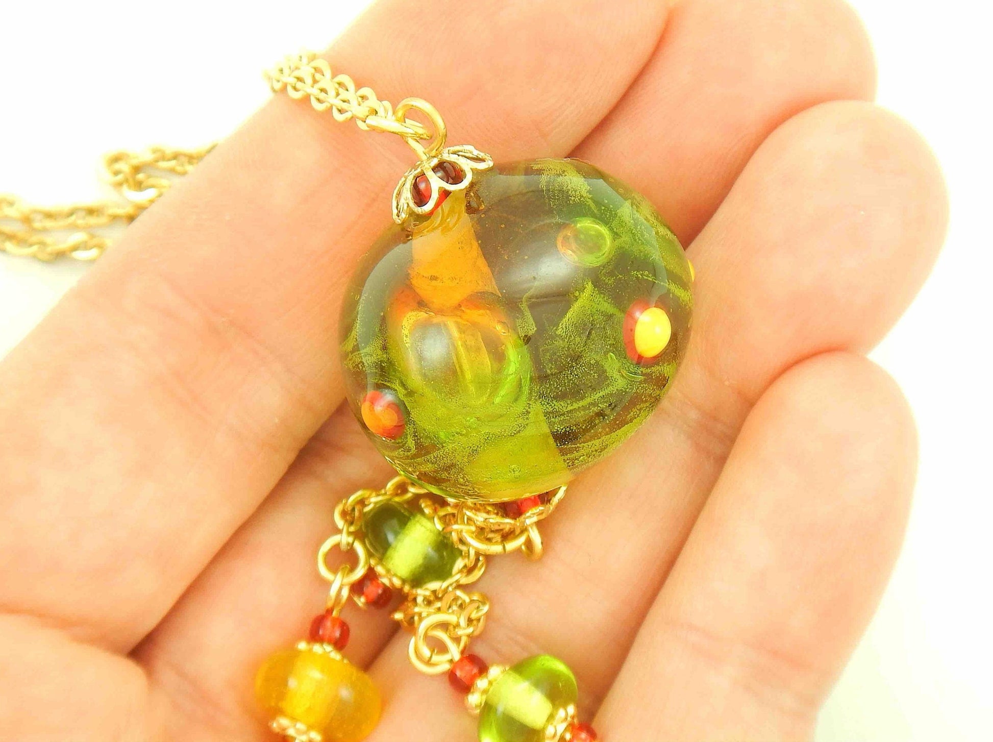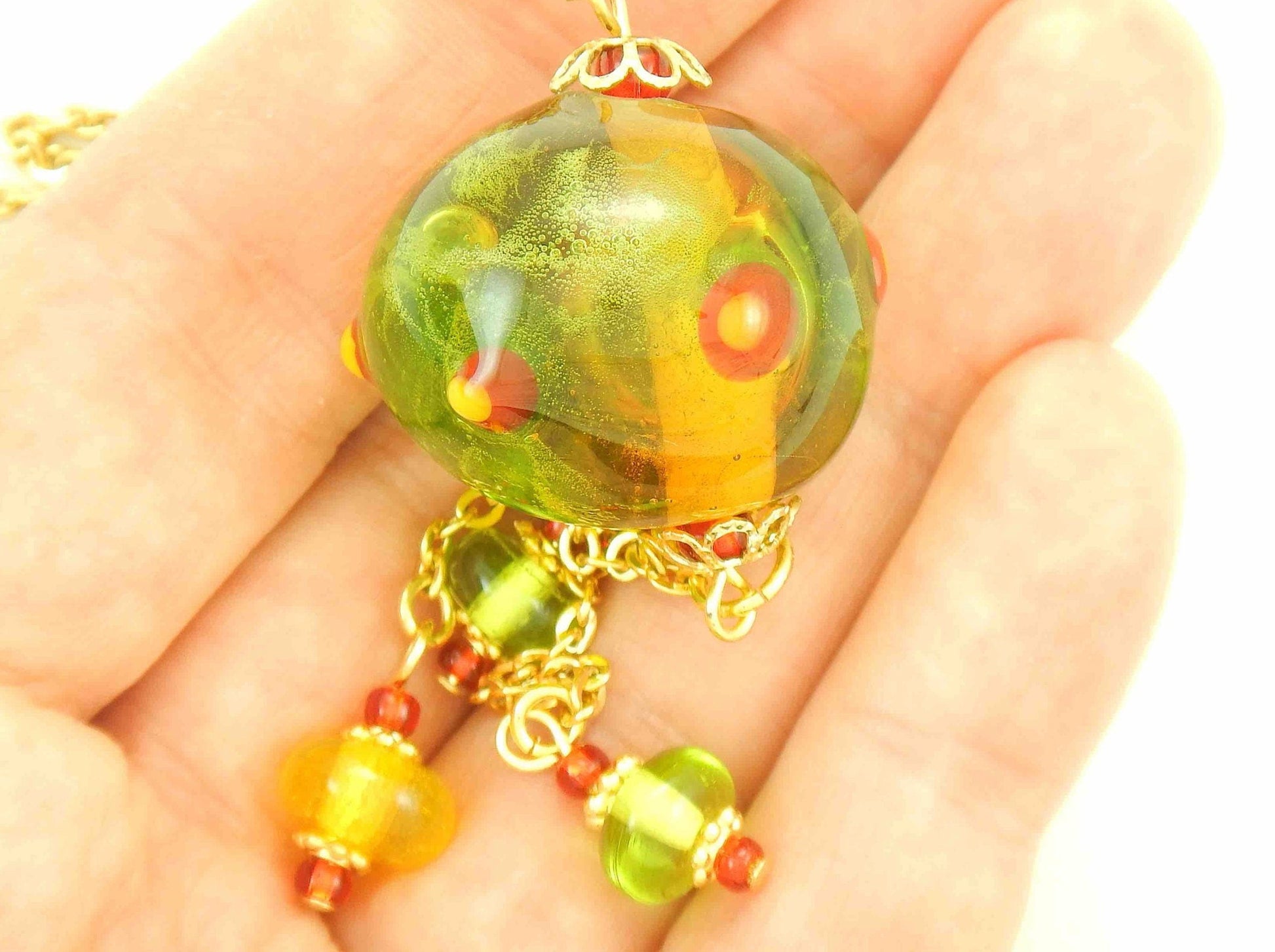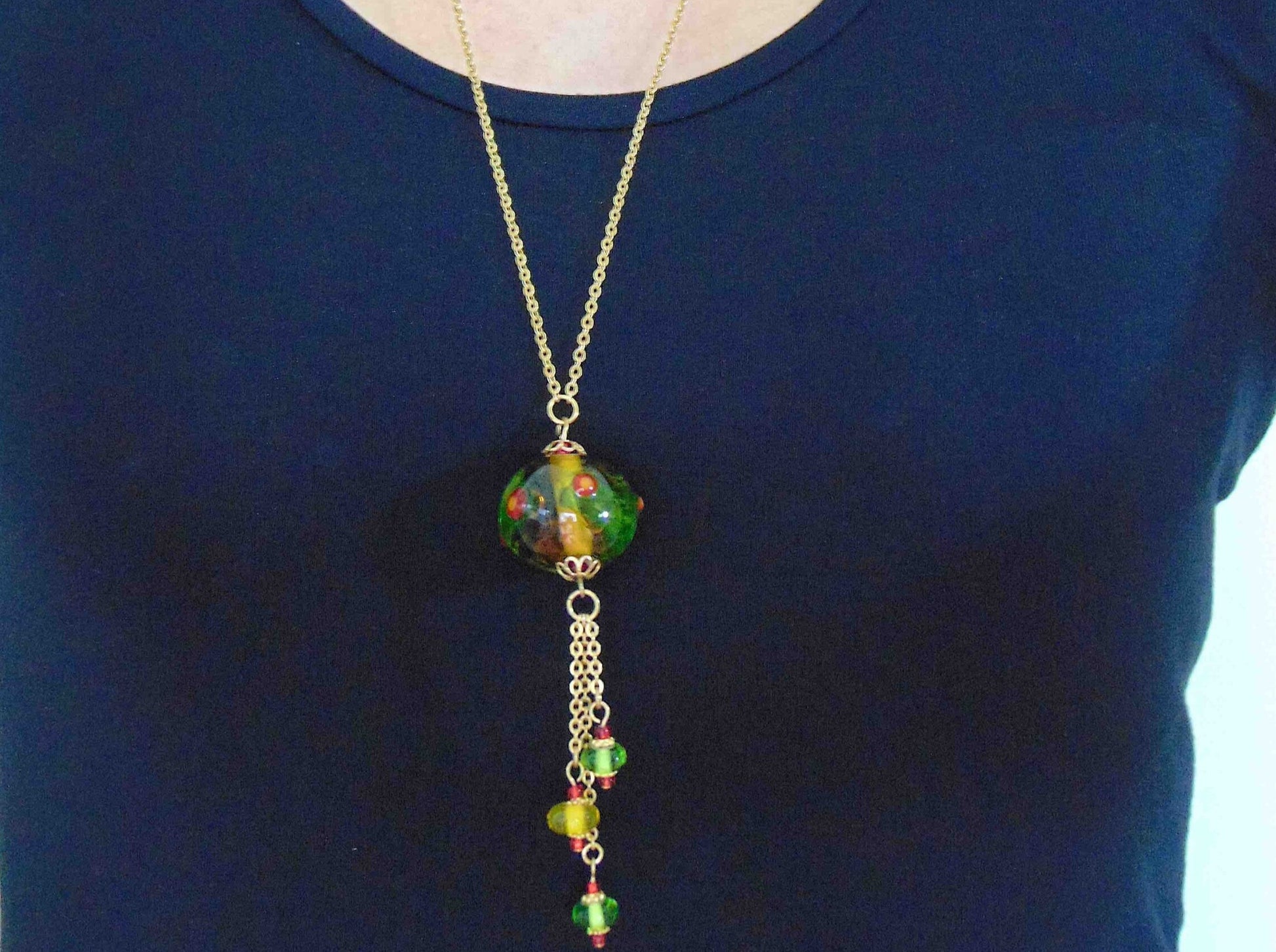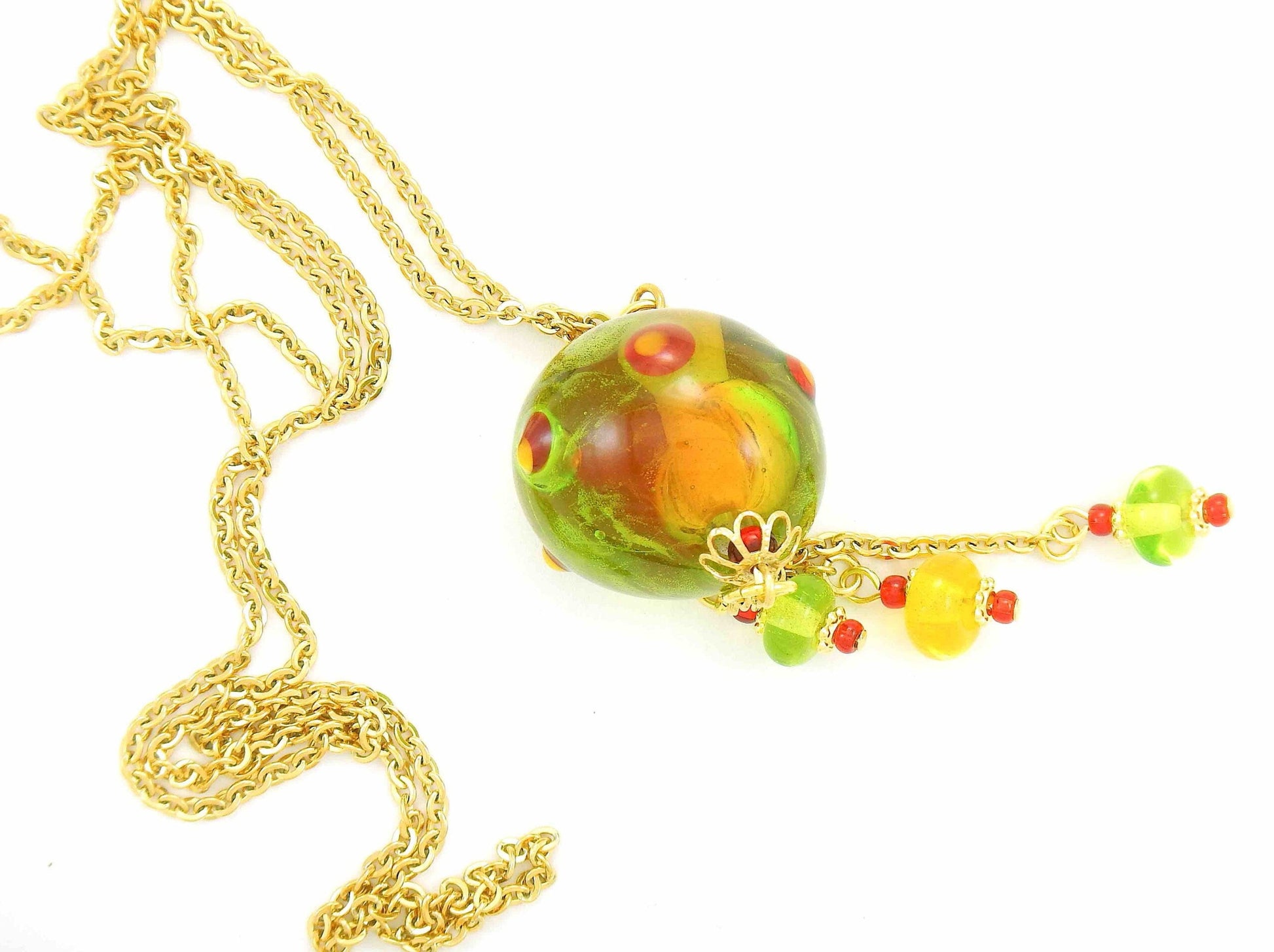 27-inch necklace with large funky glass ball and matching pendants in lime green-red-yellow (Murano-style glass handmade in Montreal), dots and bubbles, gold-toned stainless steel chain