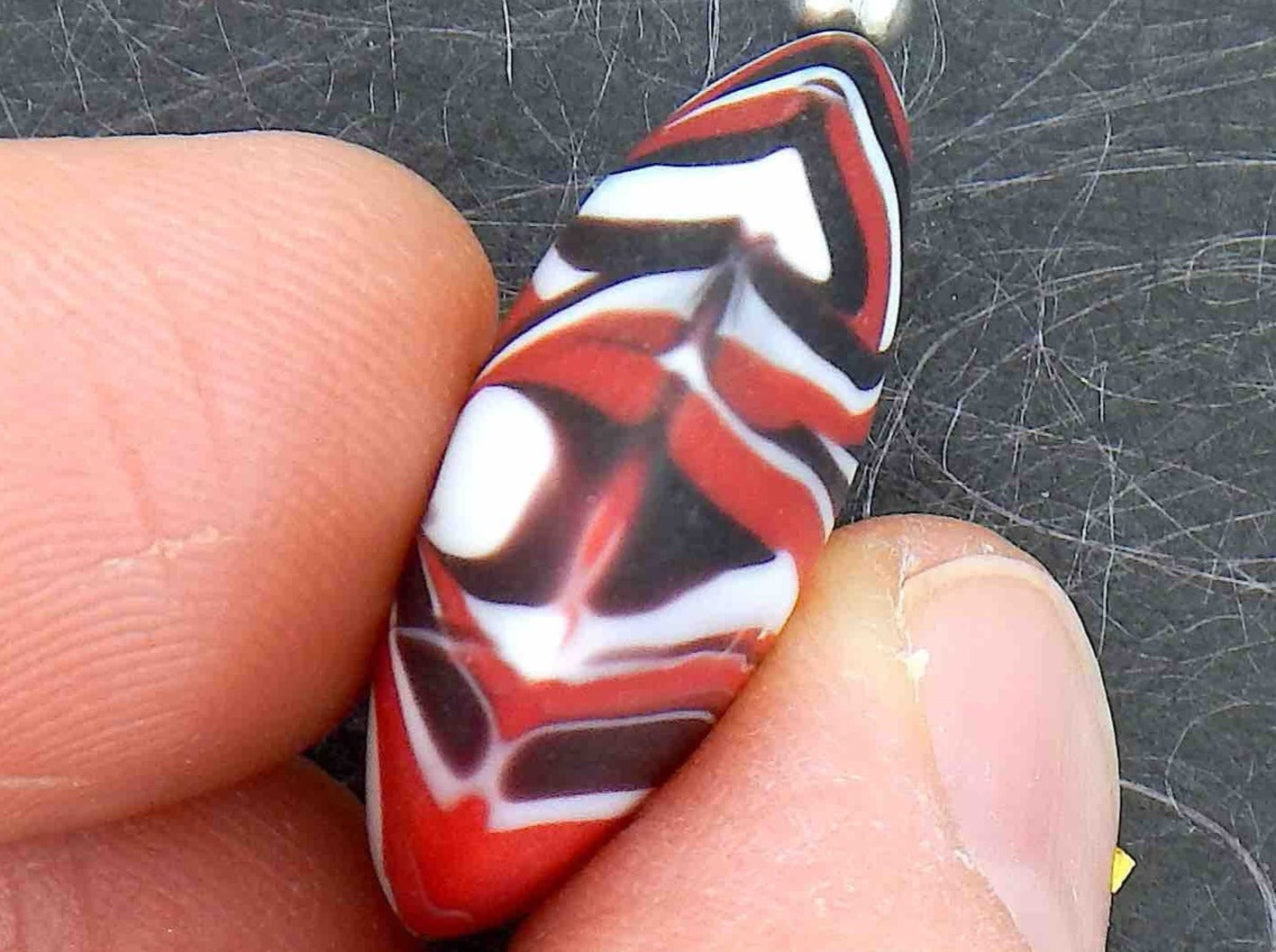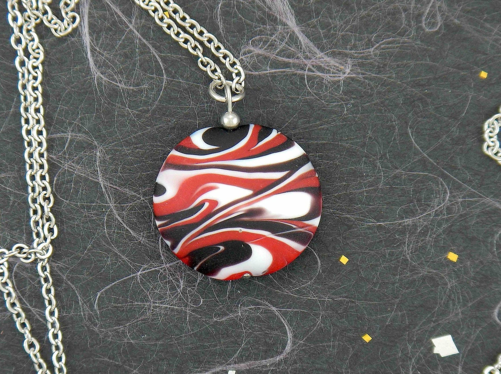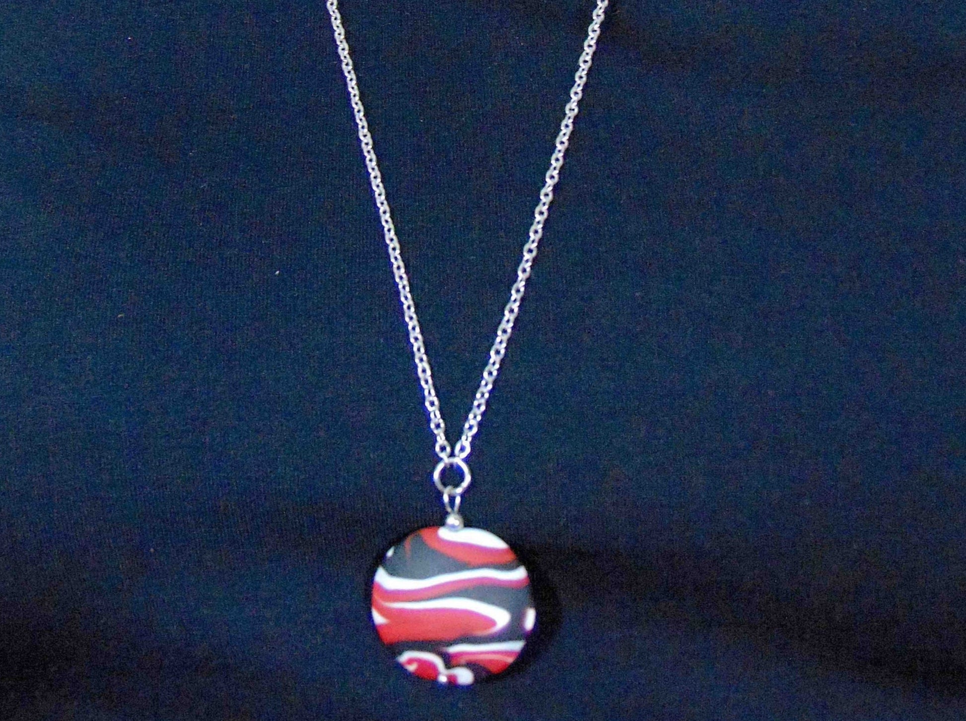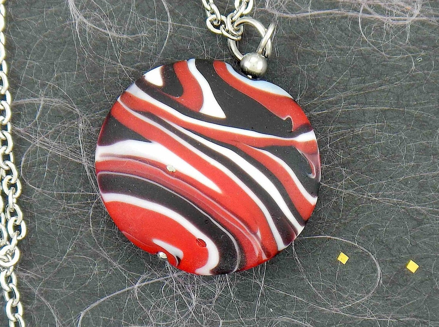 29-inch necklace with matte plump Murano glass disc, marbled in red-black-white, stainless steel chain