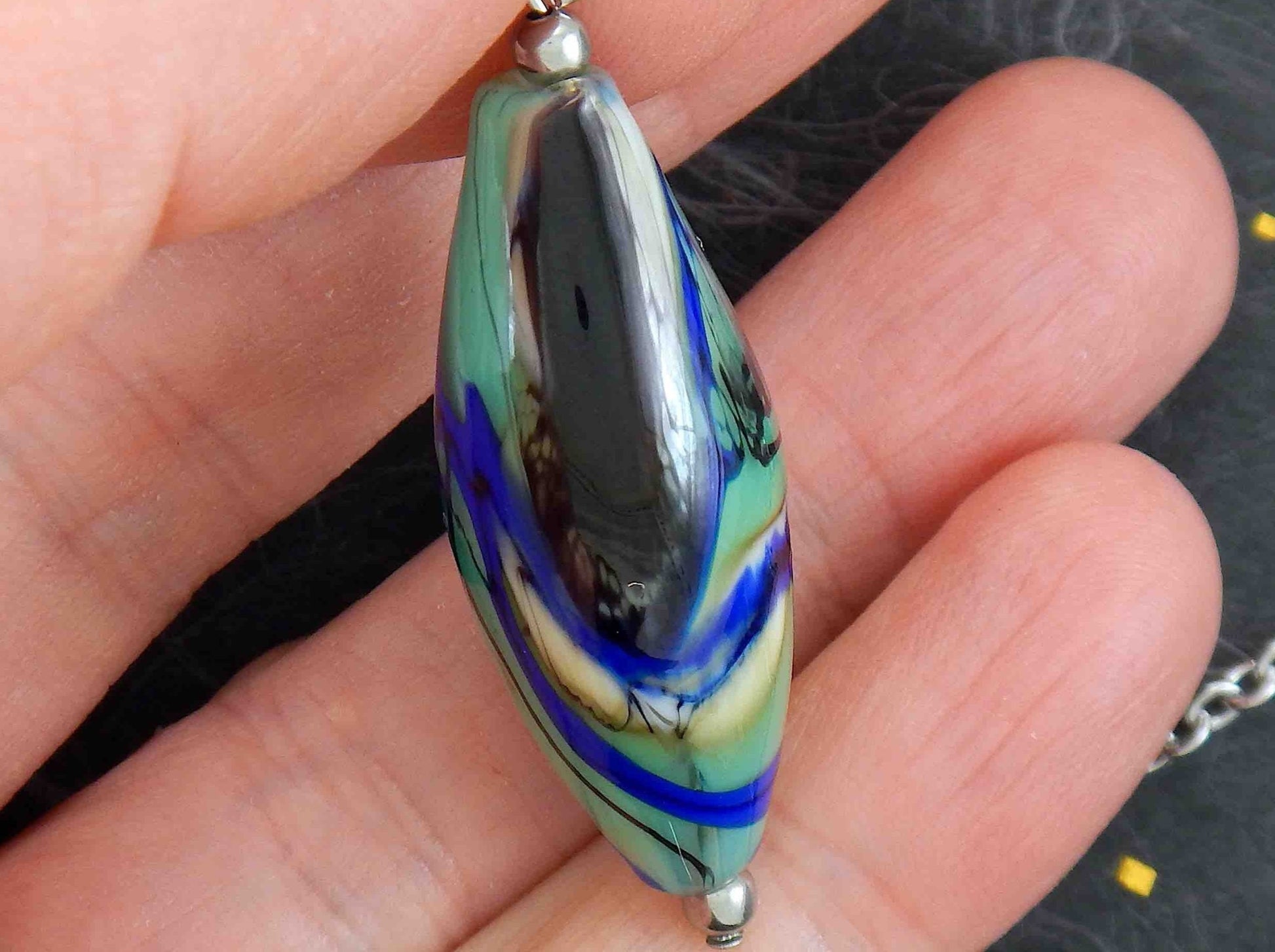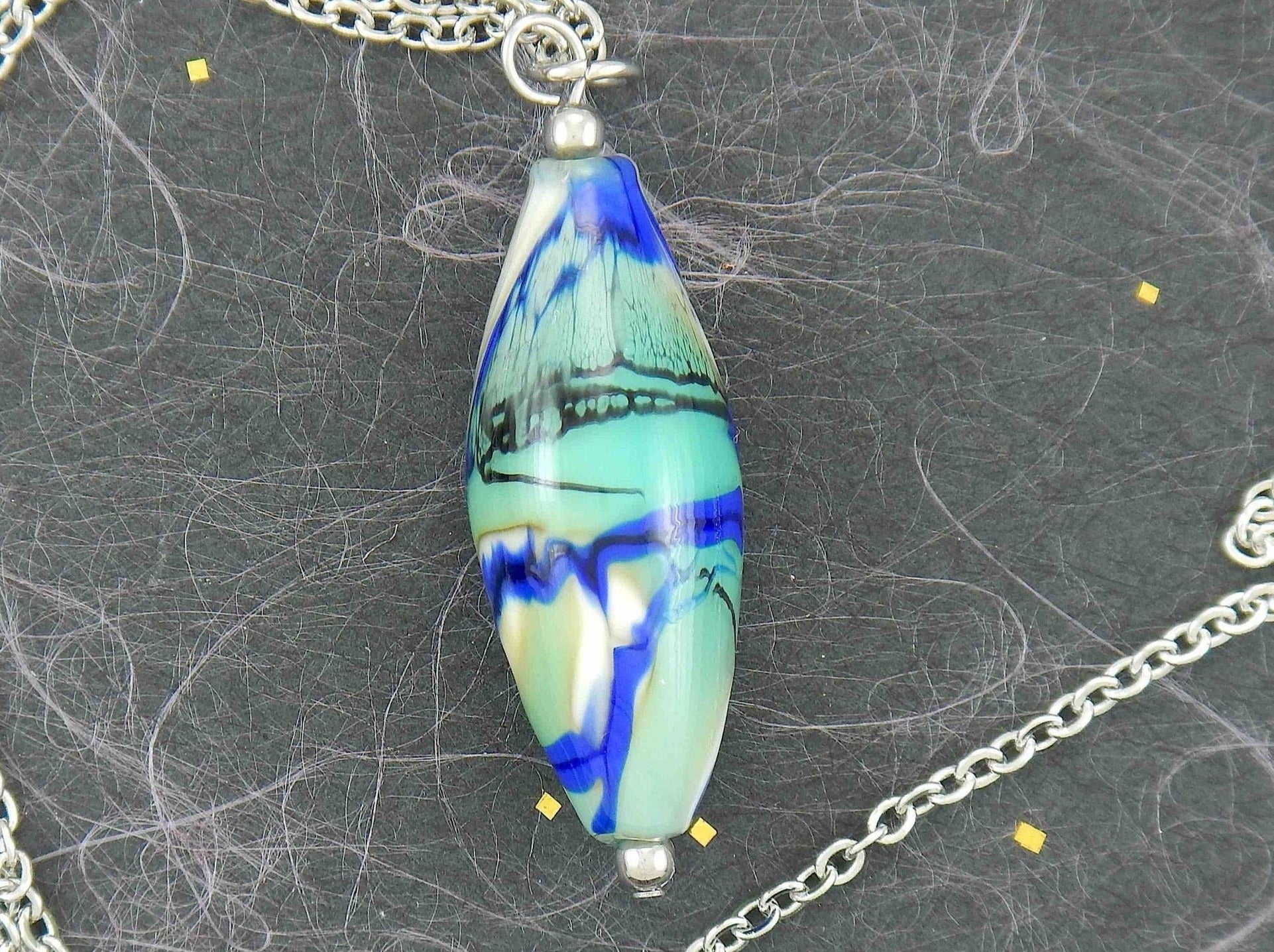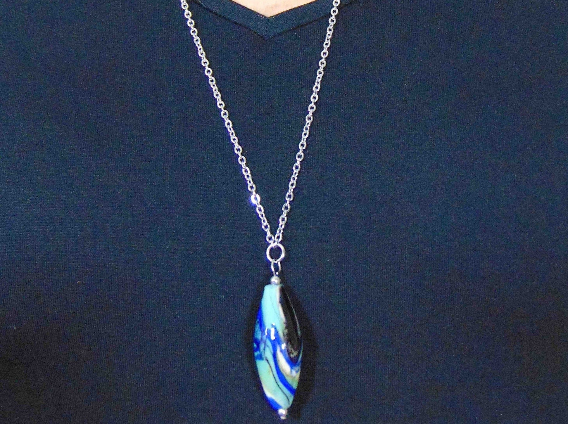 29-inch necklace with Murano glass pointed cylinder marbled in dark blue, light green, black and white, stainless steel chain
