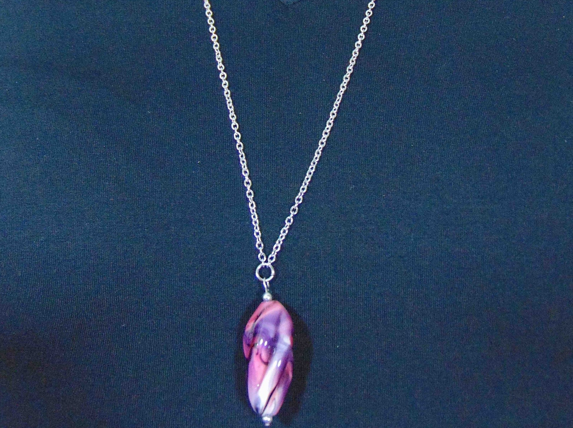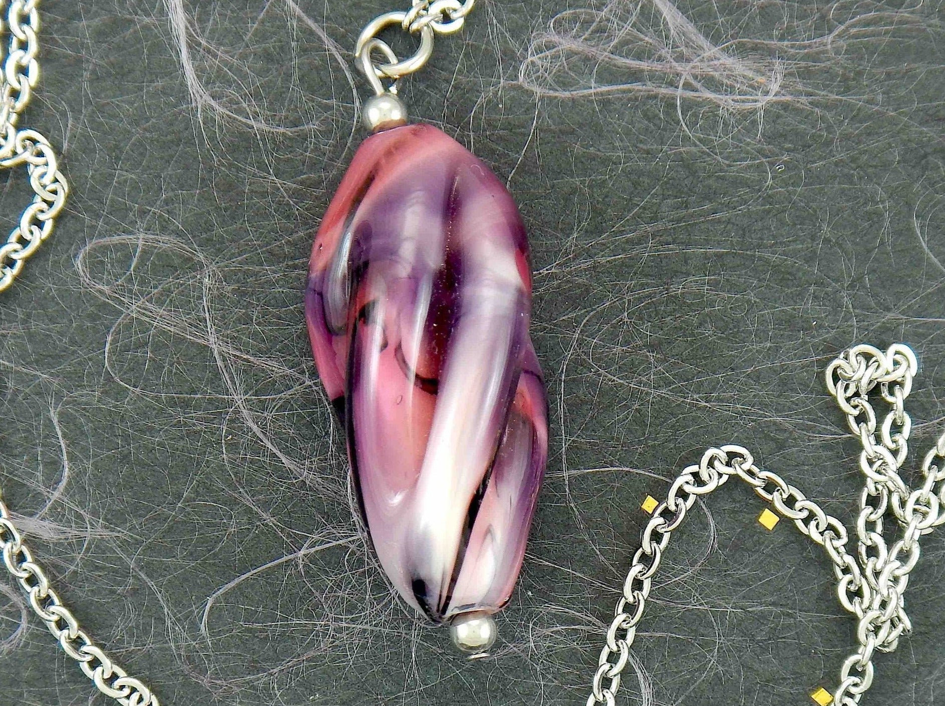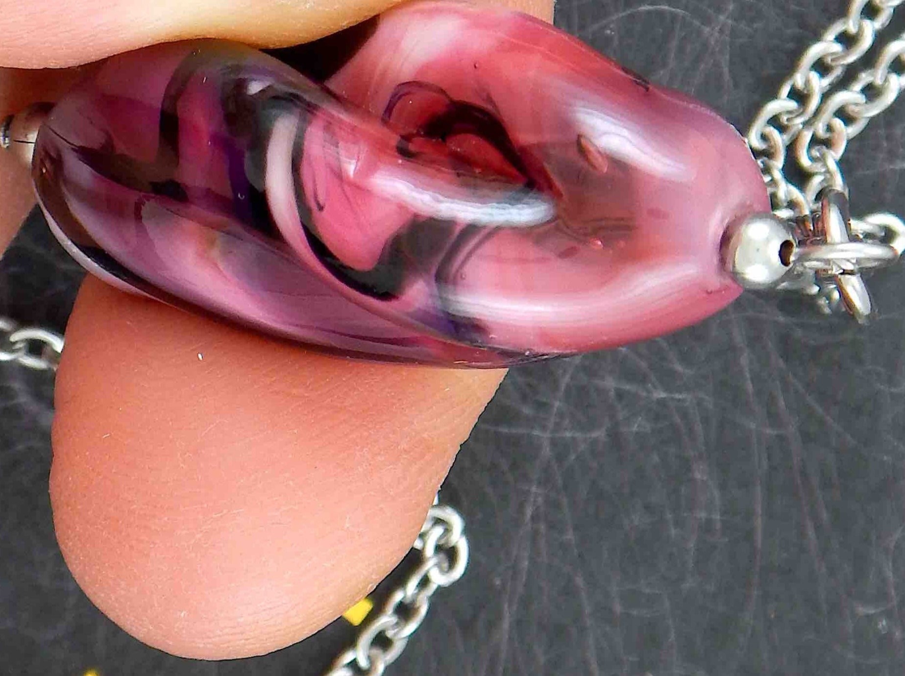 29-inch necklace with twisted Murano glass cylinder marbled in pink, black and white, stainless steel chain