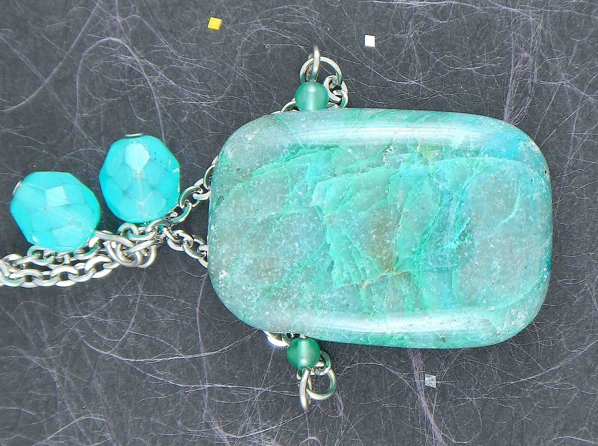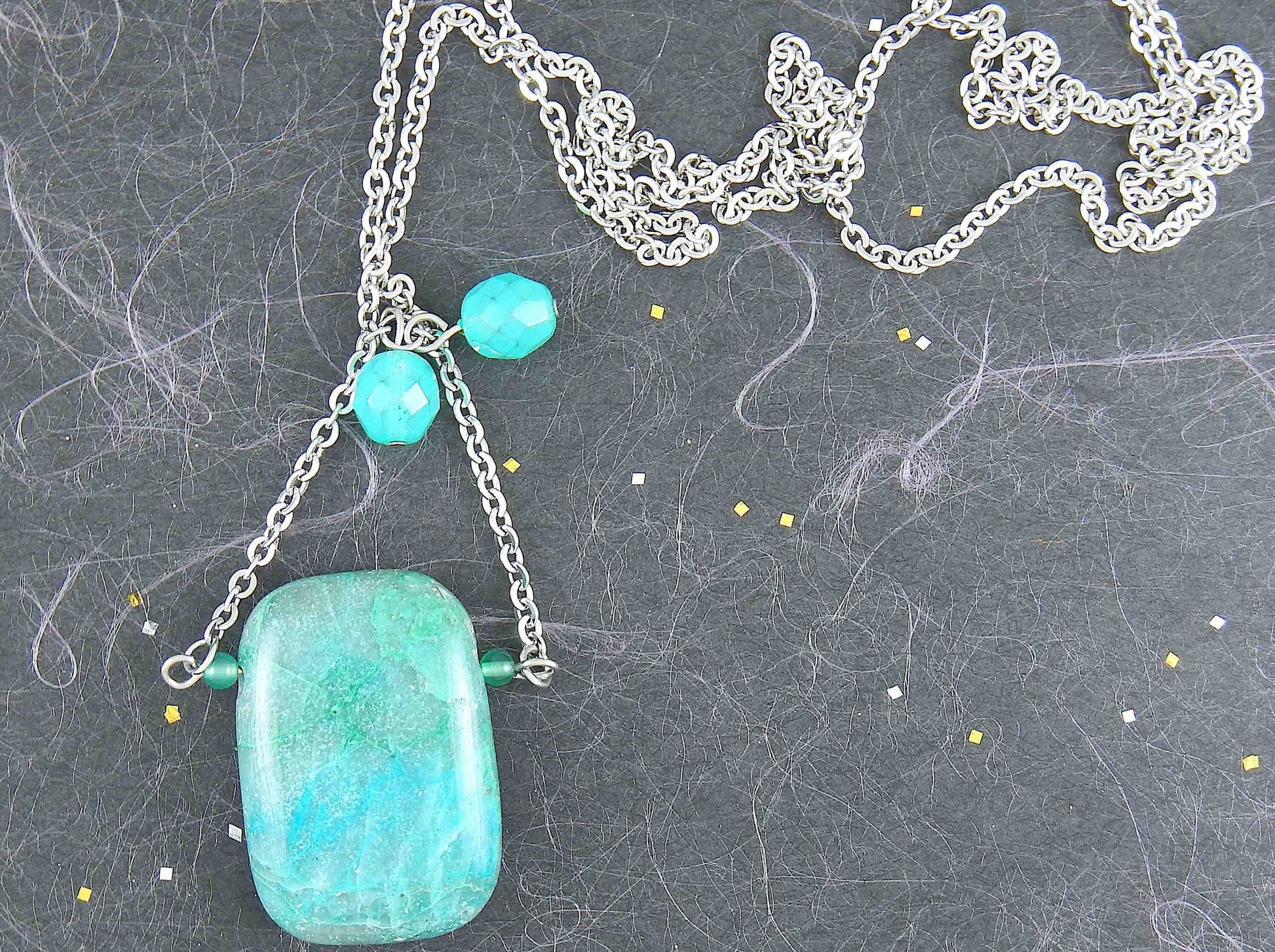 30-inch necklace with large rectangular blue-green chrysocolla stone pendant, triangular layout, matching glass beads, stainless steel chain