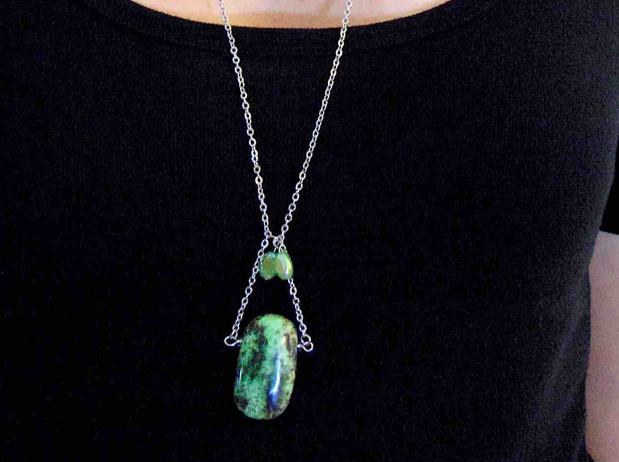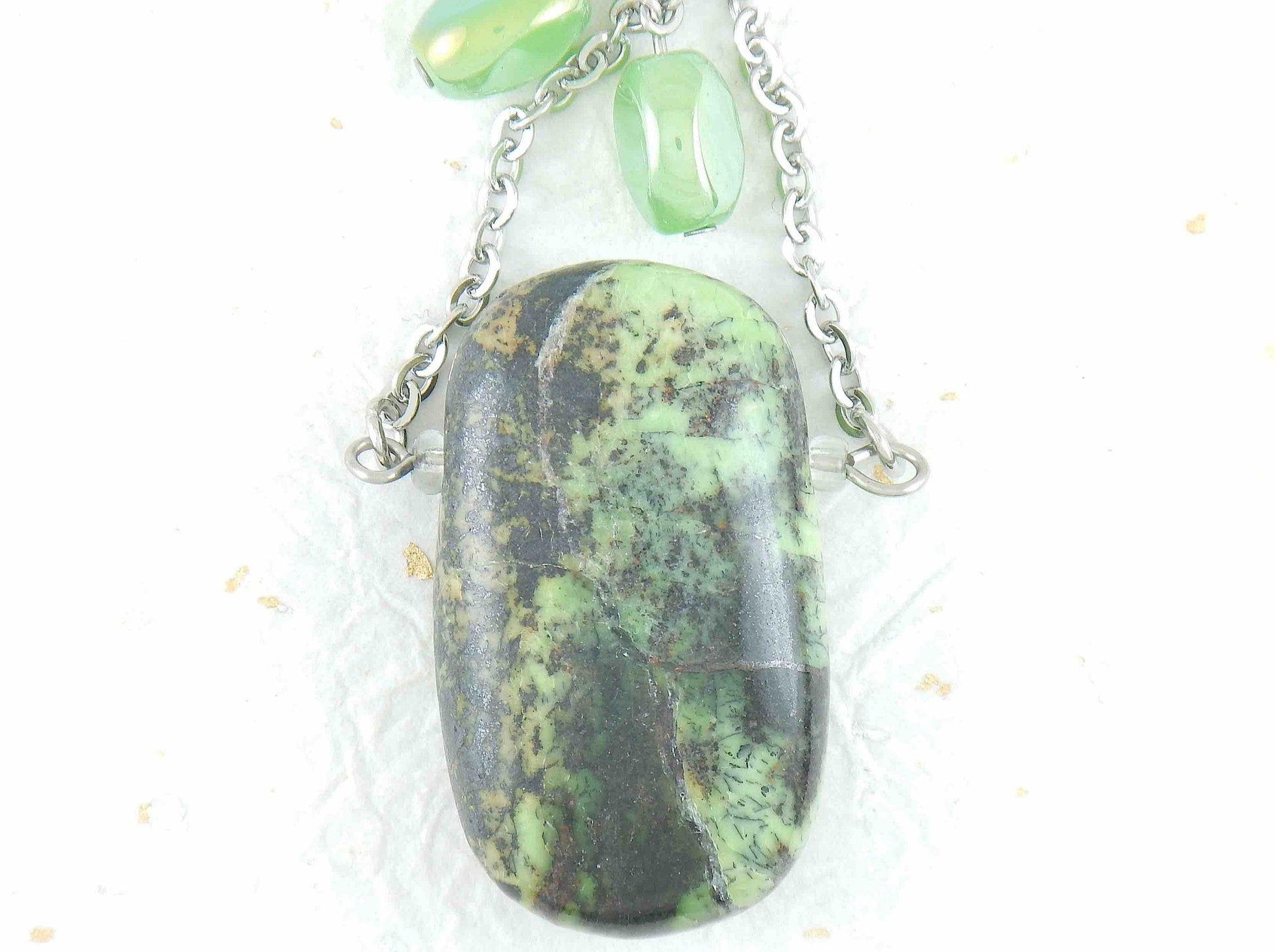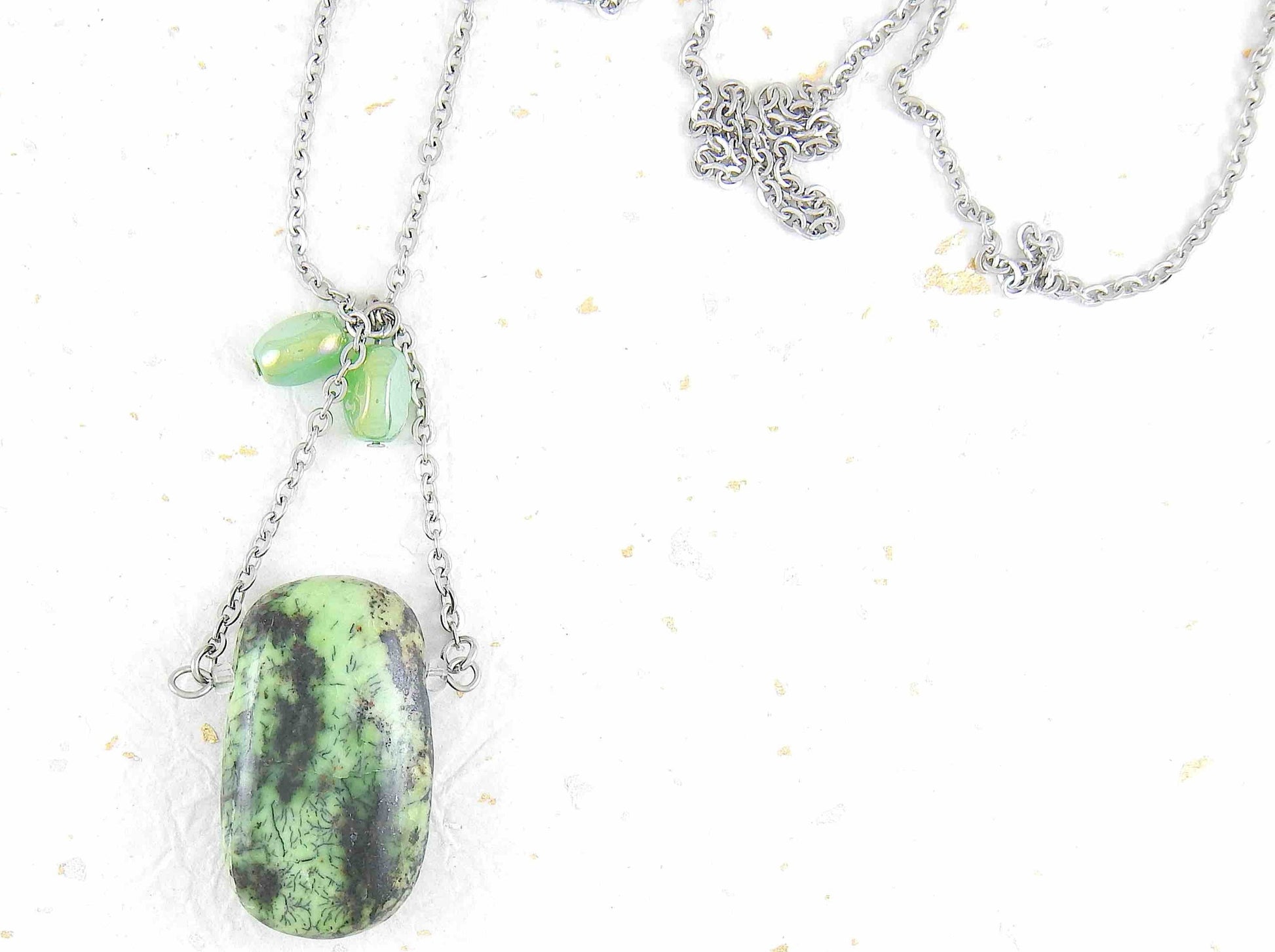 30-inch necklace with large rectangular light green and black chrysoprase stone pendant, triangular layout, matching glass beads, stainless steel chain