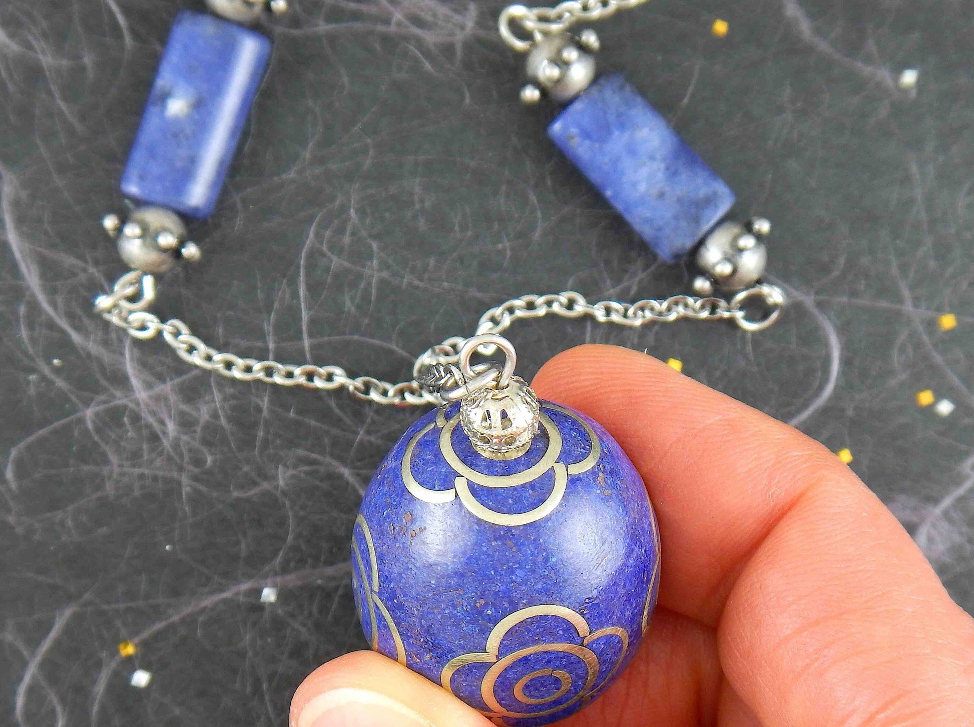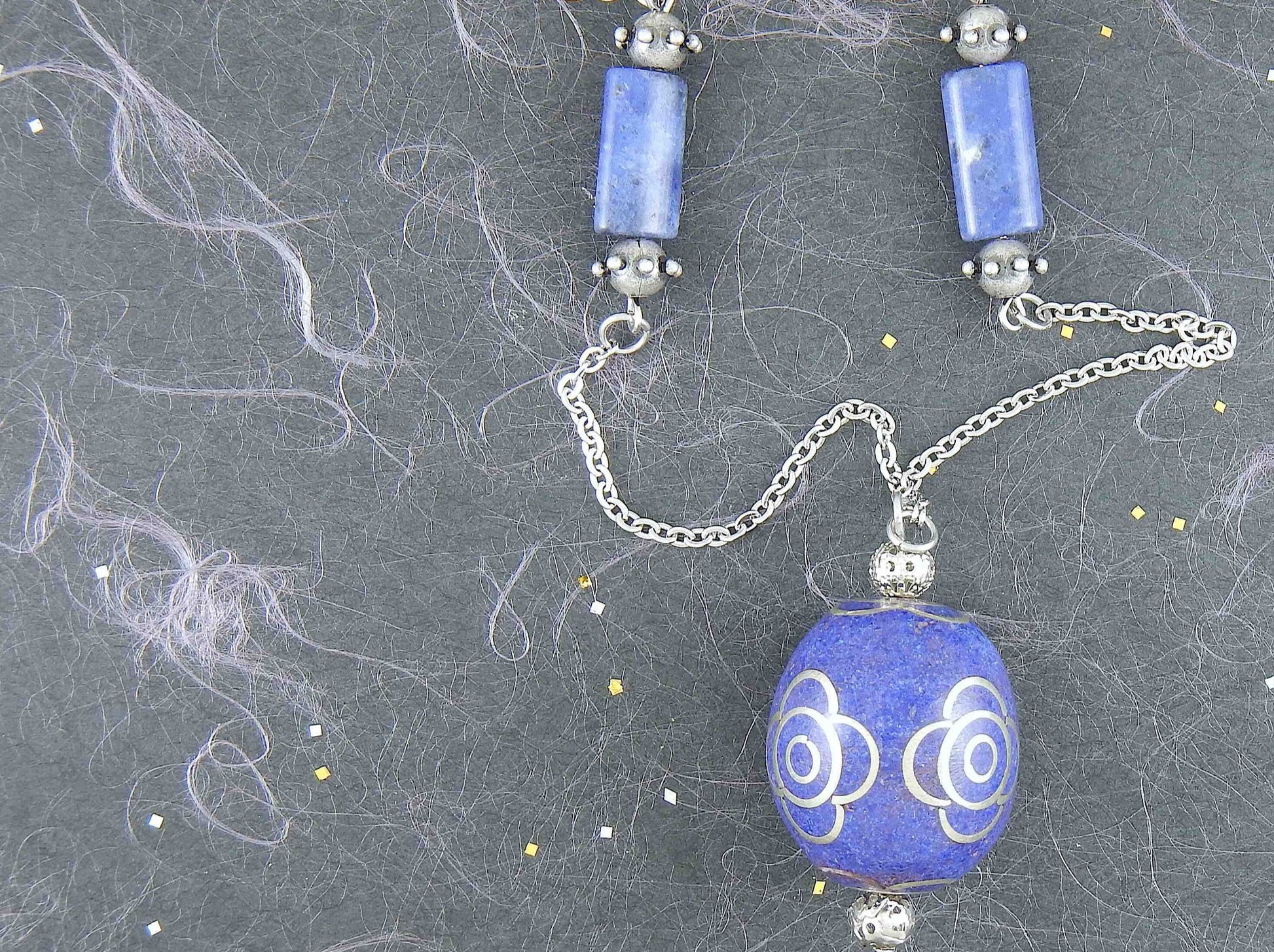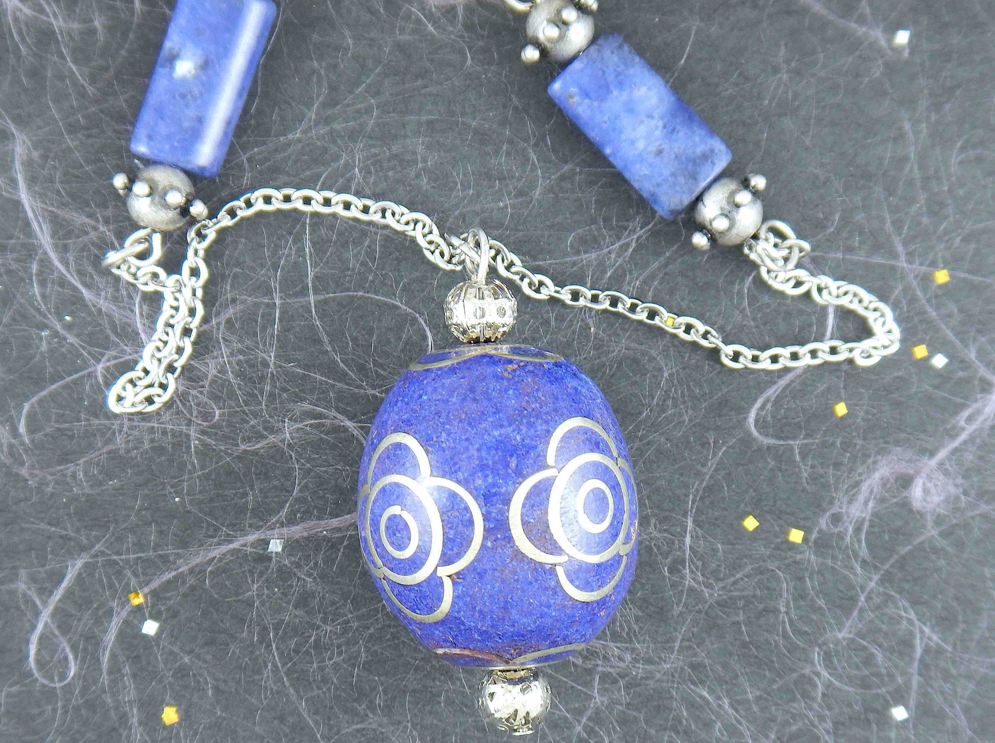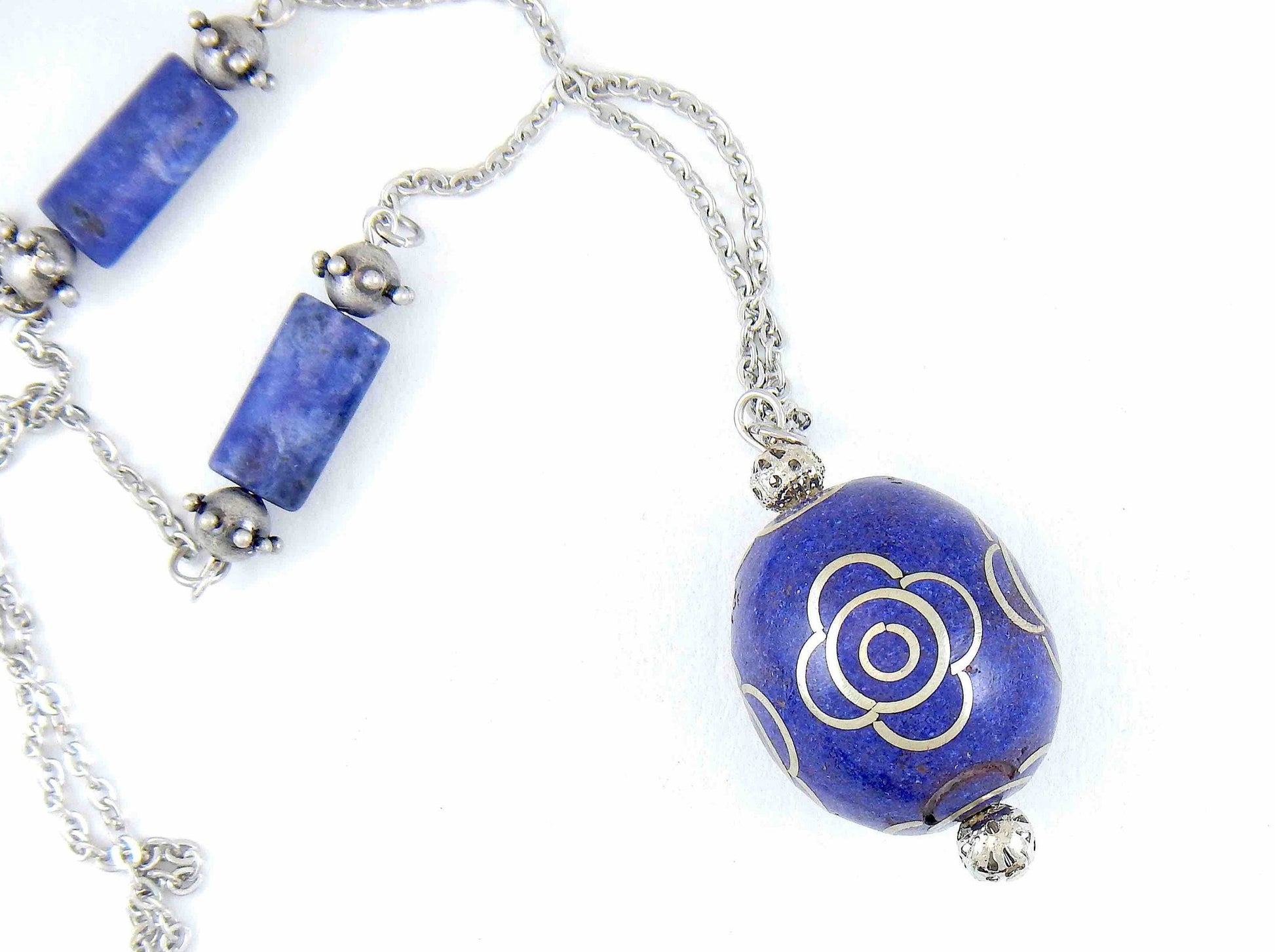 31-inch necklace with deep indigo blue egg-shaped resin Tibetan bead, pewter flower details, sodalite, stainless steel chain
