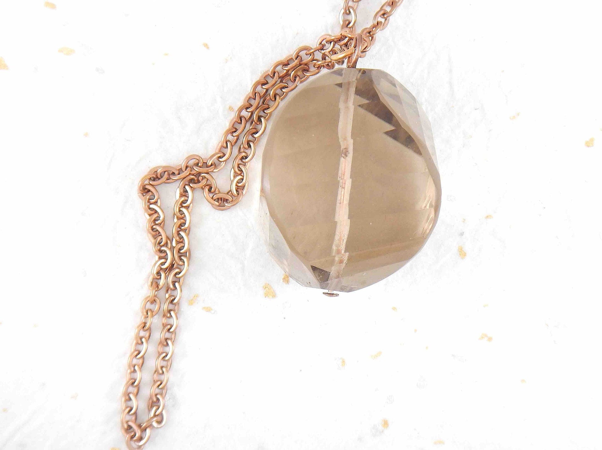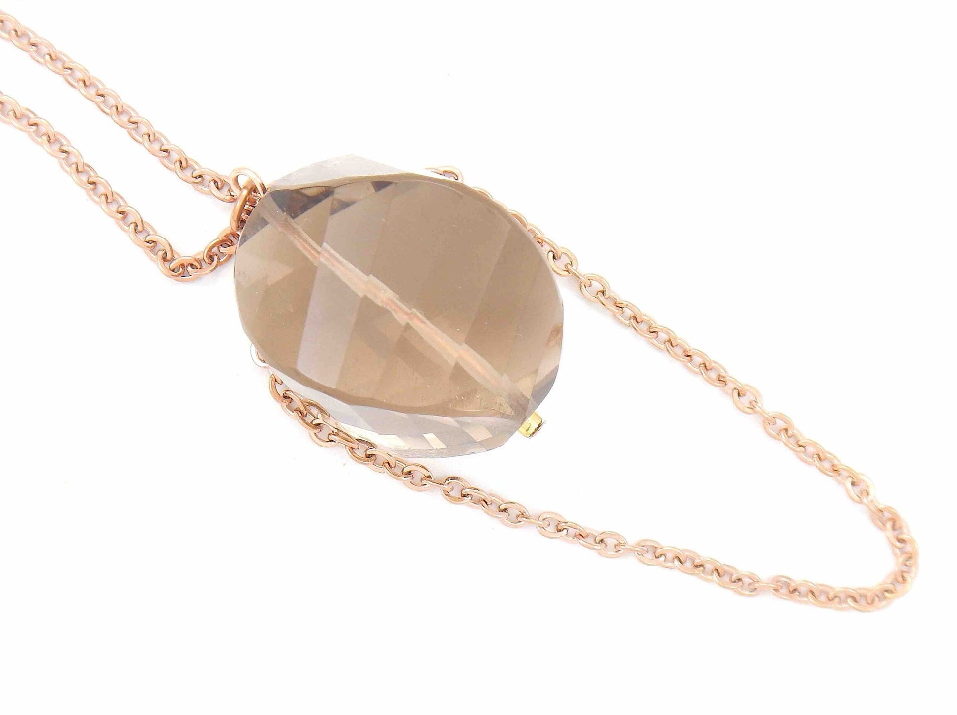 31-inch necklace with smoky quartz stone pendant, 4 profiled and faceted faces, rose gold-toned stainless steel chain