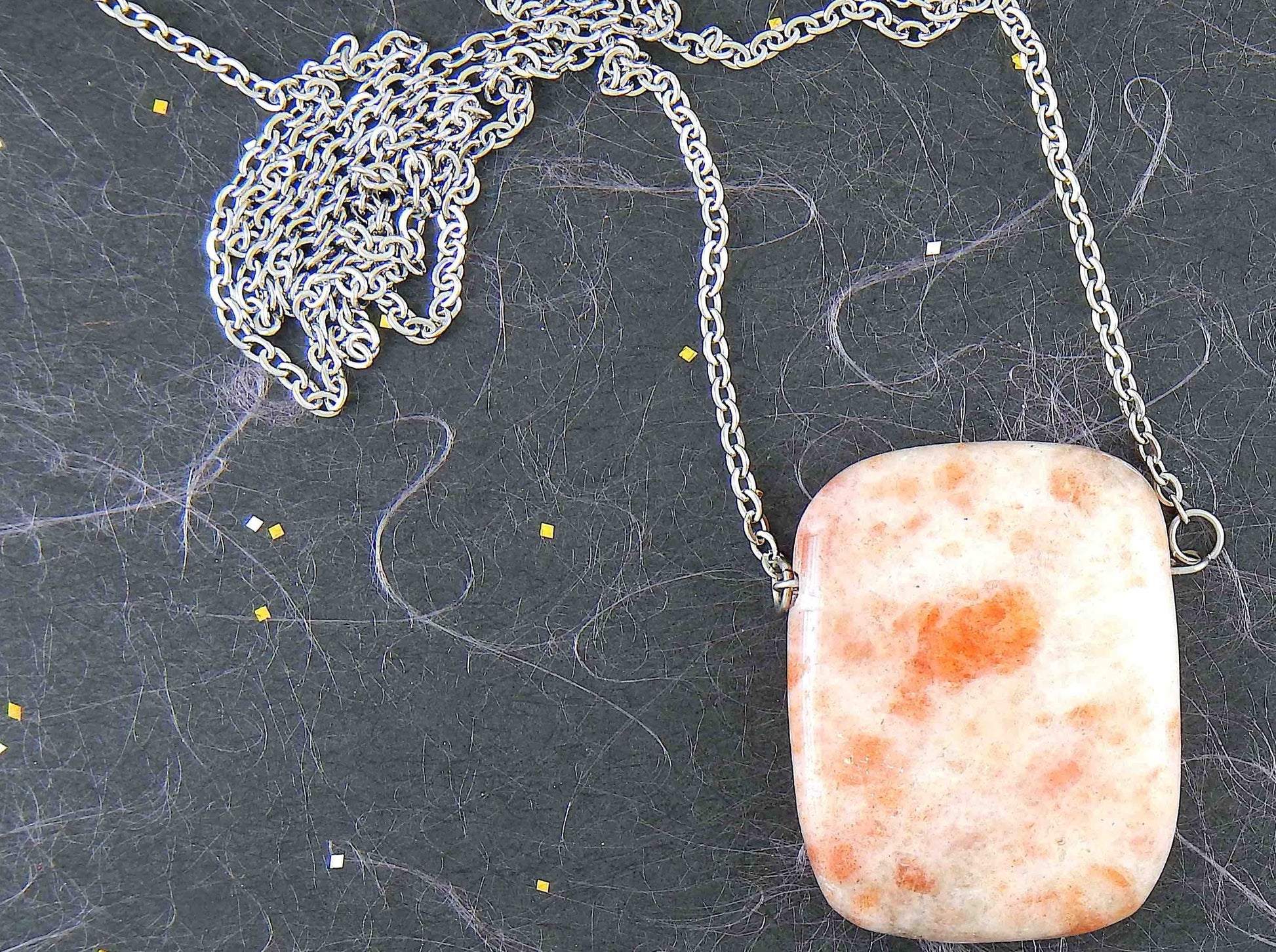 33-inch necklace with smooth rectangular white and rose gold sunstone pendant, stainless steel chain