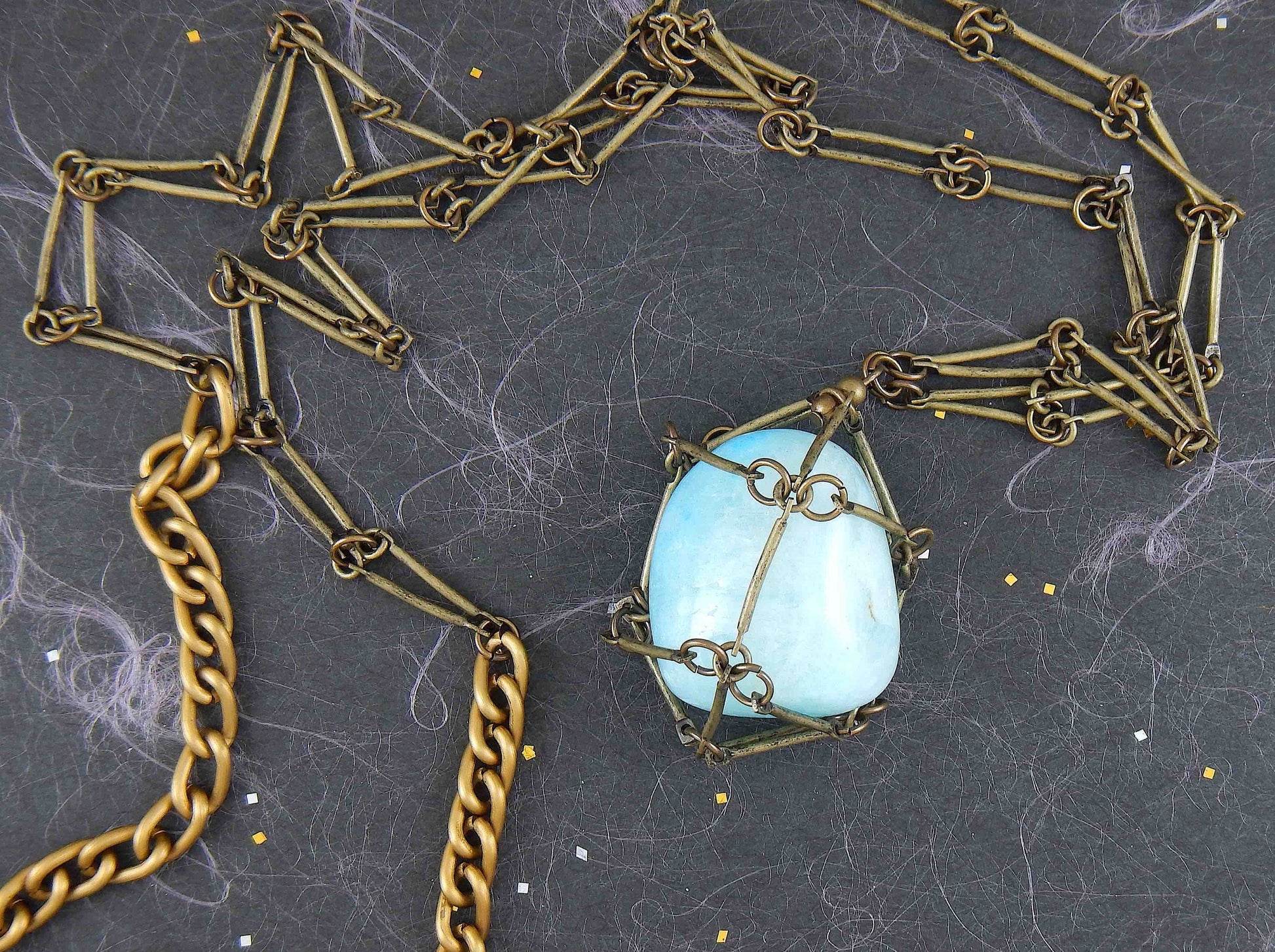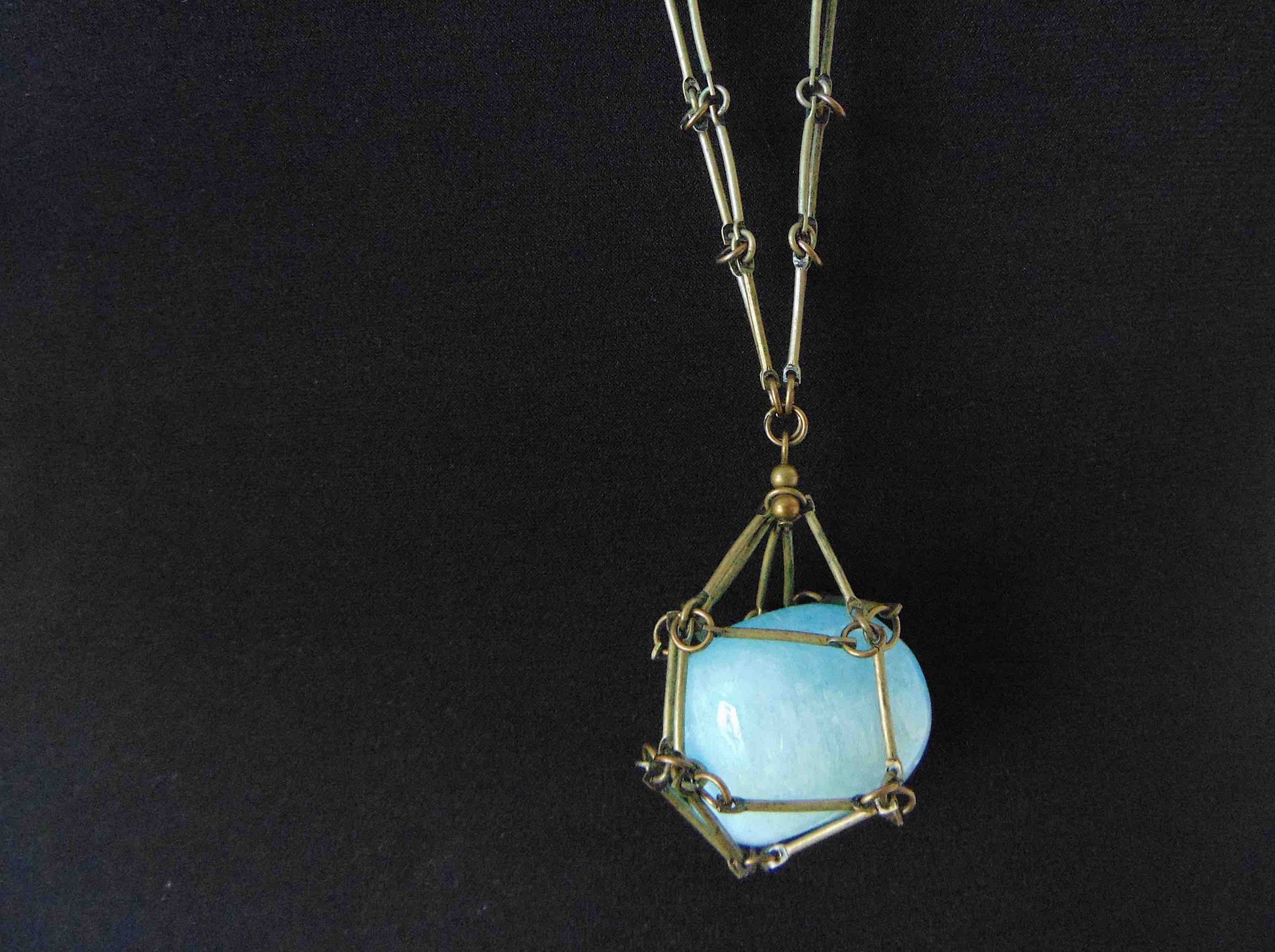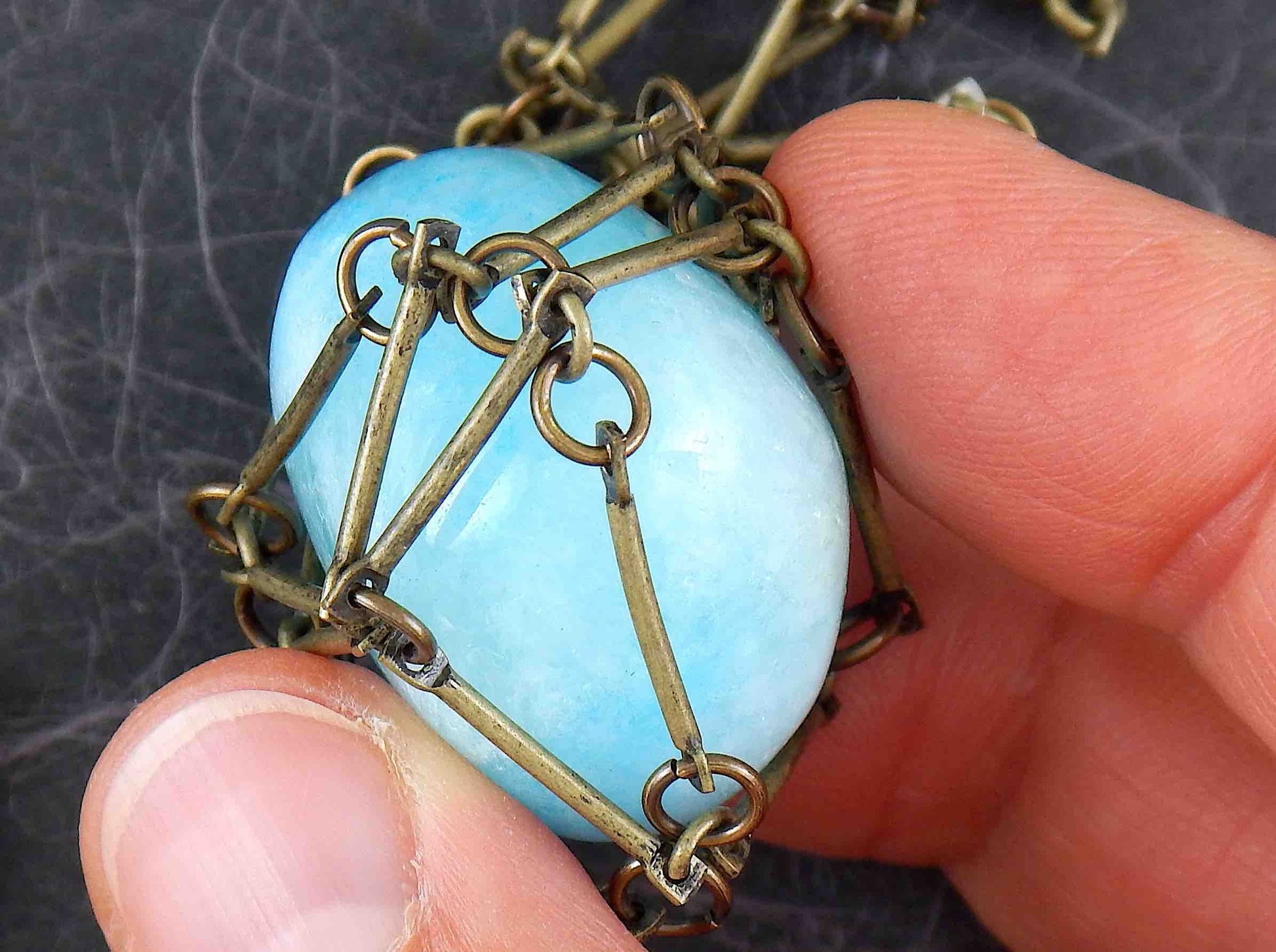 36-inch necklace with large aquamarine nugget caged in brass link bar chain, brass-toned matte aluminum chain