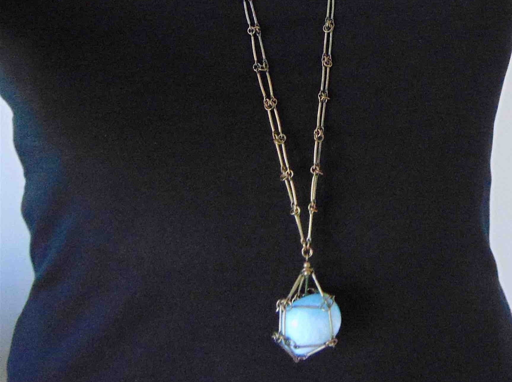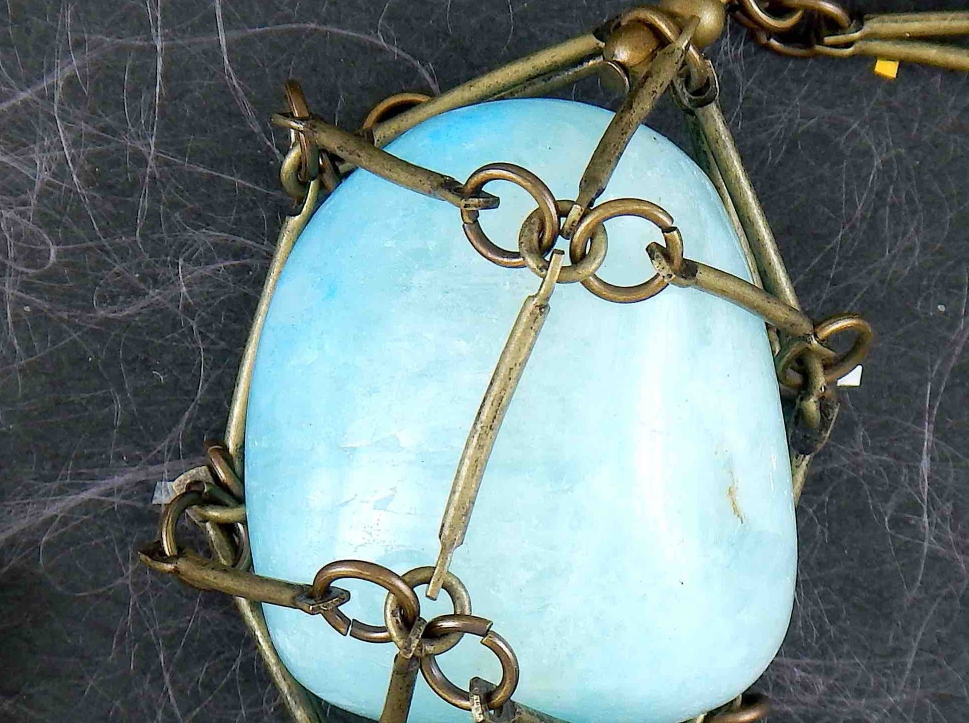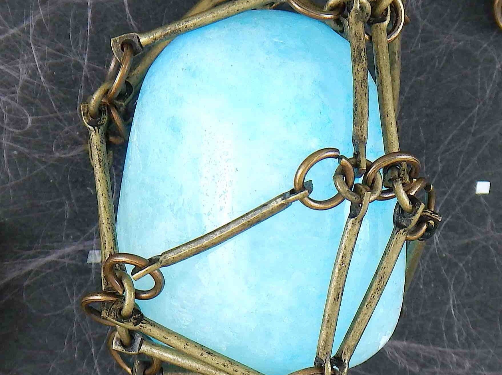 36-inch necklace with large aquamarine nugget caged in brass link bar chain, brass-toned matte aluminum chain