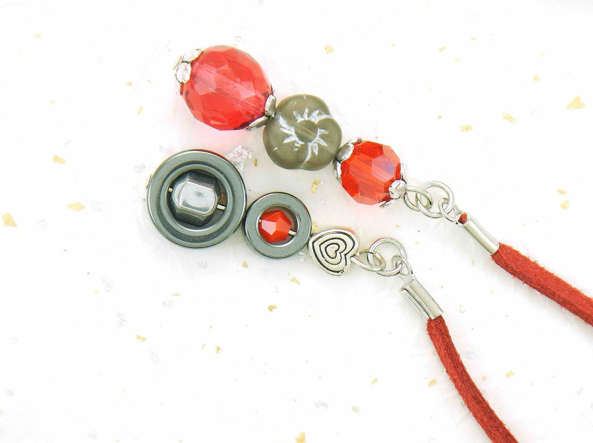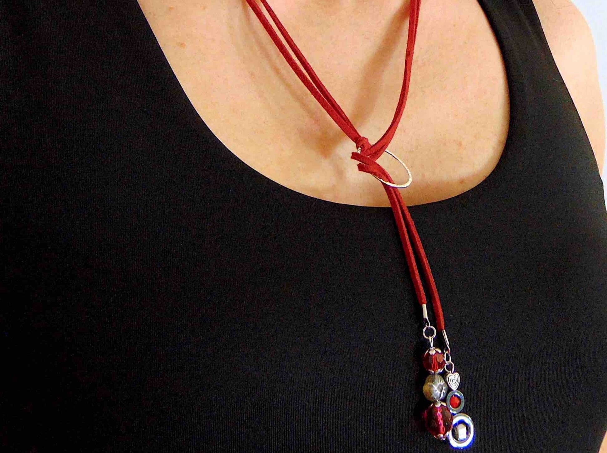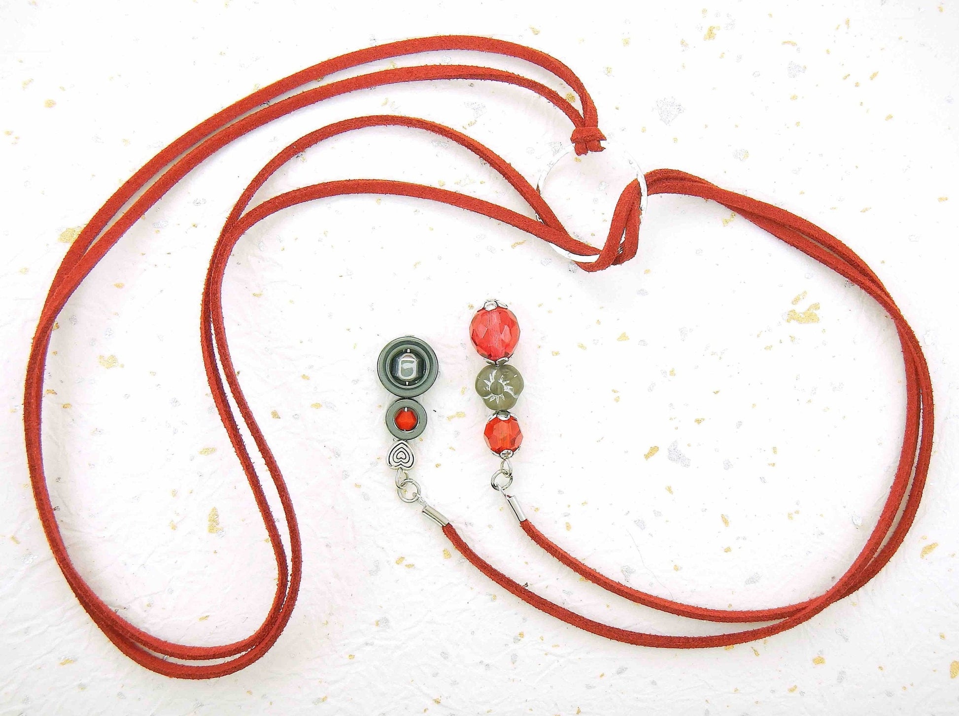 Adjustable necklace in red mock suede, red and hematite details, silver-coloured ring