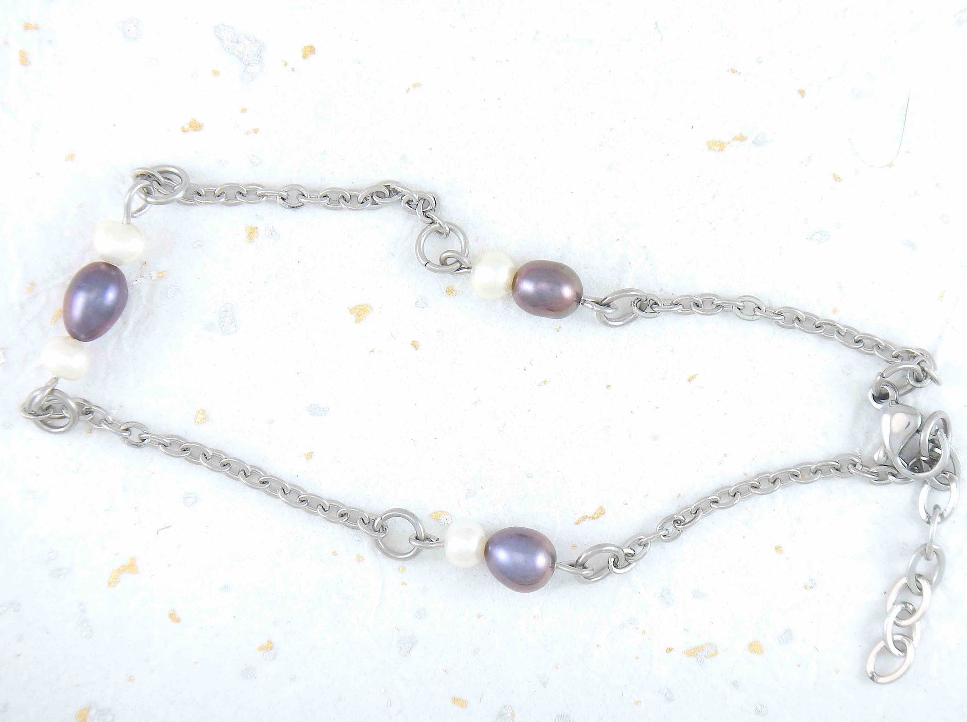 Anklet with iridescent violet and white natural freshwater pearls on stainless steel chain