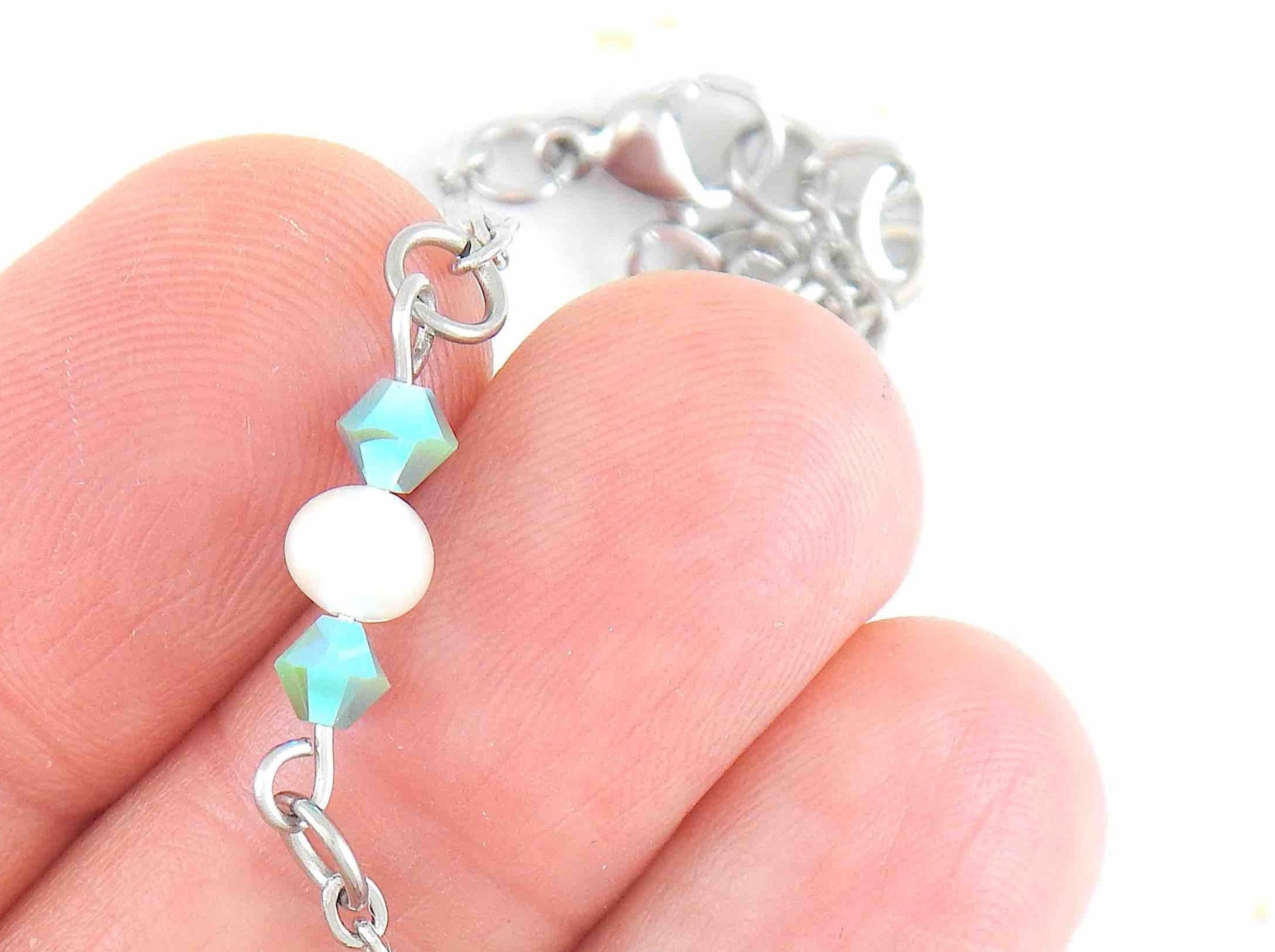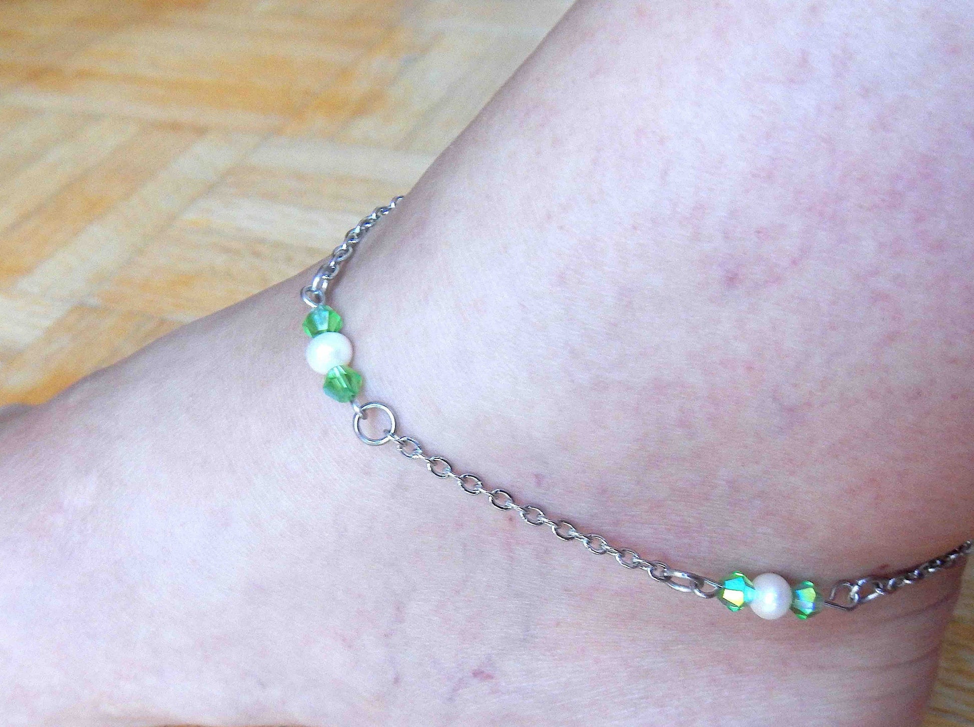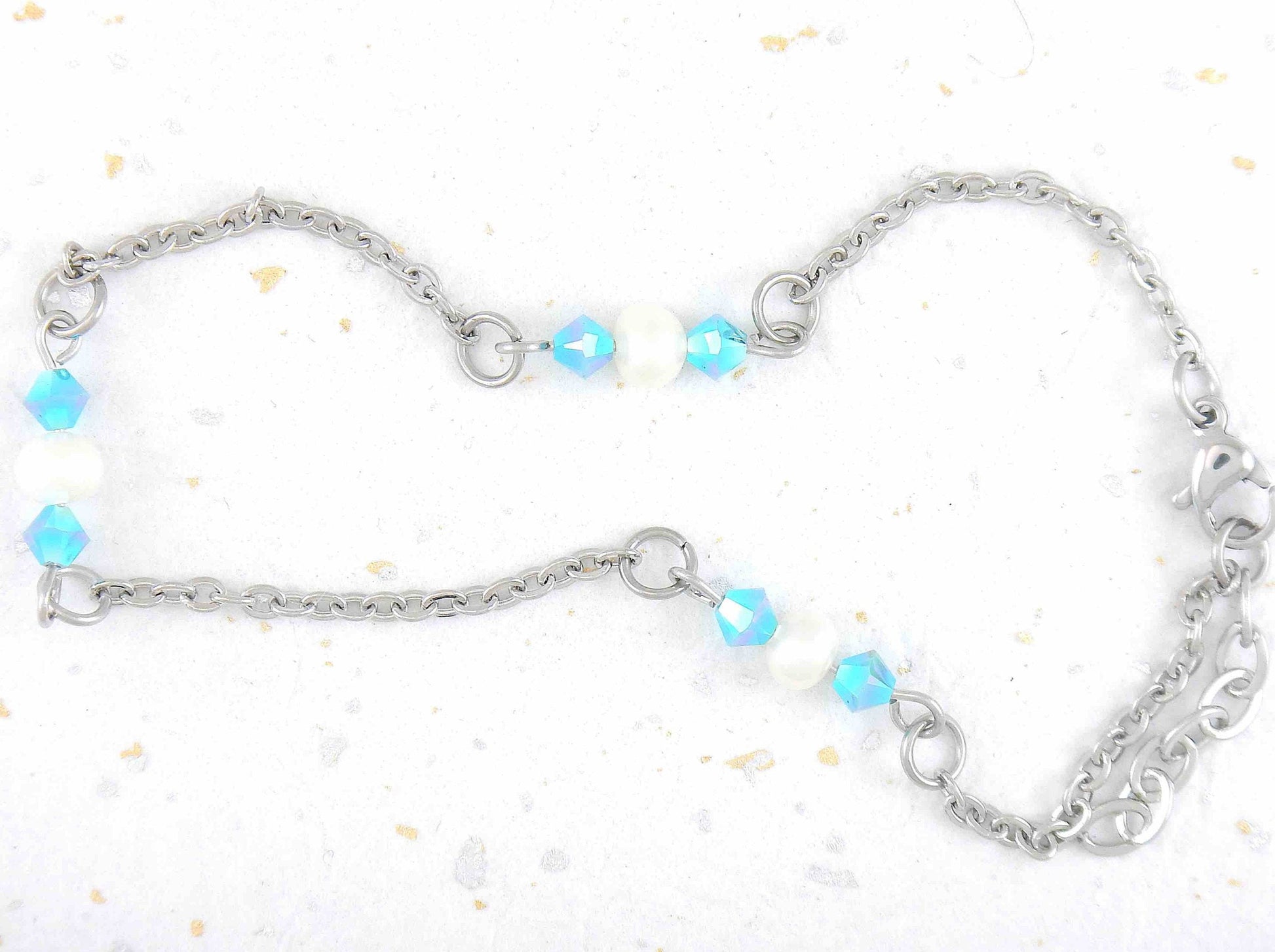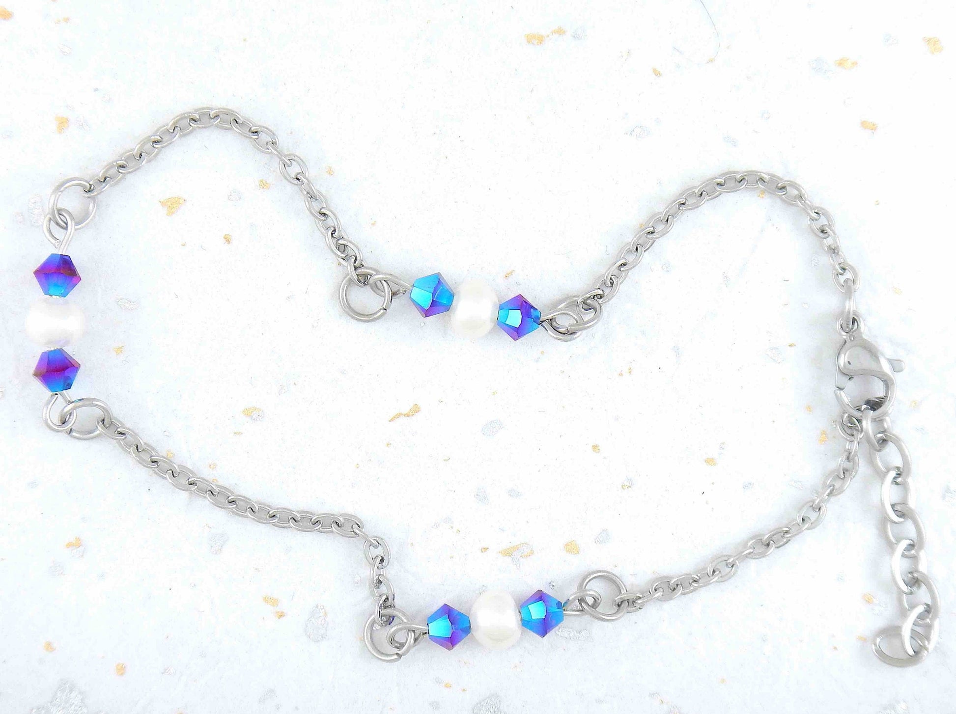 Anklet with natural white freshwater pearls and Swarovski crystals on hypoallergenic stainless steel chain