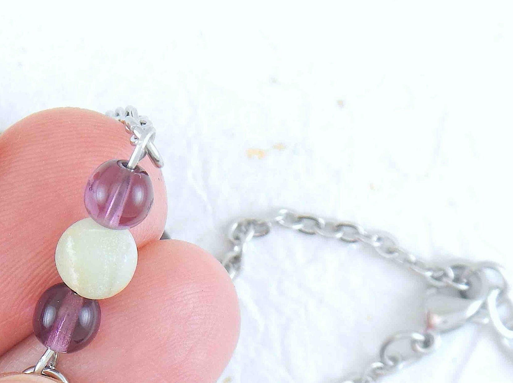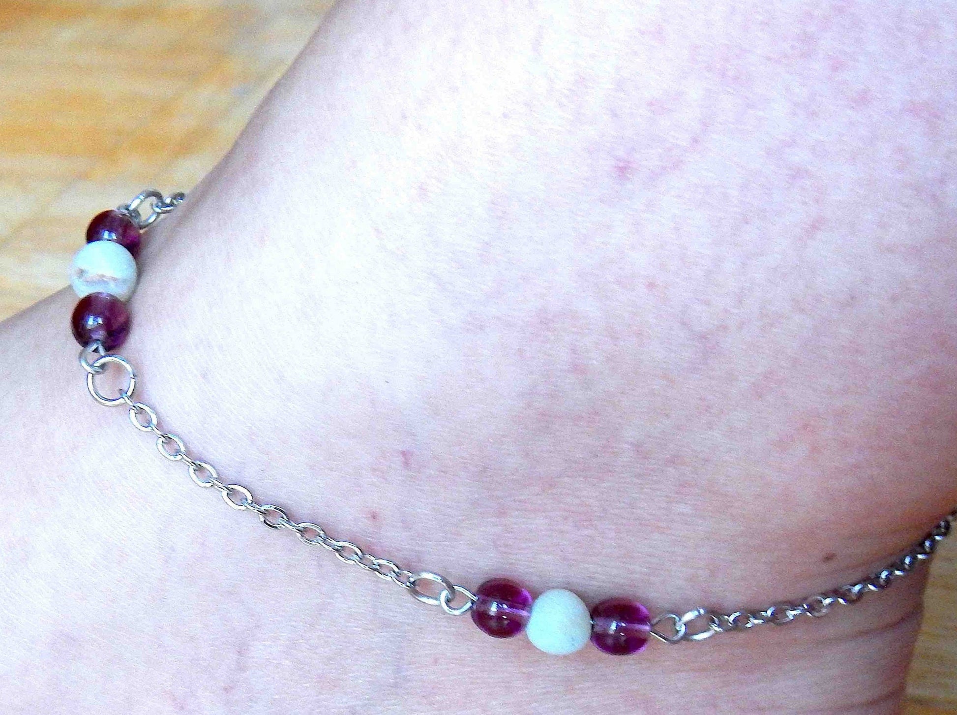 Anklet with shiny amethyst and matte amazonite beads on hypoallergenic stainless steel chain