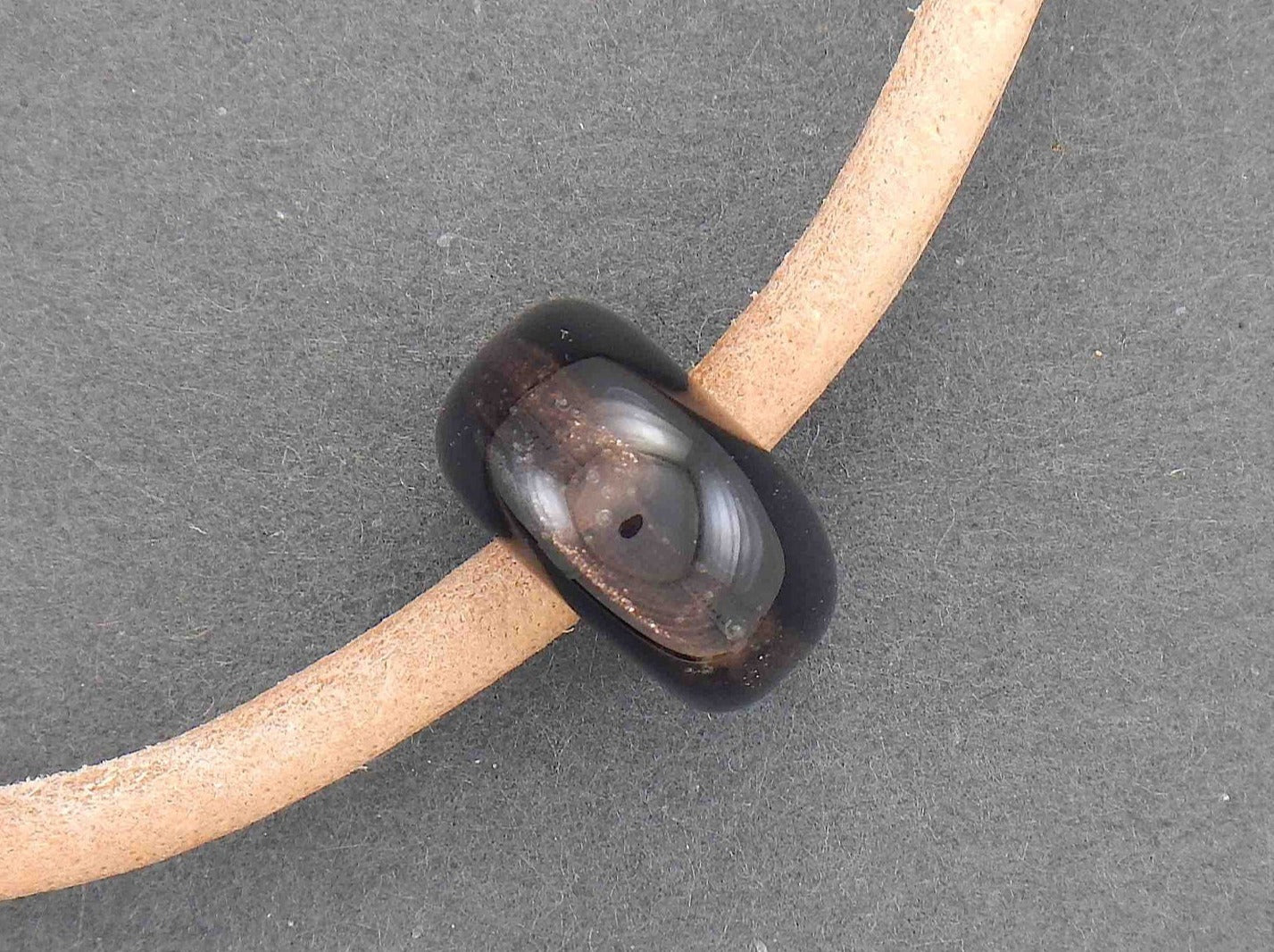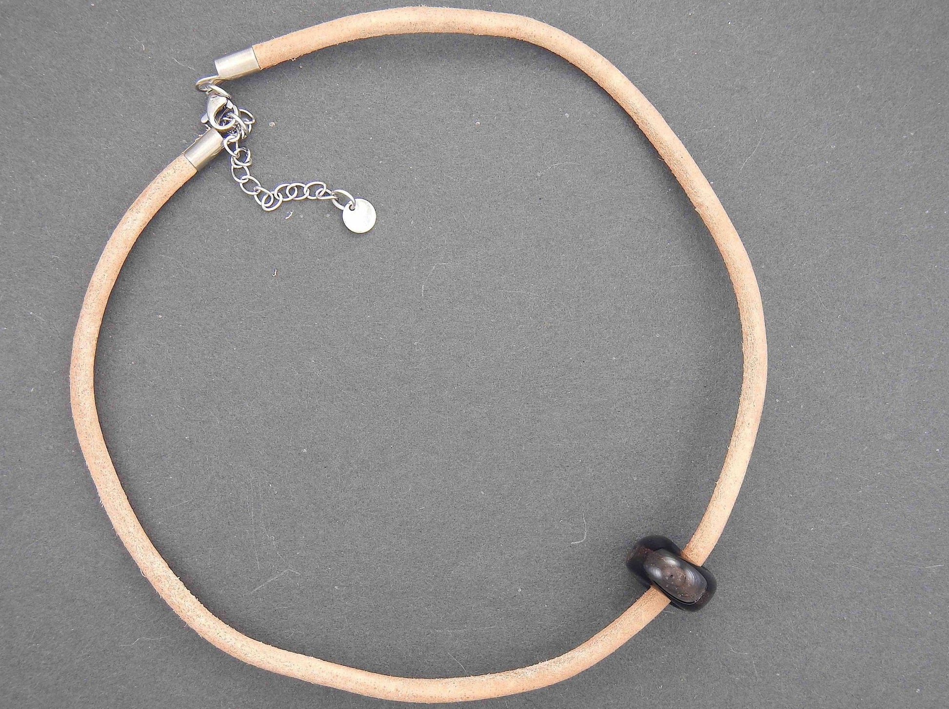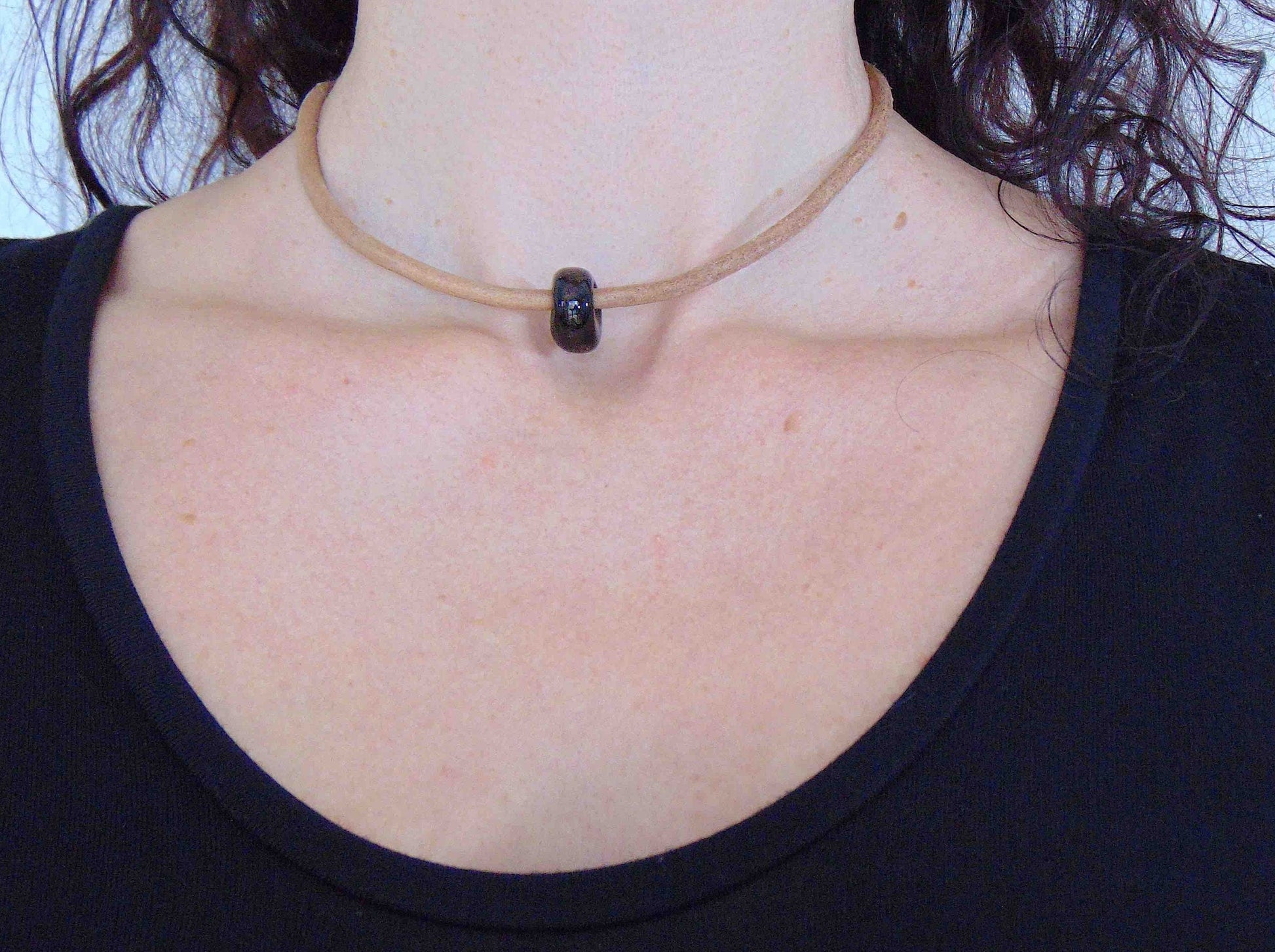 Choker necklace with black glass bead (Murano-style glass handmade in Montreal), bronze aventurine inclusions, rough natural leather cord, stainless steel clasp