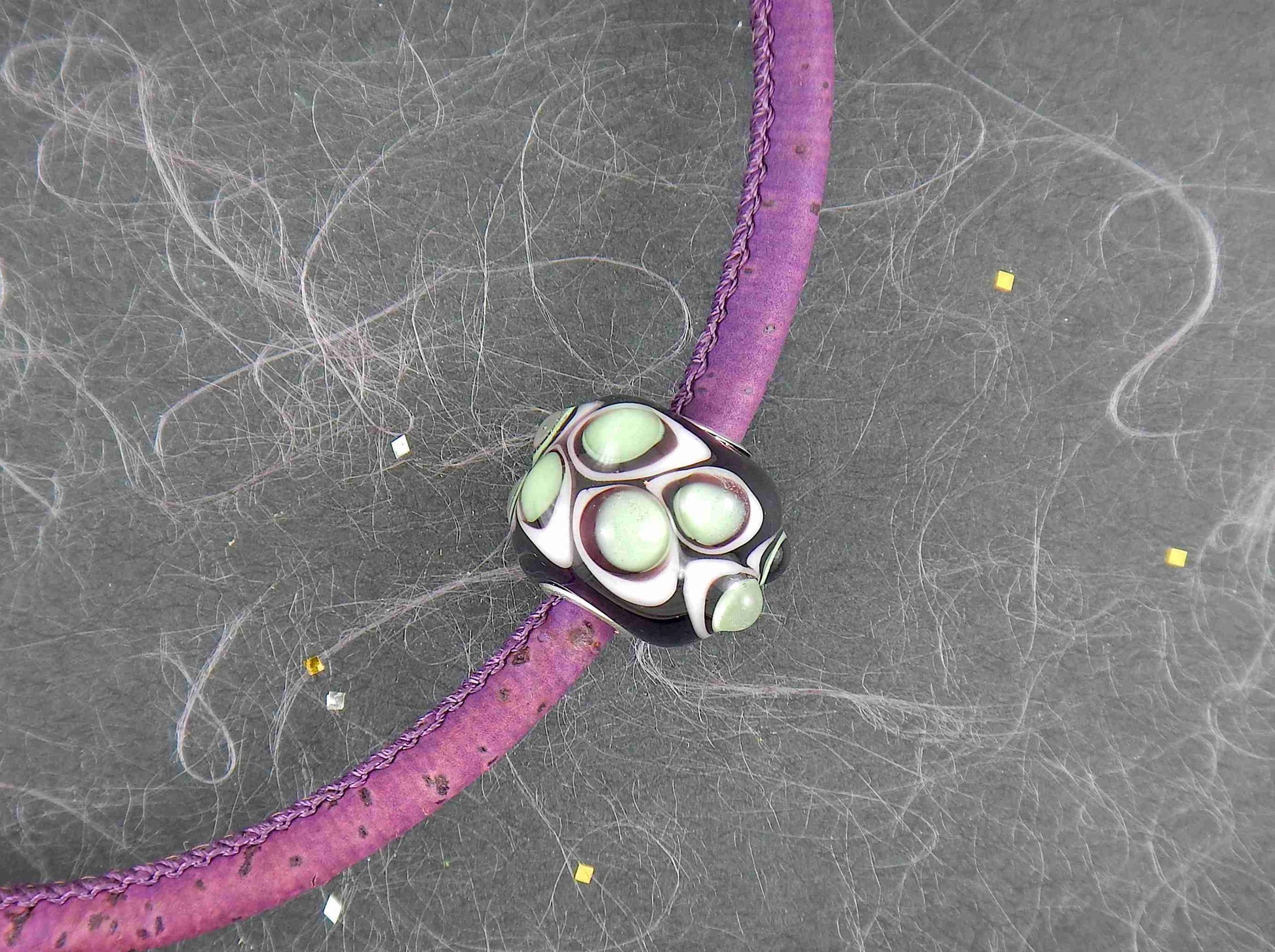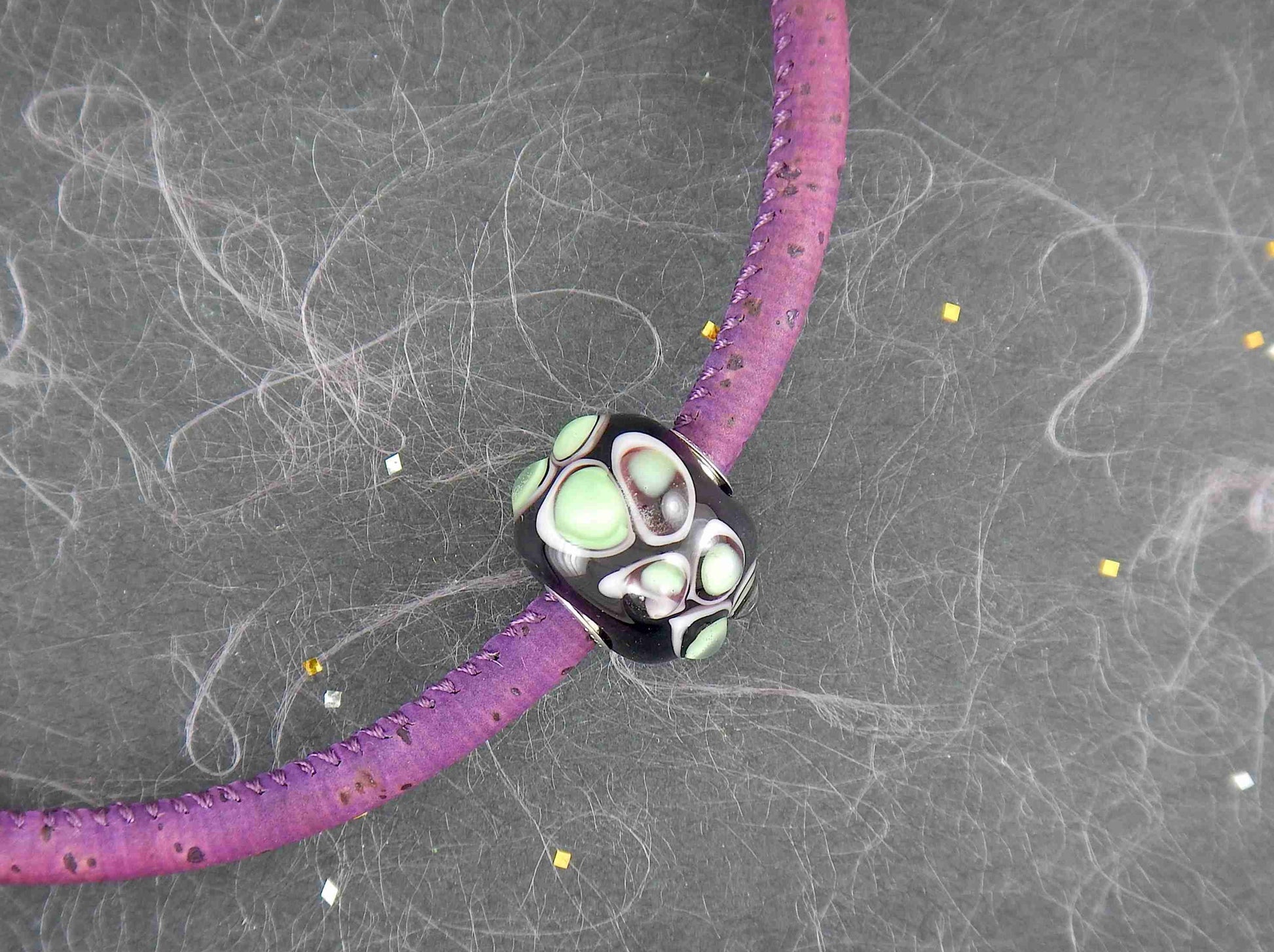 Choker necklace with deep purple cylinder glass bead (Murano-style glass handmade in Montreal), 3-dimensional white-translucent green dots, purple cork cord, stainless steel clasp