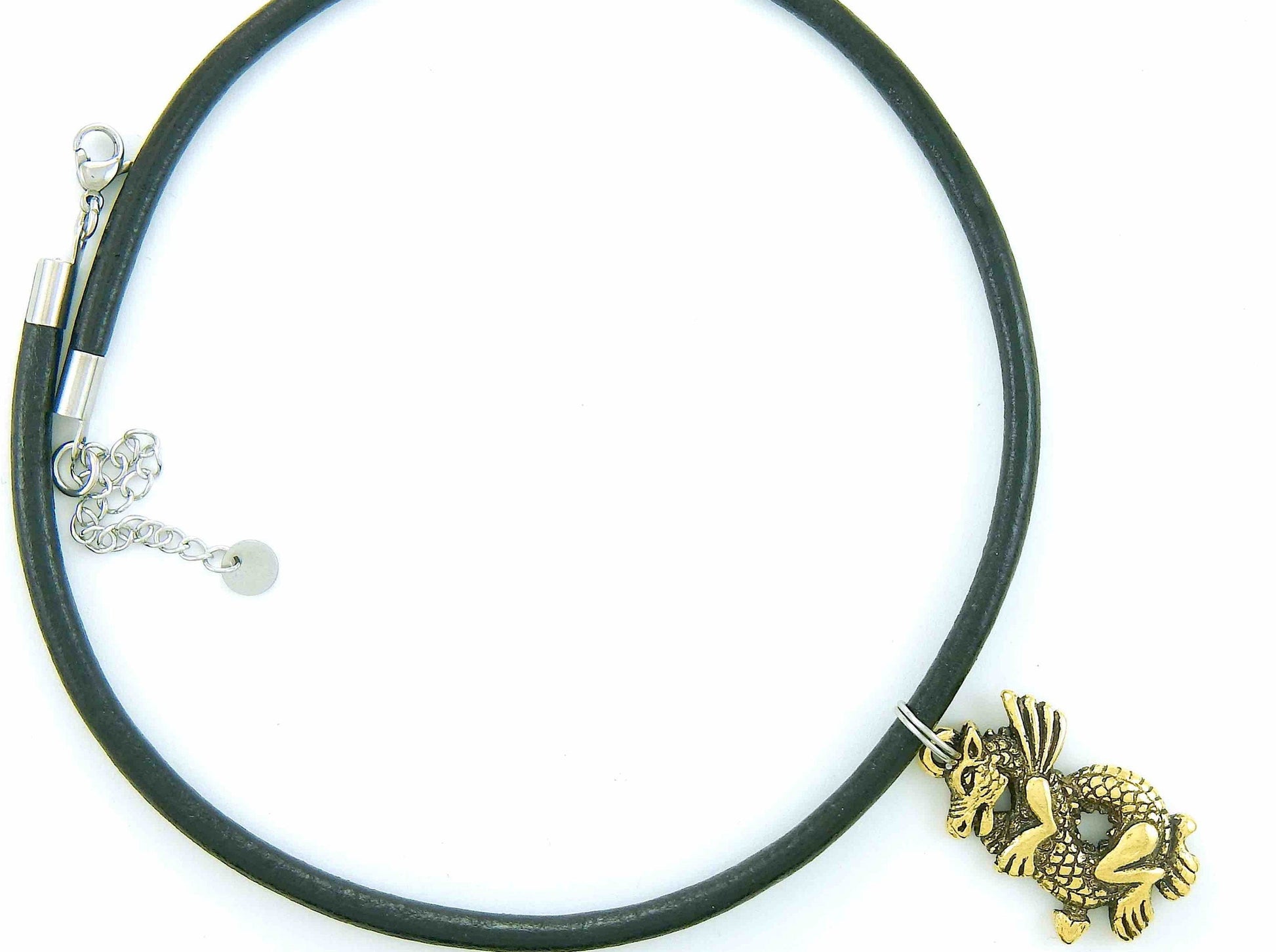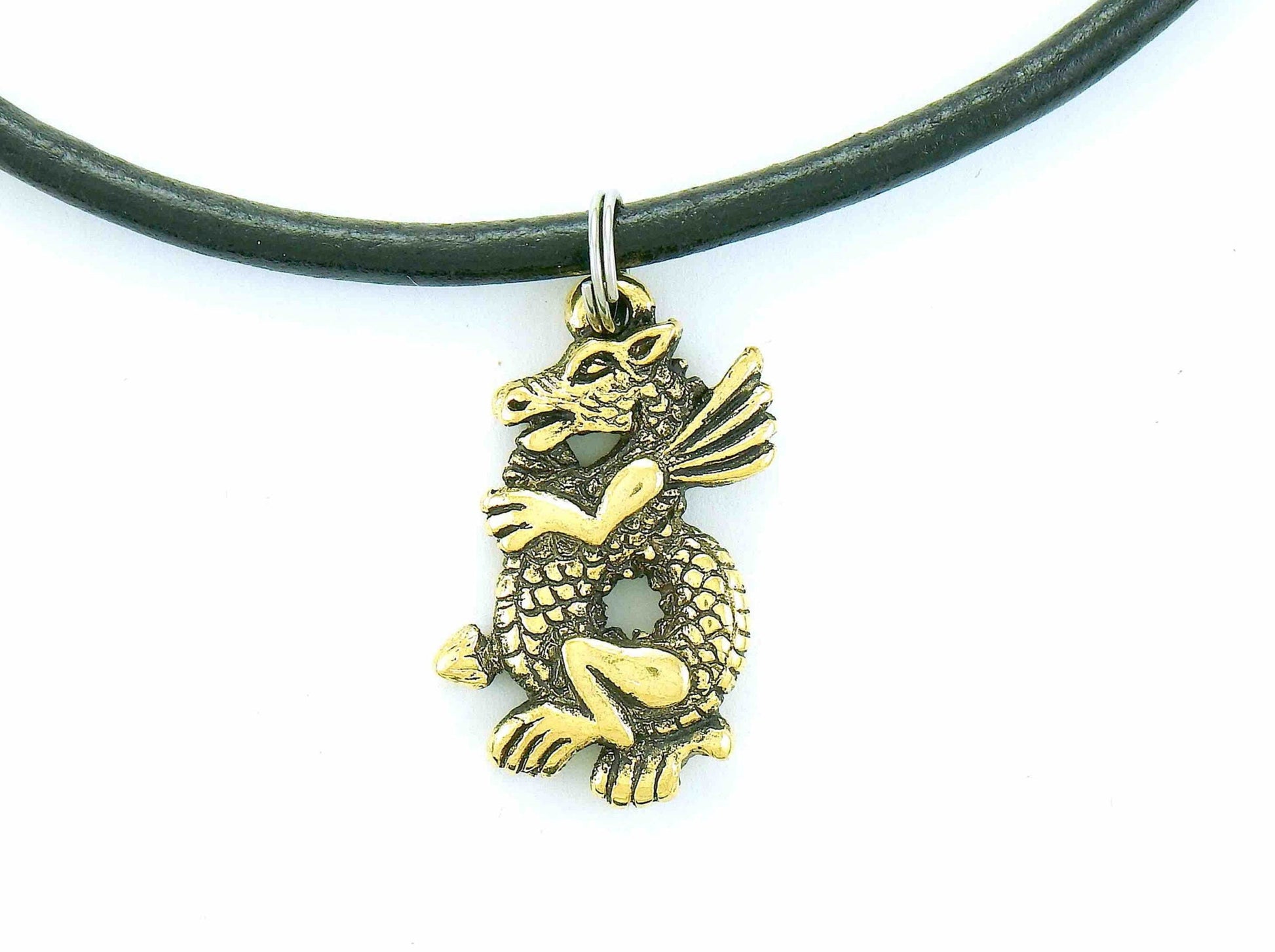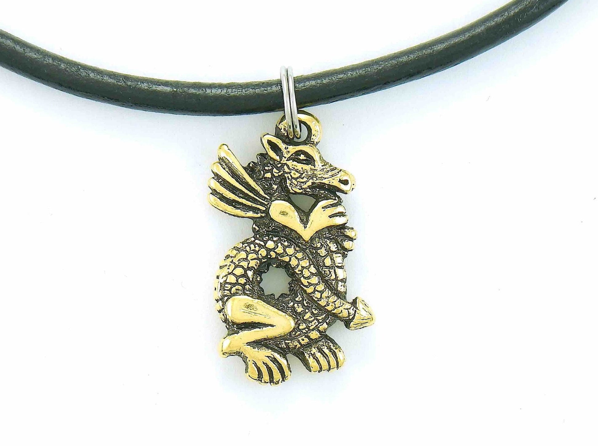 Choker necklace with gold-toned pewter dragon pendant on black leather, stainless steel clasp