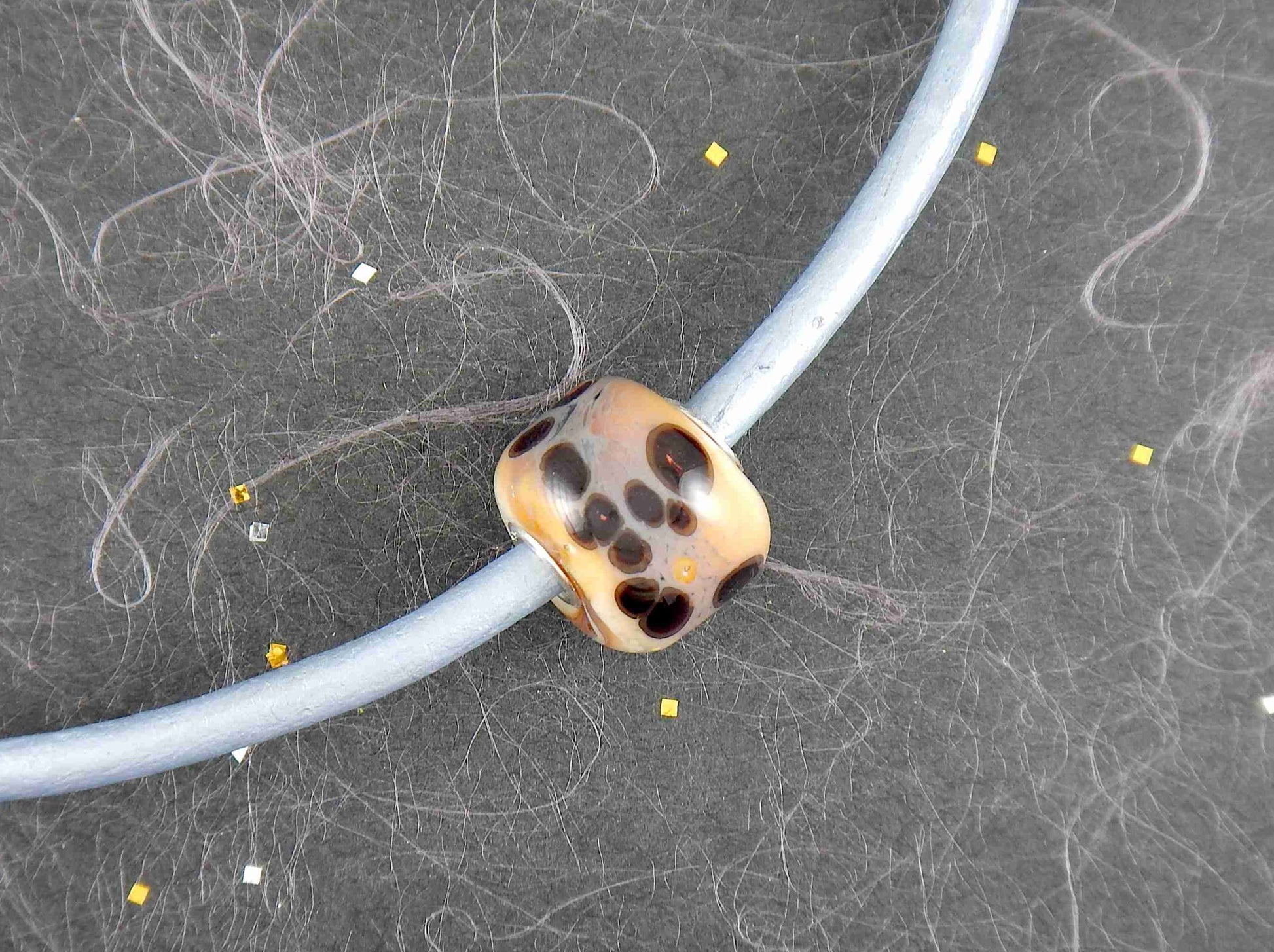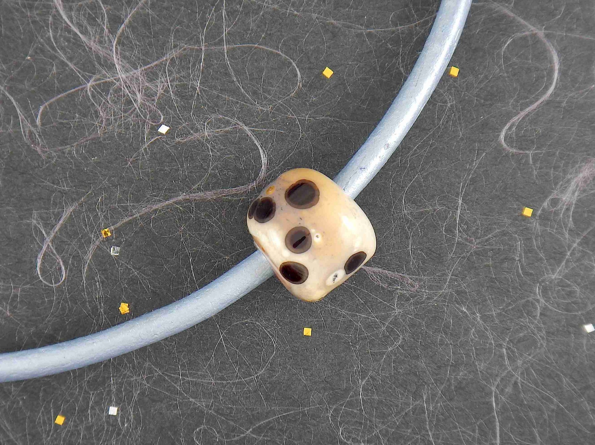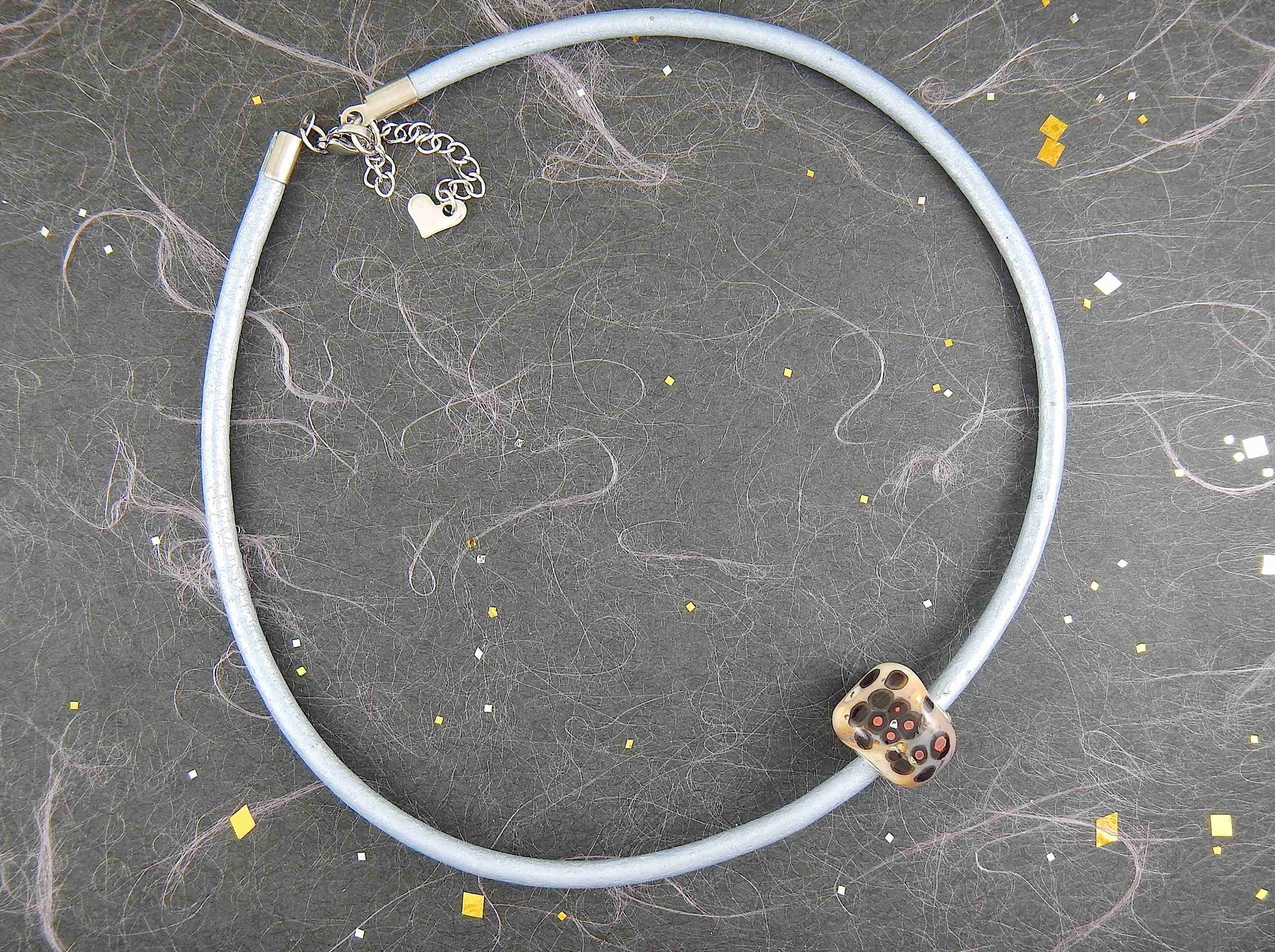 Choker necklace with off-white cylinder glass bead (Murano-style glass handmade in Montreal), black and orange dots, baby blue leather cord, stainless steel clasp