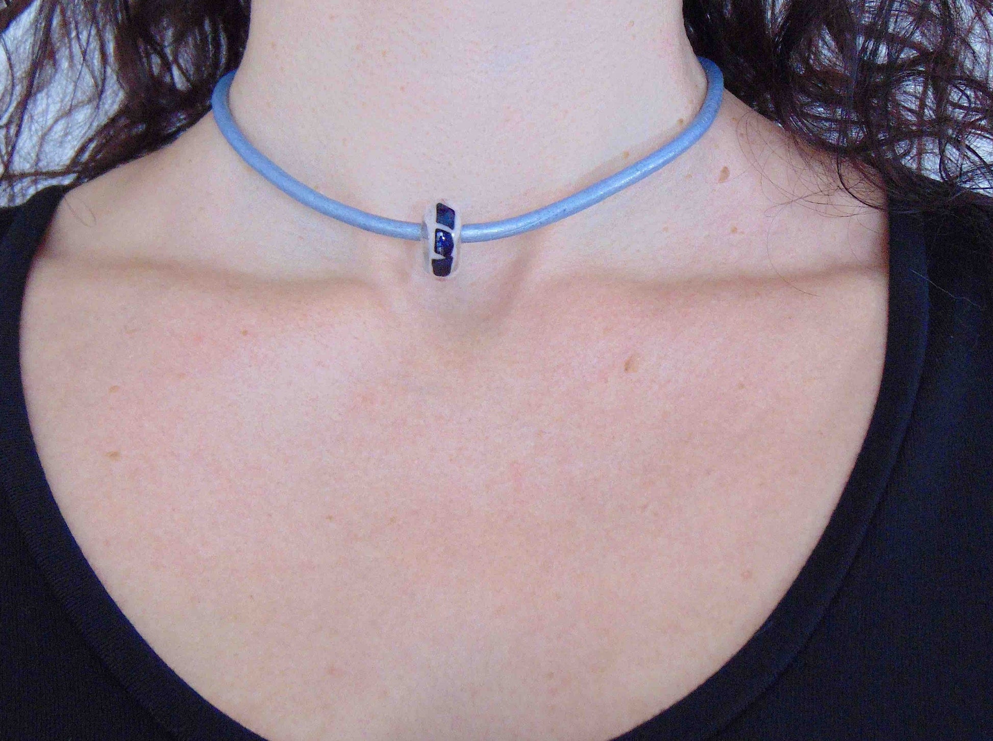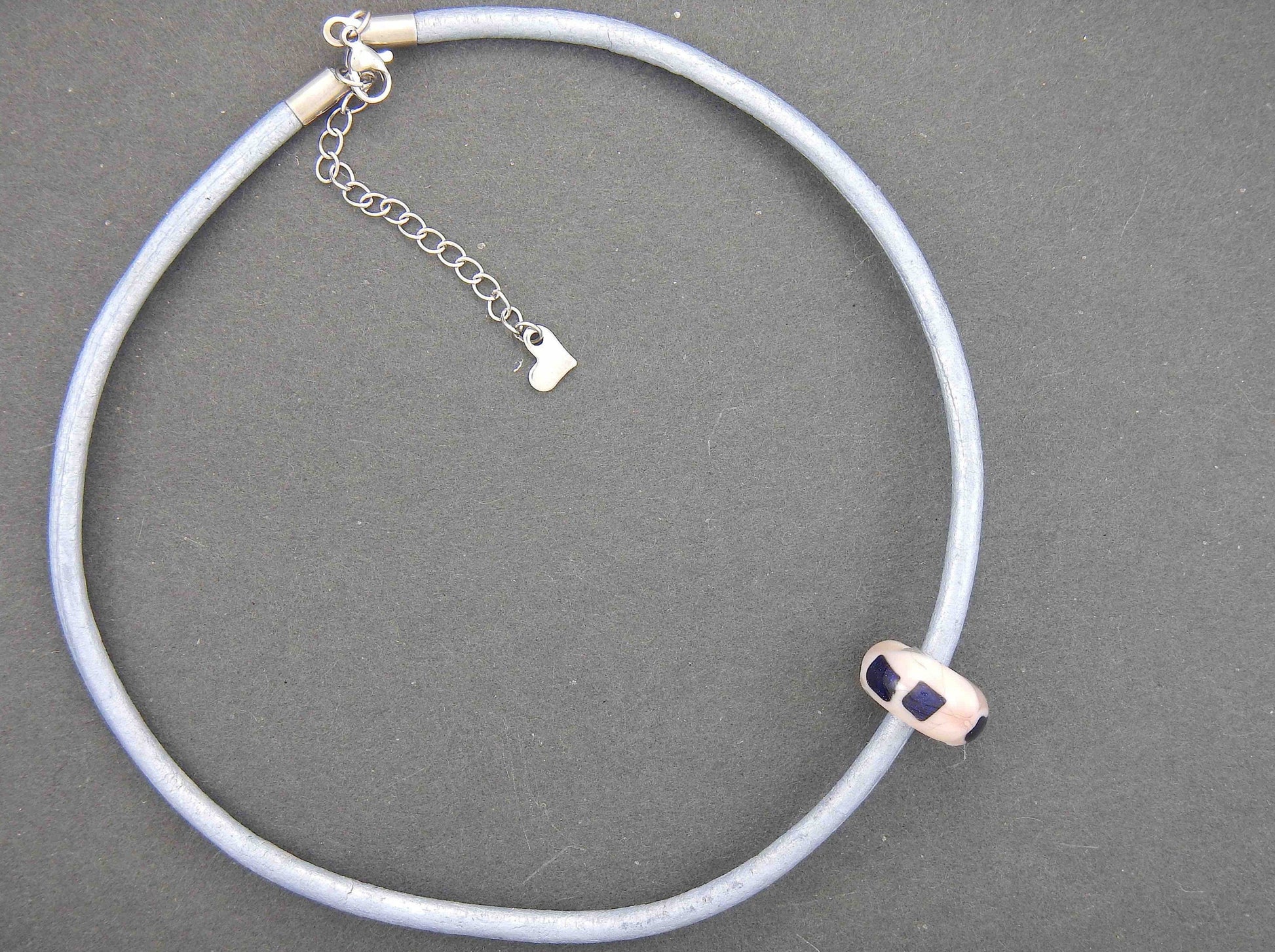 Choker necklace with pink glass bead (Murano-style glass handmade in Montreal), blue aventurine inclusions, pearl baby blue leather cord, stainless steel clasp