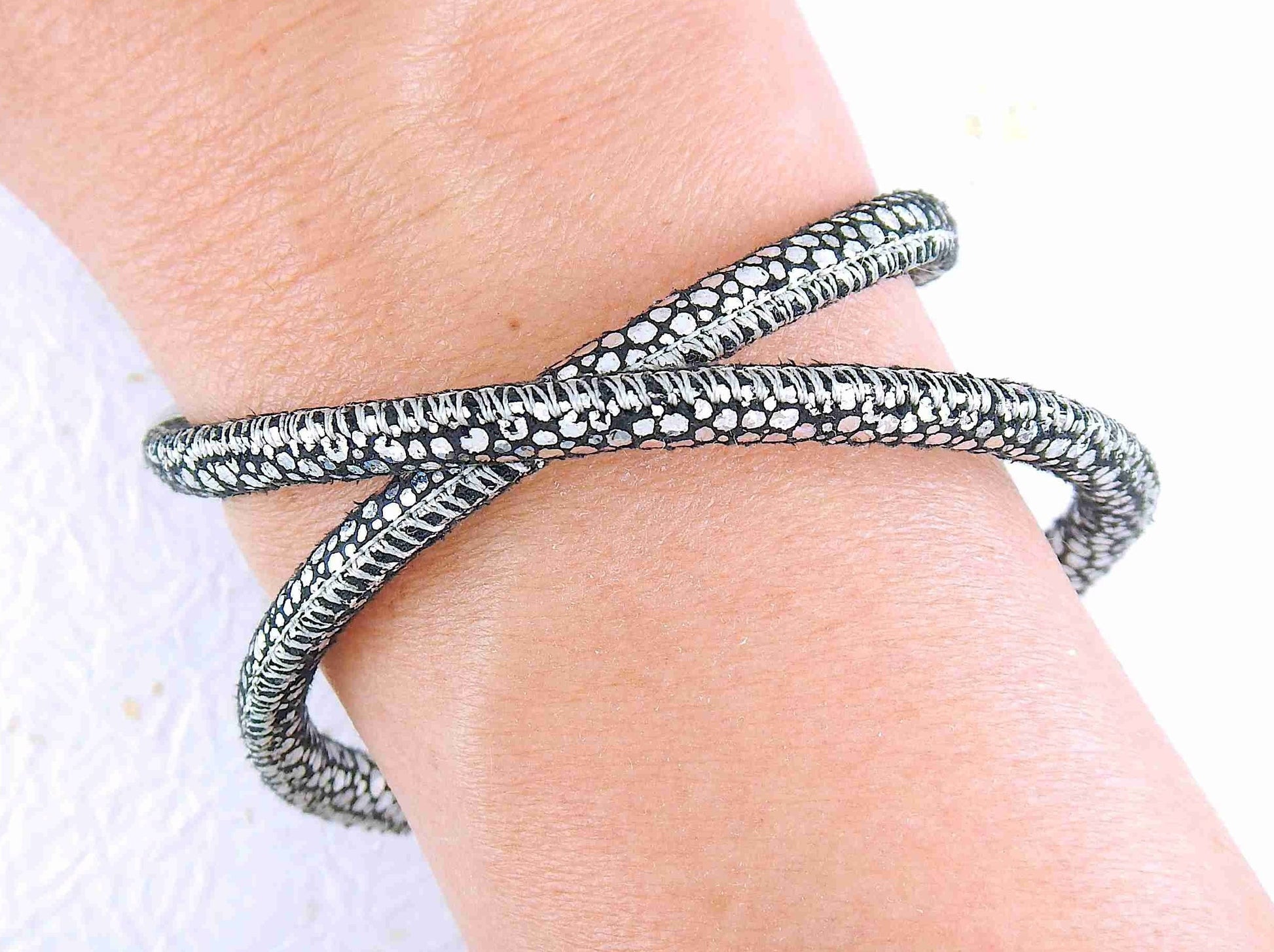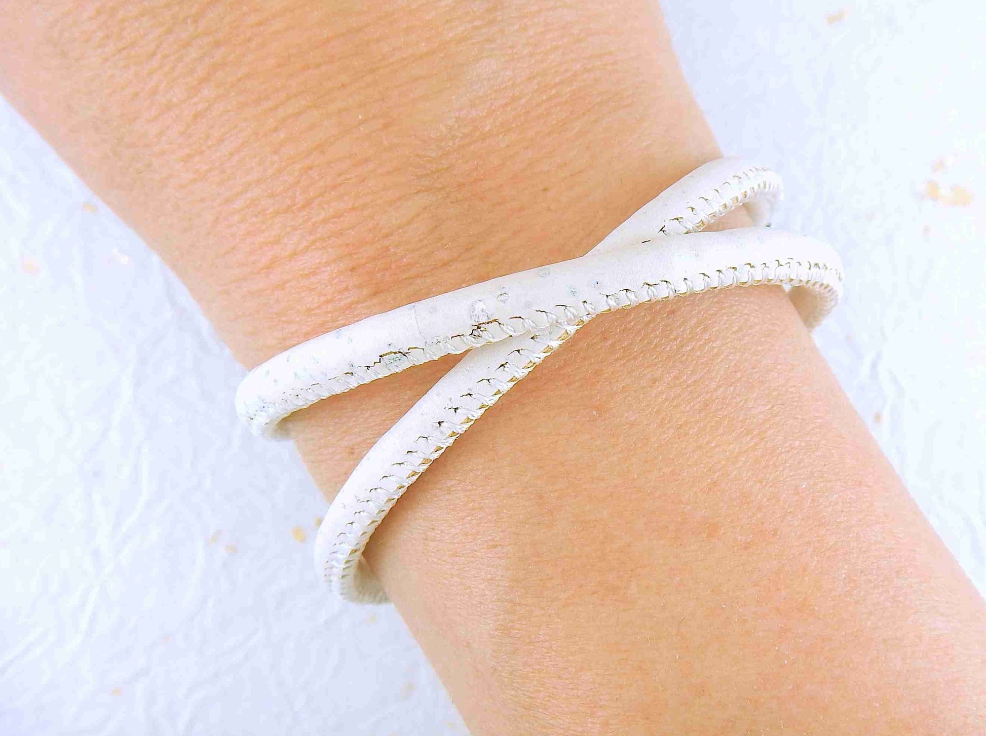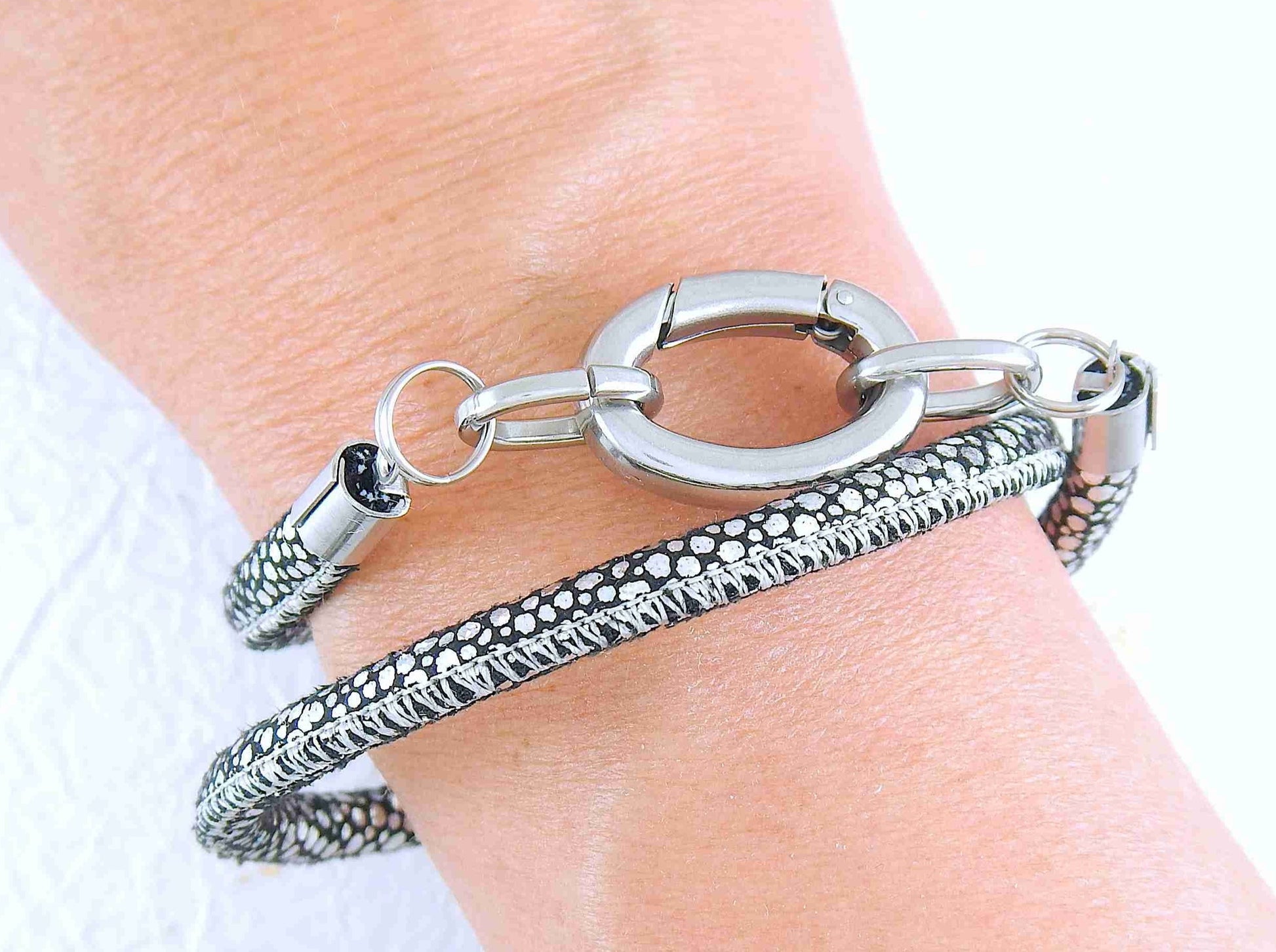 This modern bracelet will fit with all your clothes. The beautiful clasp can be worn over or under the wrist for a different look.