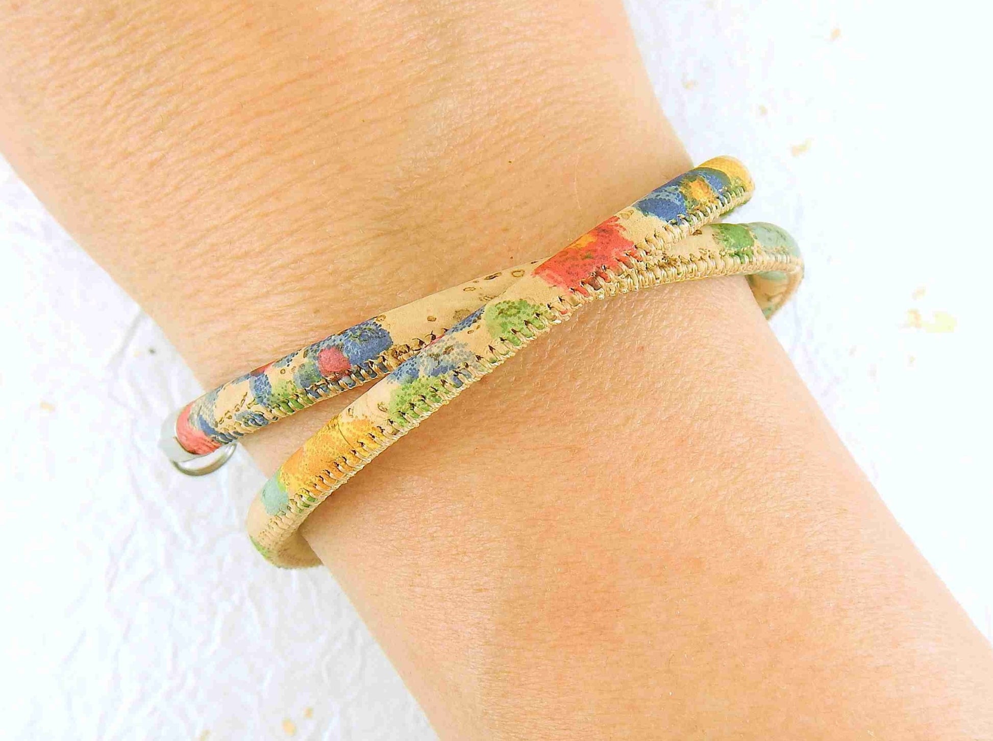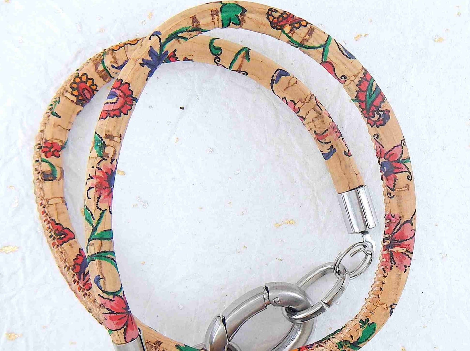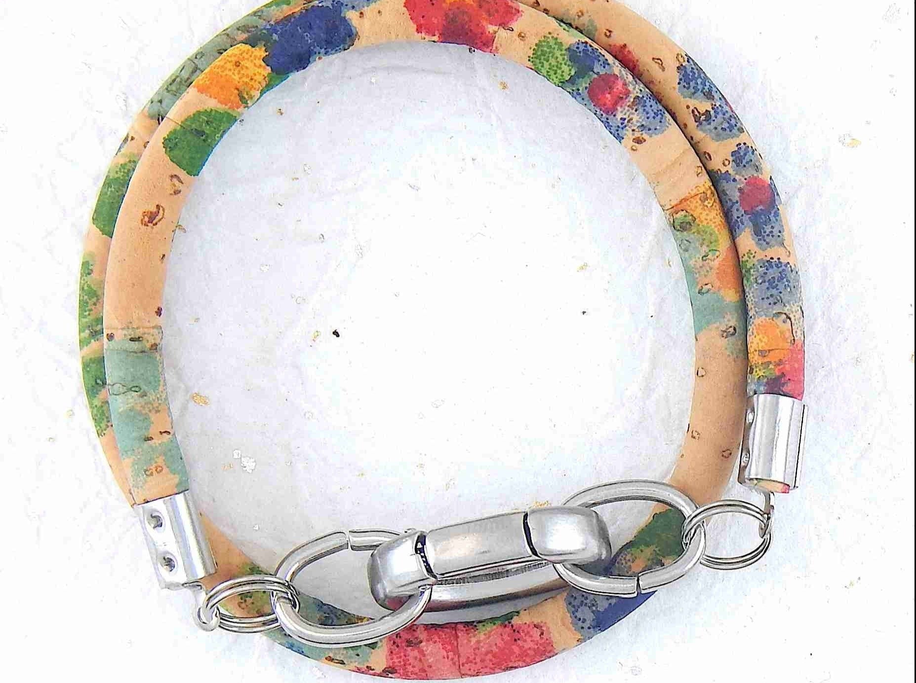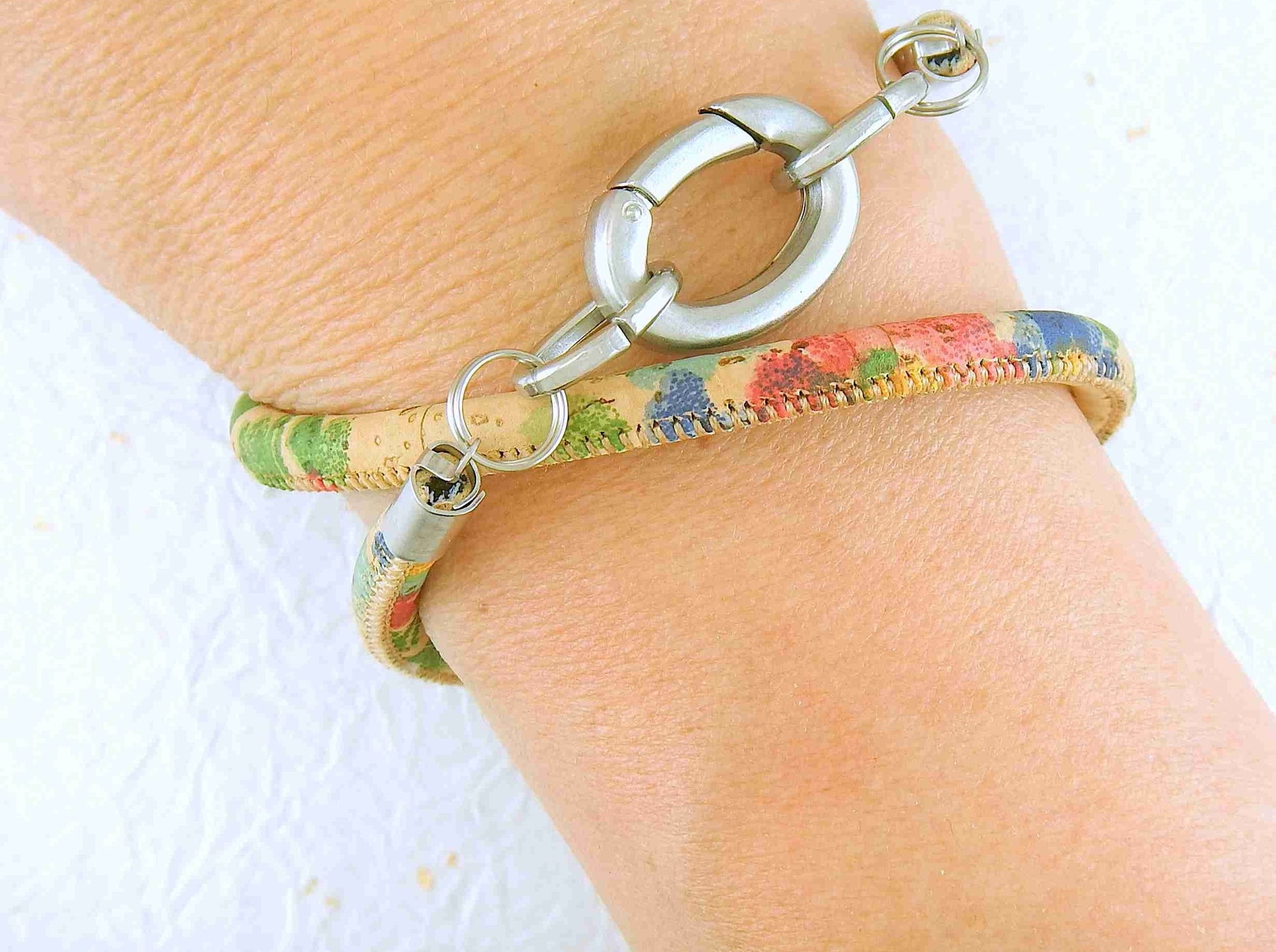 Double-row 6mm round cork bracelet with oval stainless steel clasp in 4 patterns (leopard, bright flowers, soft flowers, natural with silver speckles)