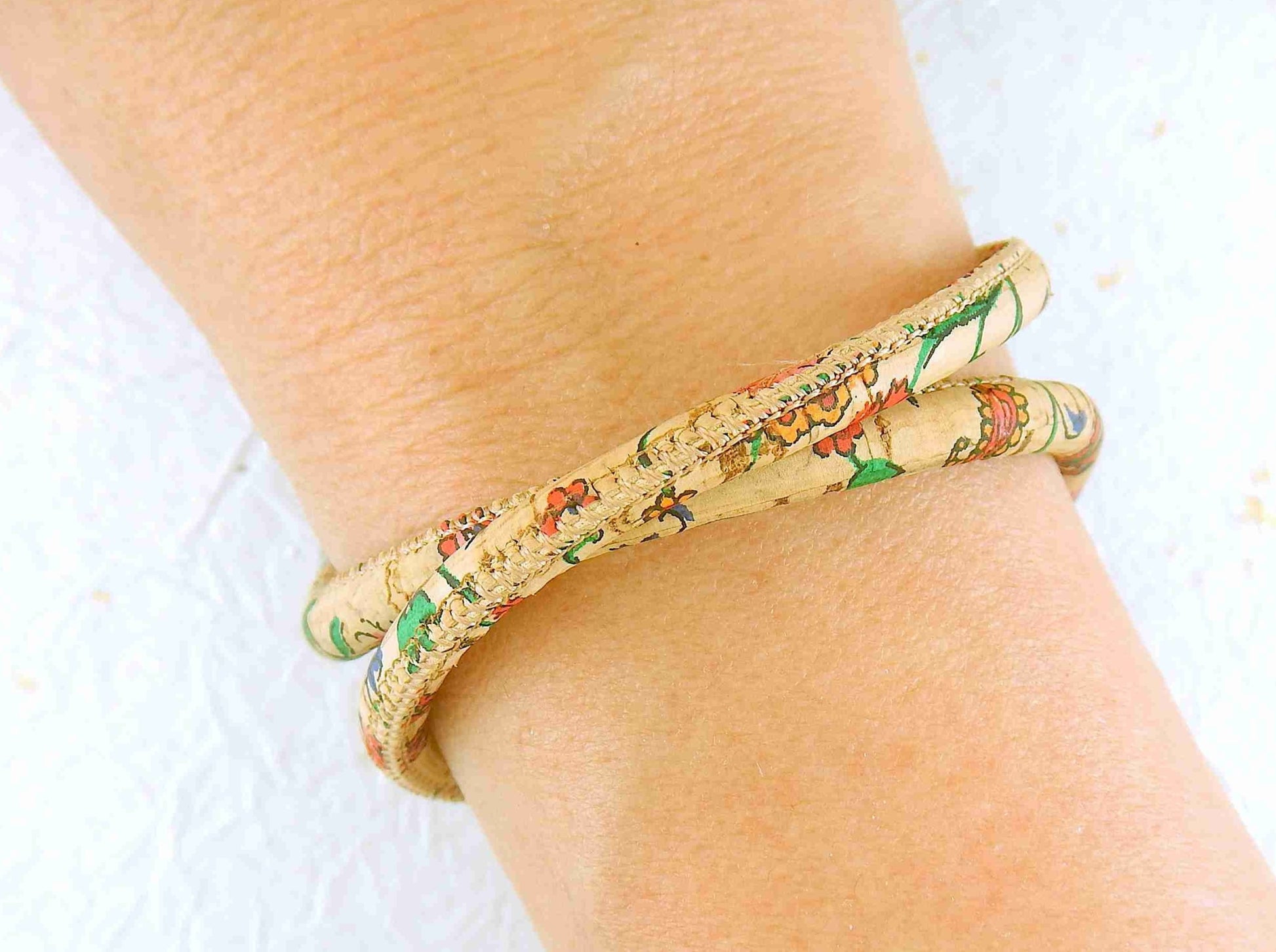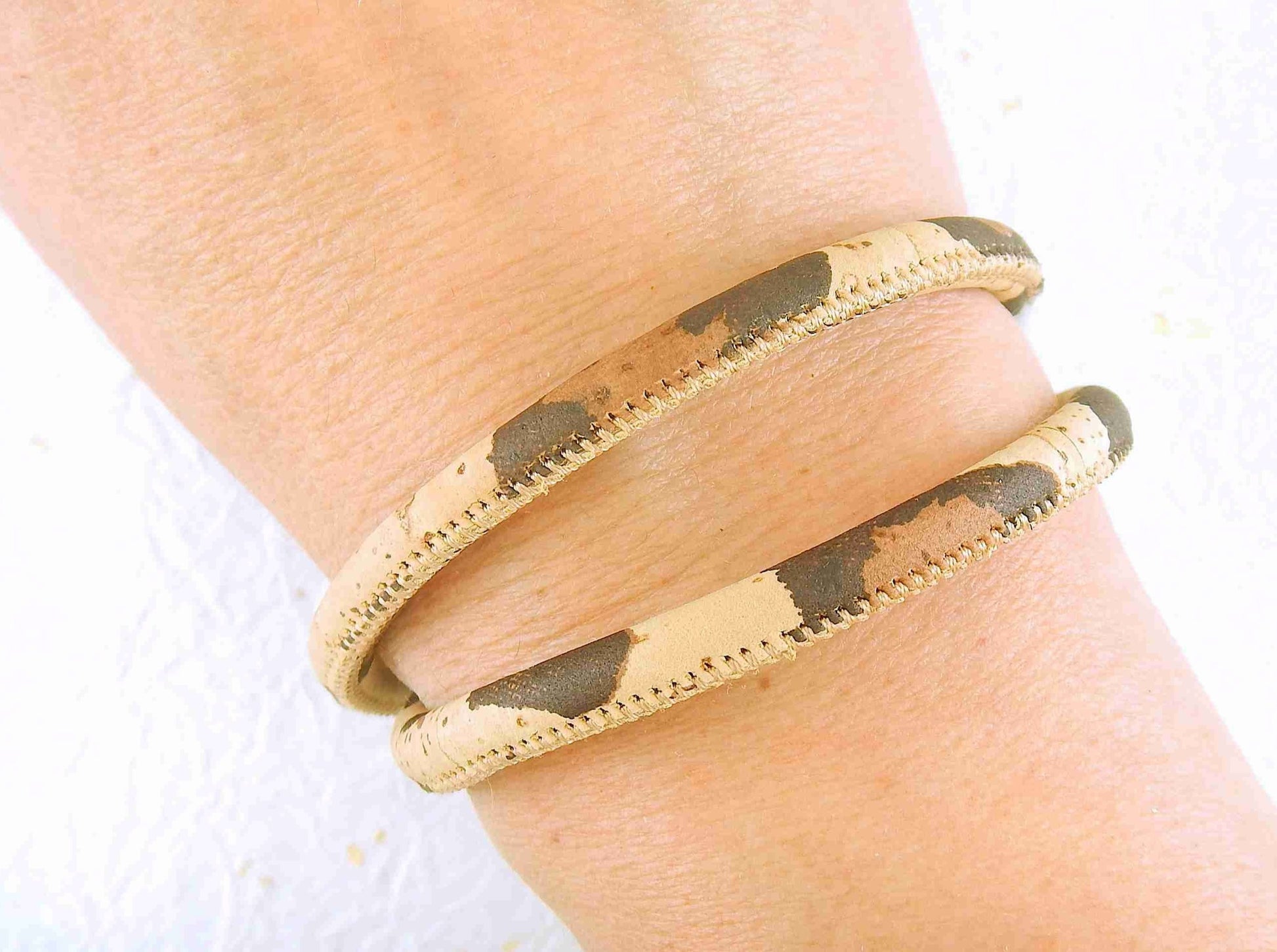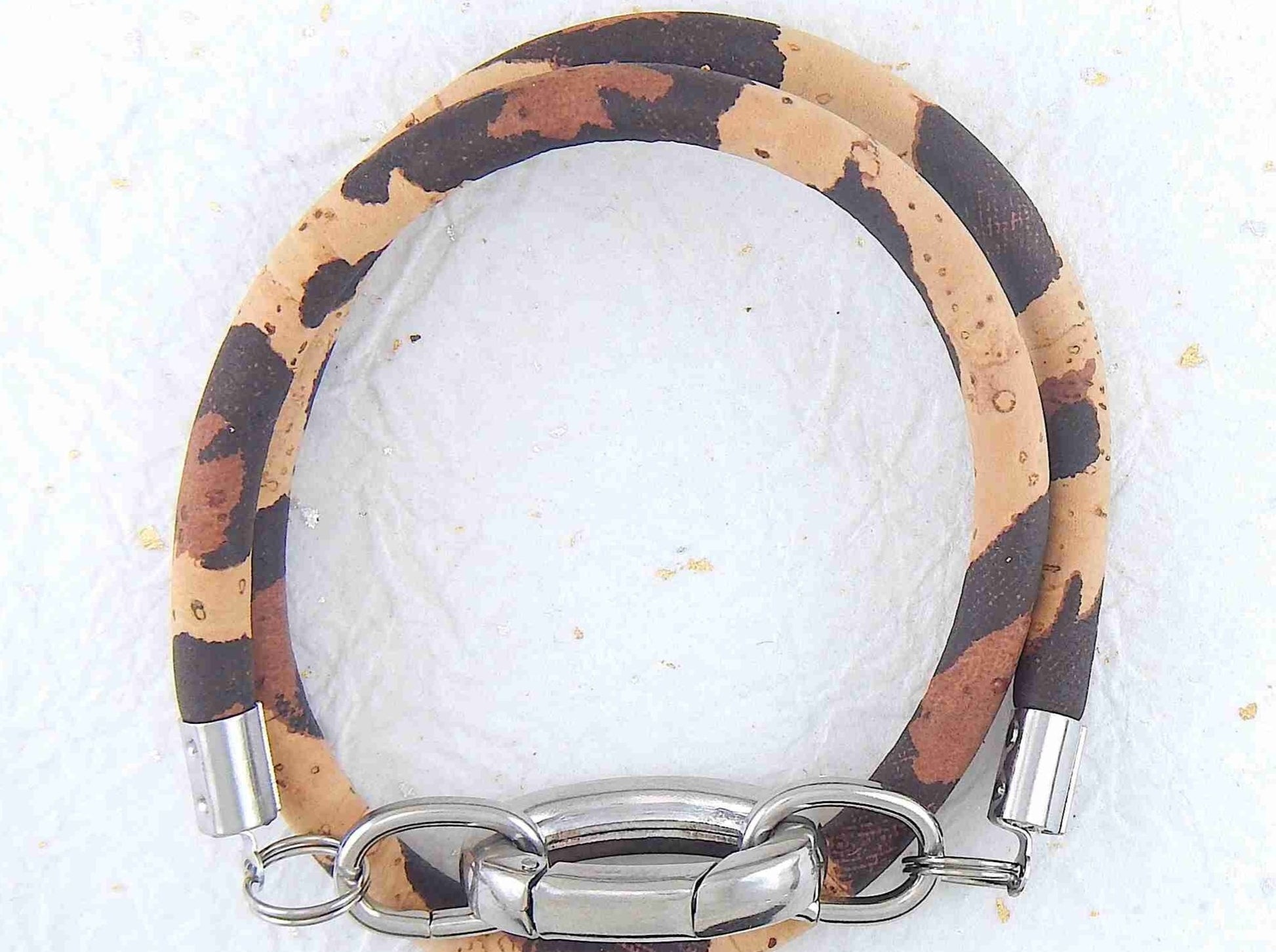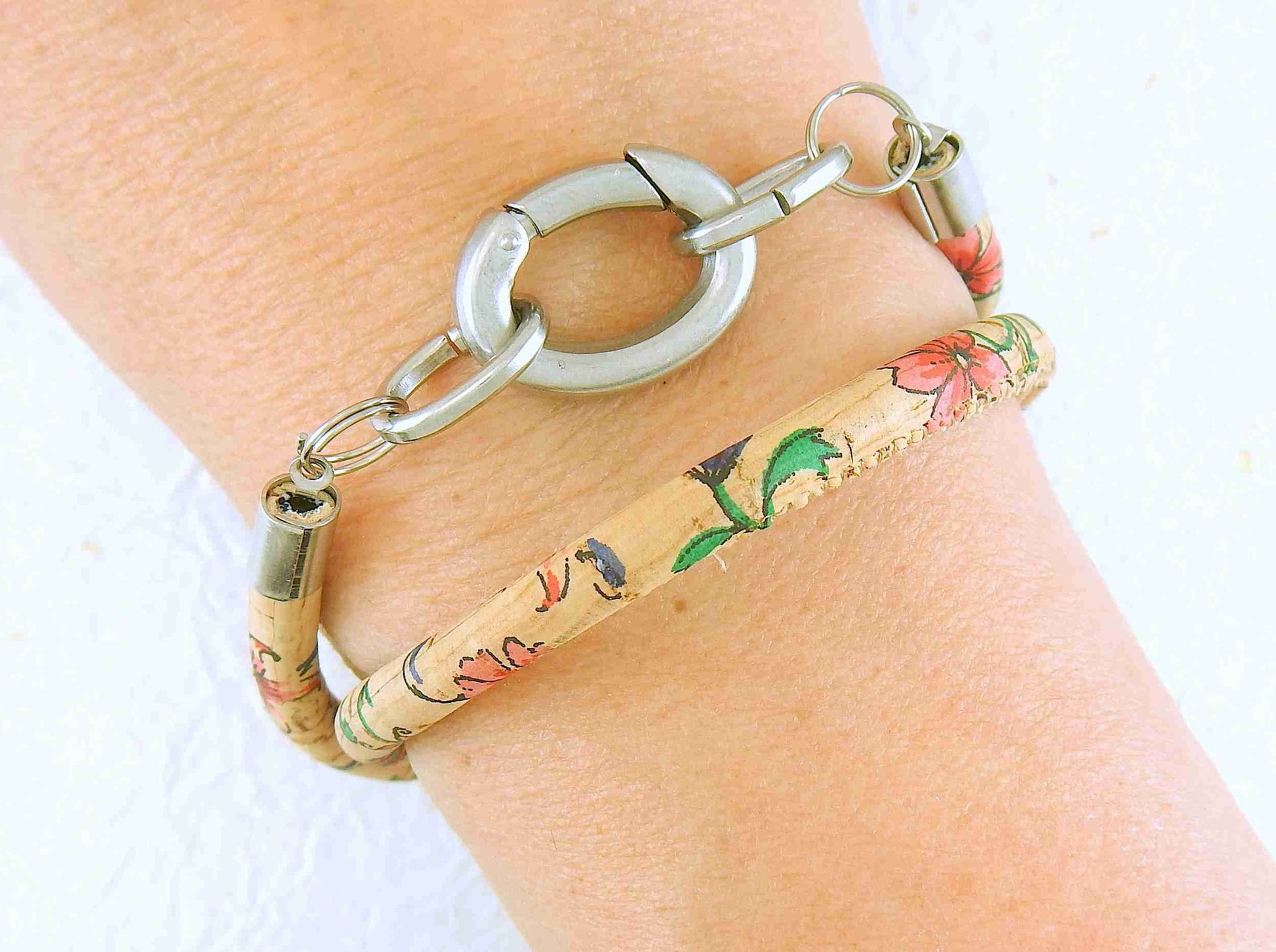 Double-row 6mm round cork bracelet with oval stainless steel clasp in 4 patterns (leopard, bright flowers, soft flowers, natural with silver speckles)