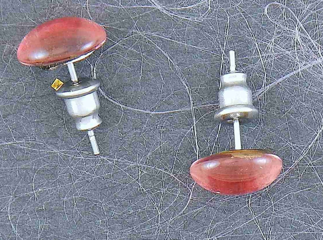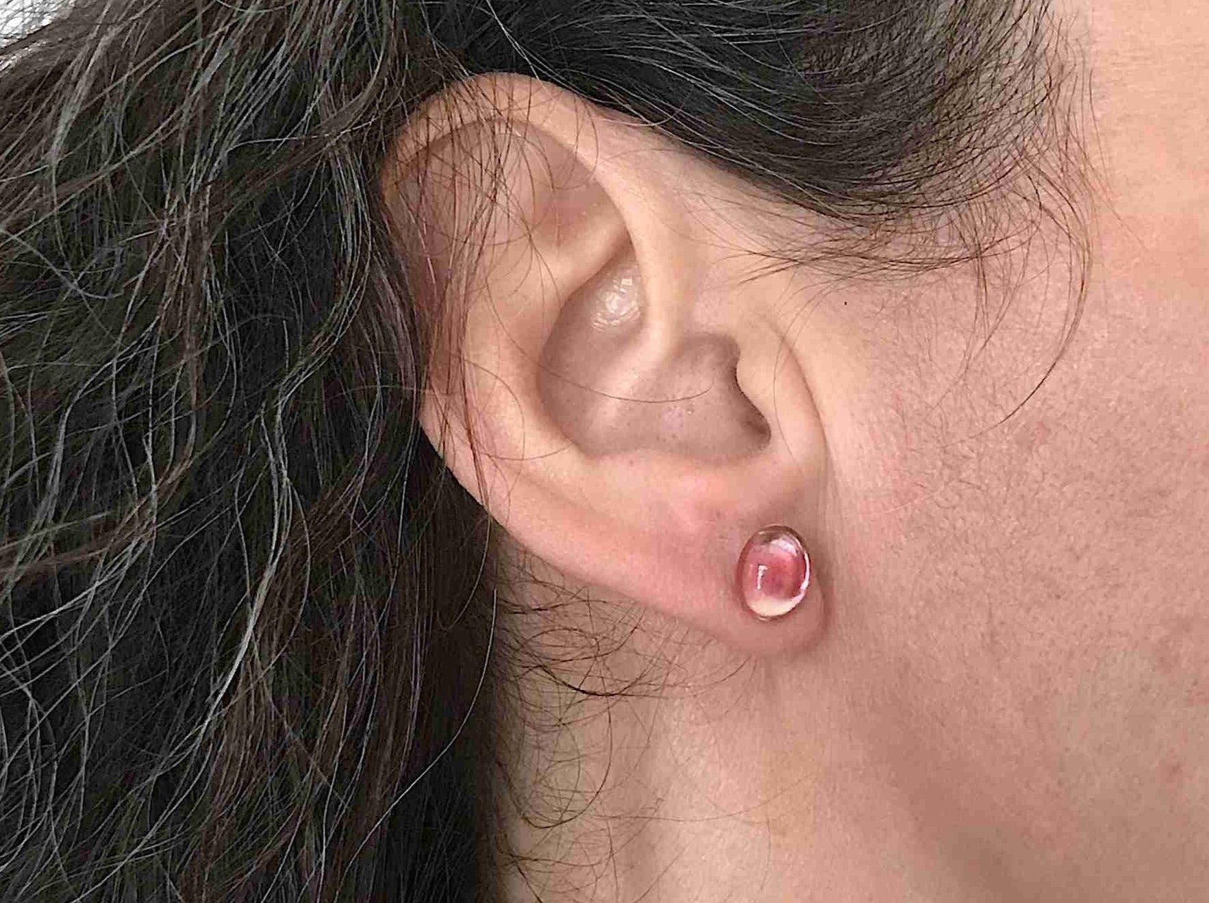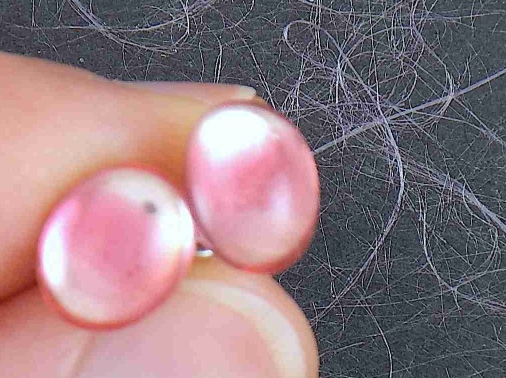 Ear studs with 10mm opalescent pink oval vintage glass cabochons, golden sheen, stainless steel posts