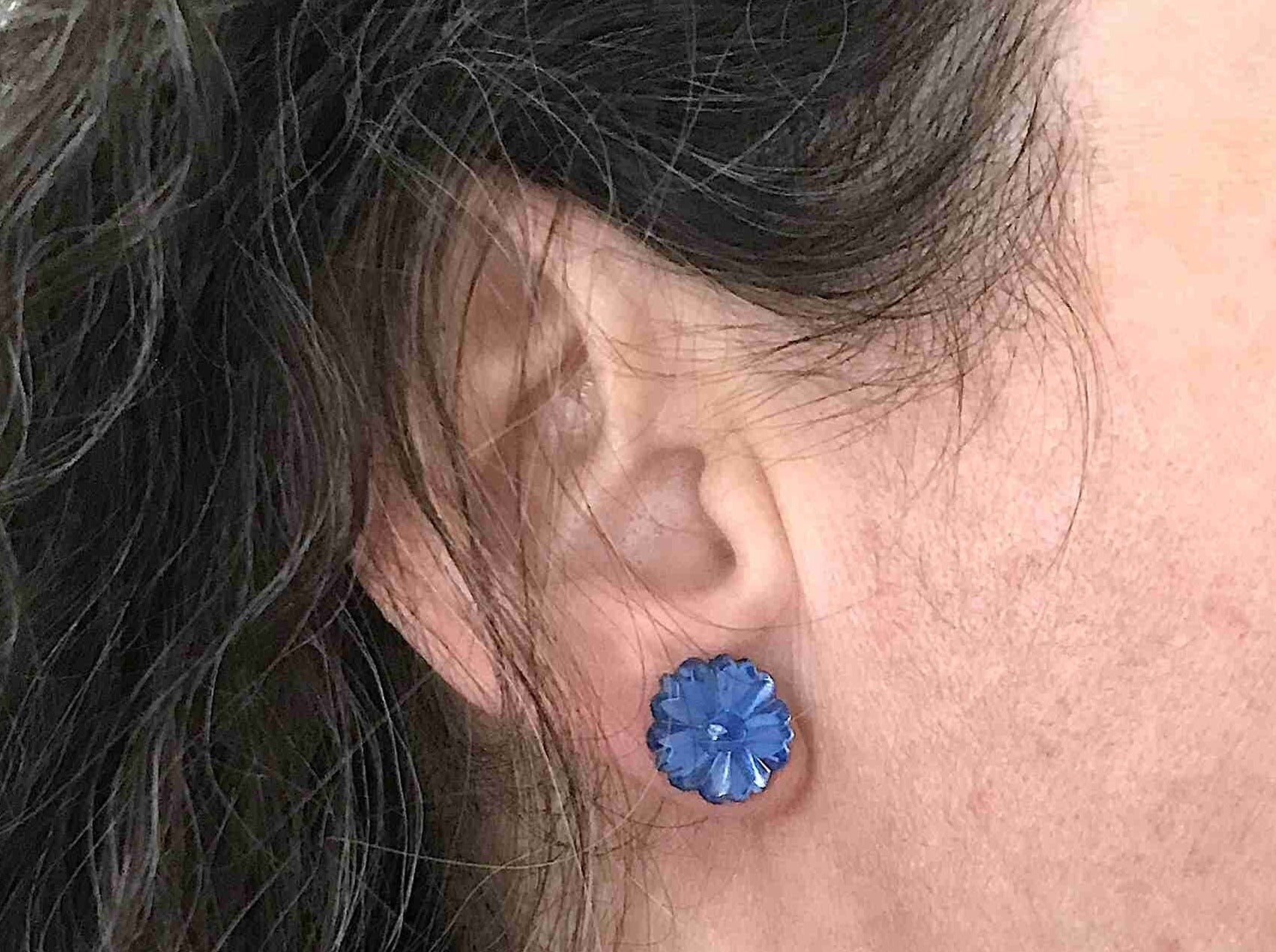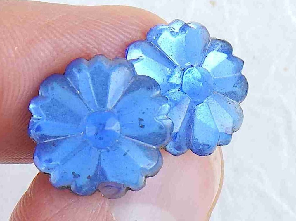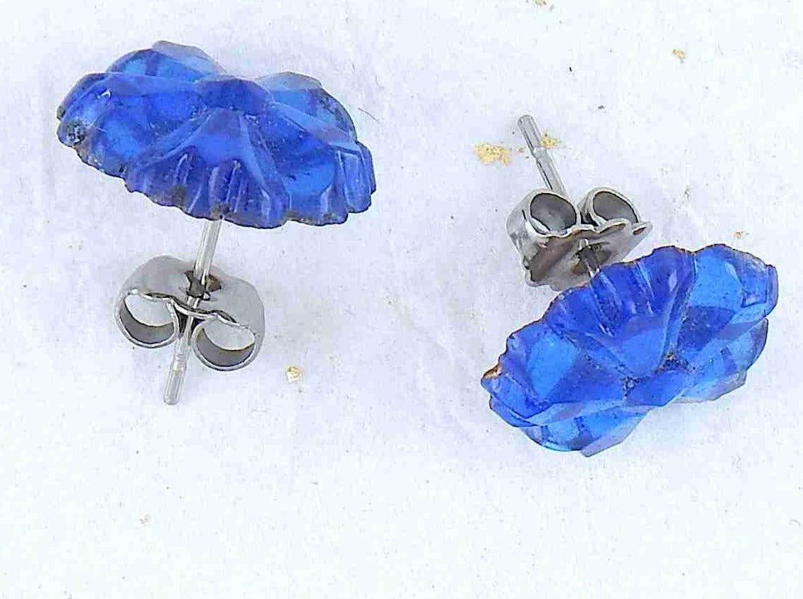 Ear studs with 15mm shiny blue vintage glass periwinkle flowers, stainless steel posts