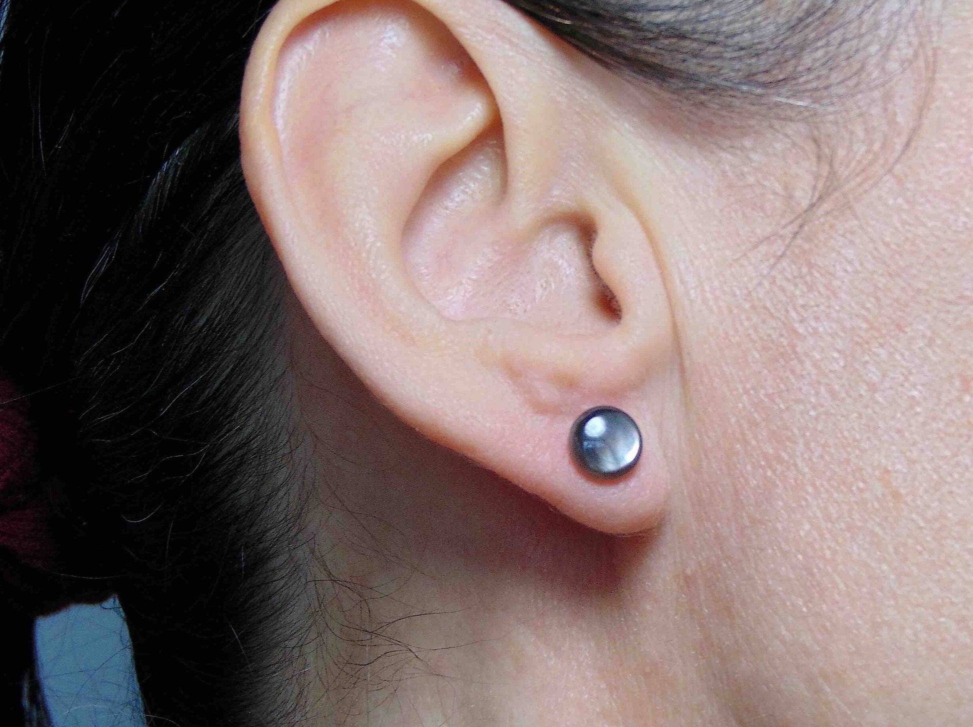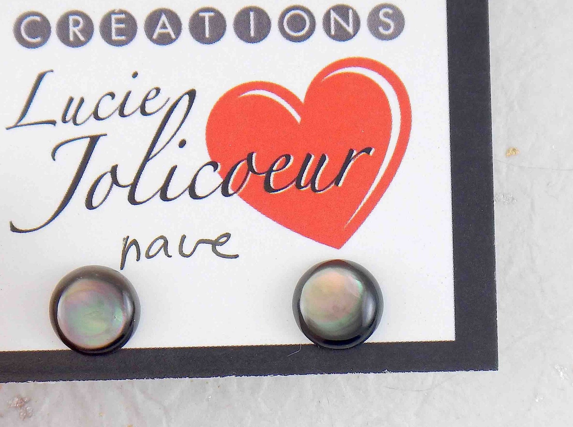 Ear studs with 8mm round iridescent silver gray mother of pearl cabochons, stainless steel posts