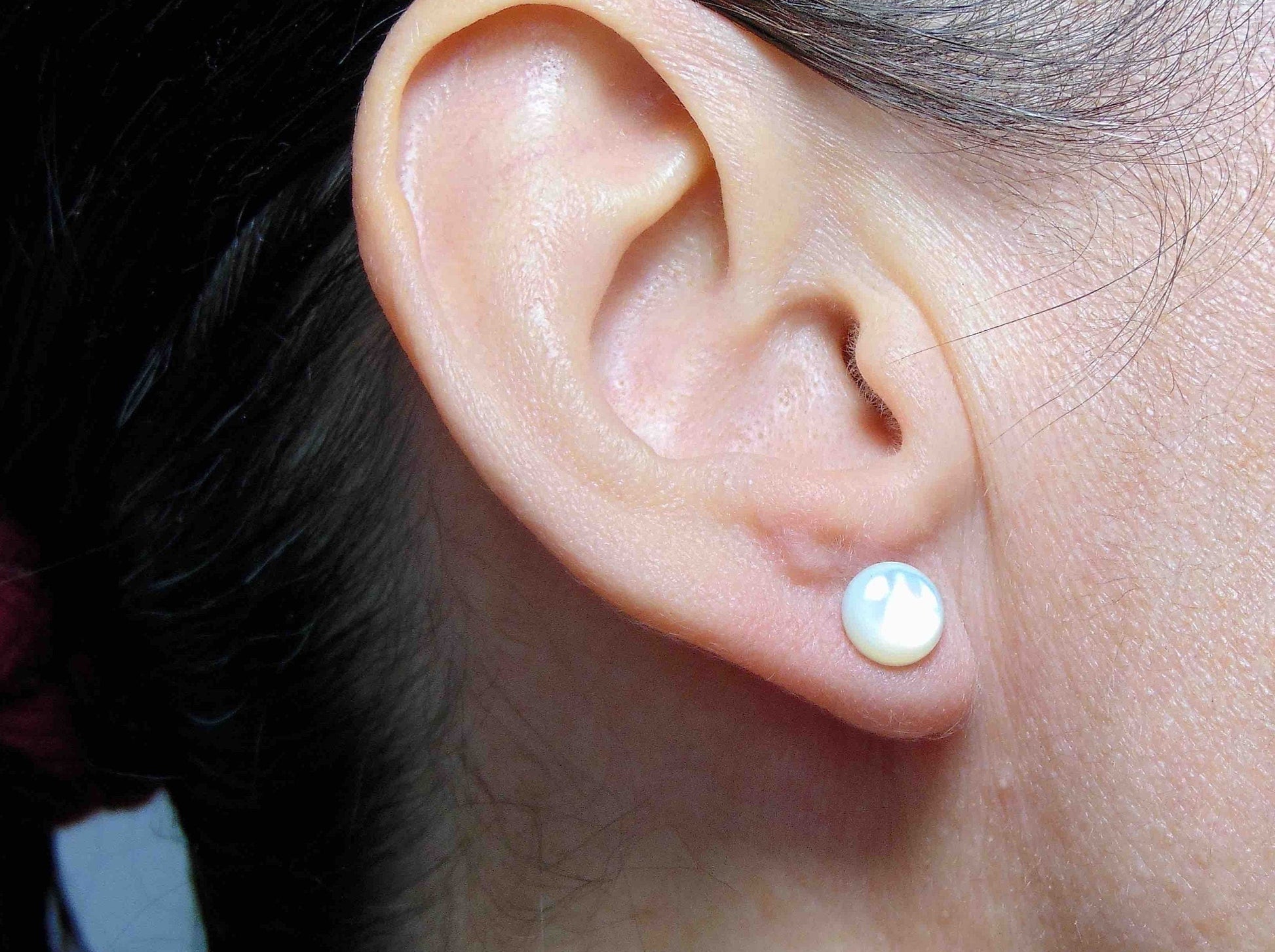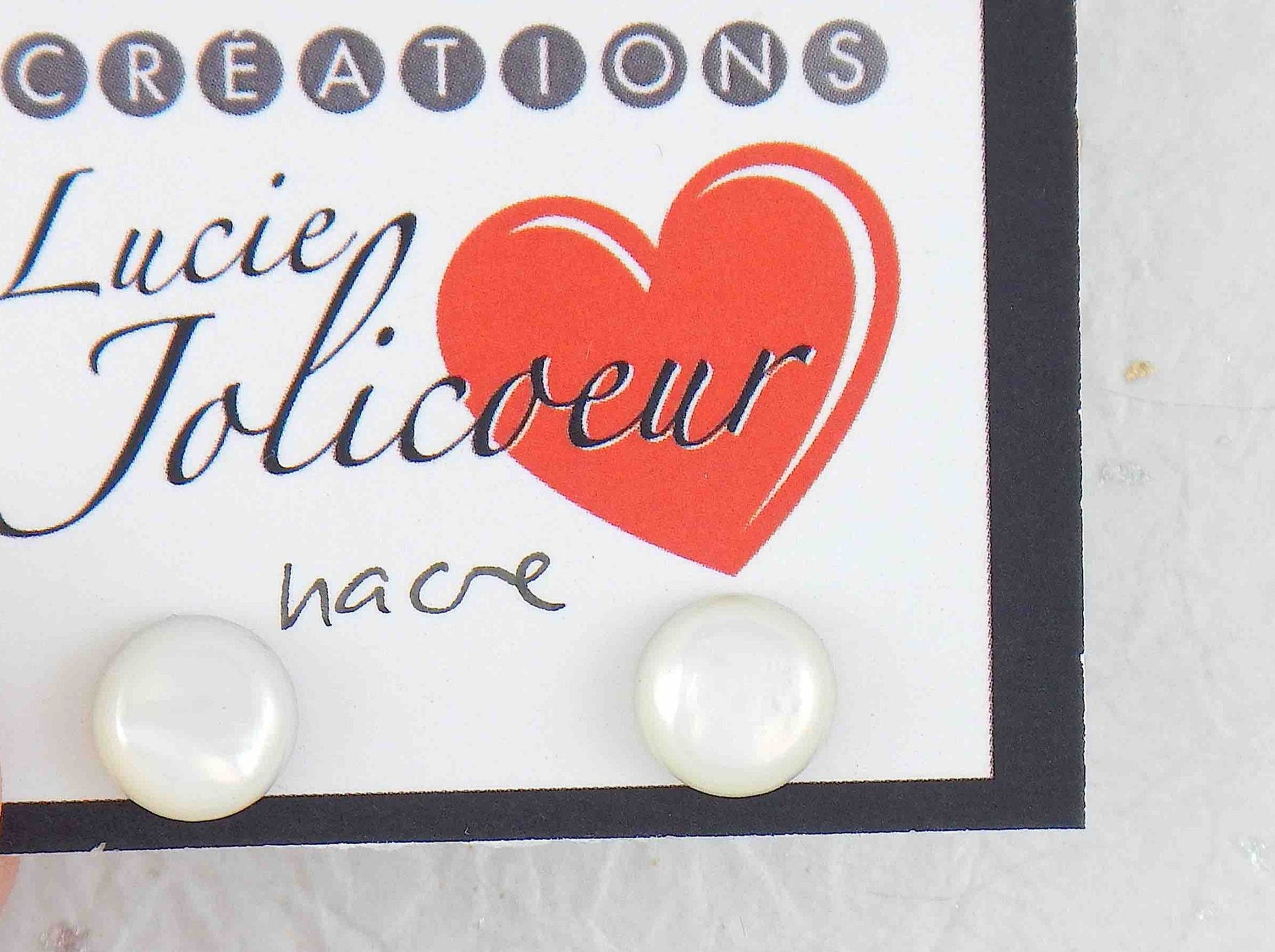 Ear studs with 8mm round iridescent white mother of pearl cabochons, stainless steel posts