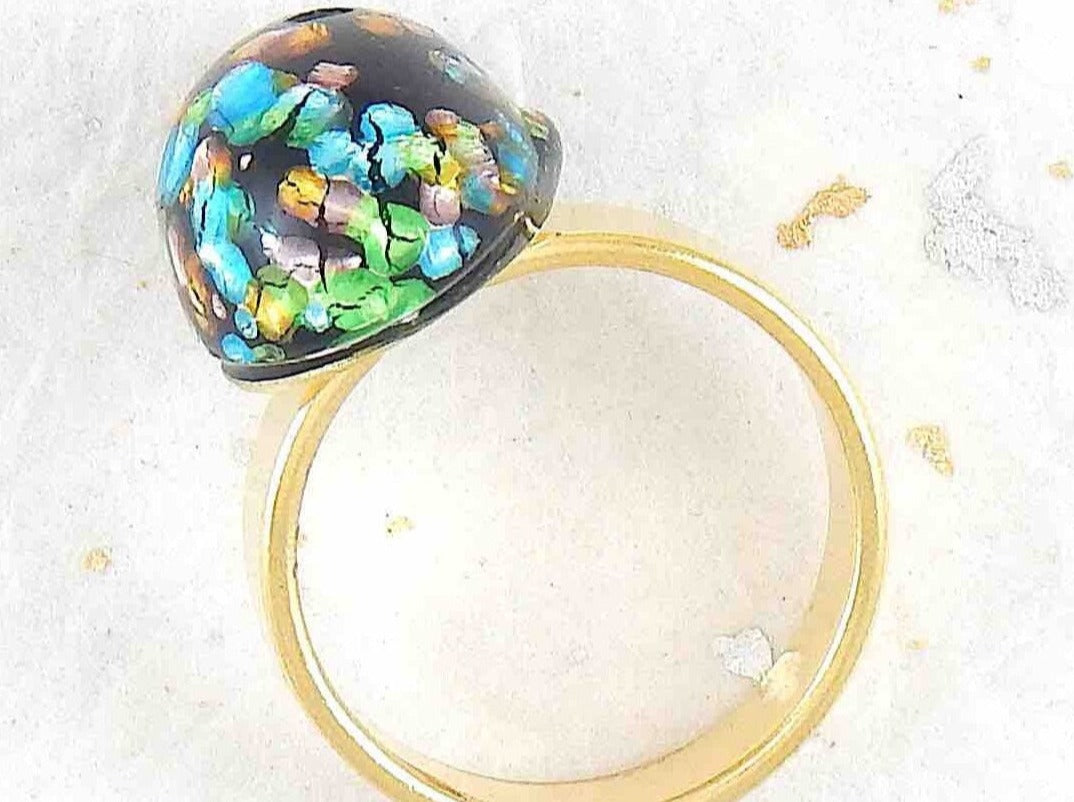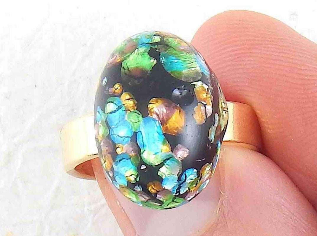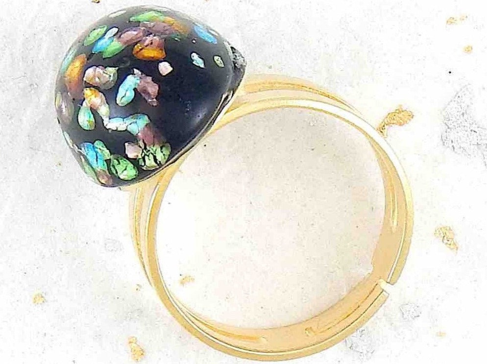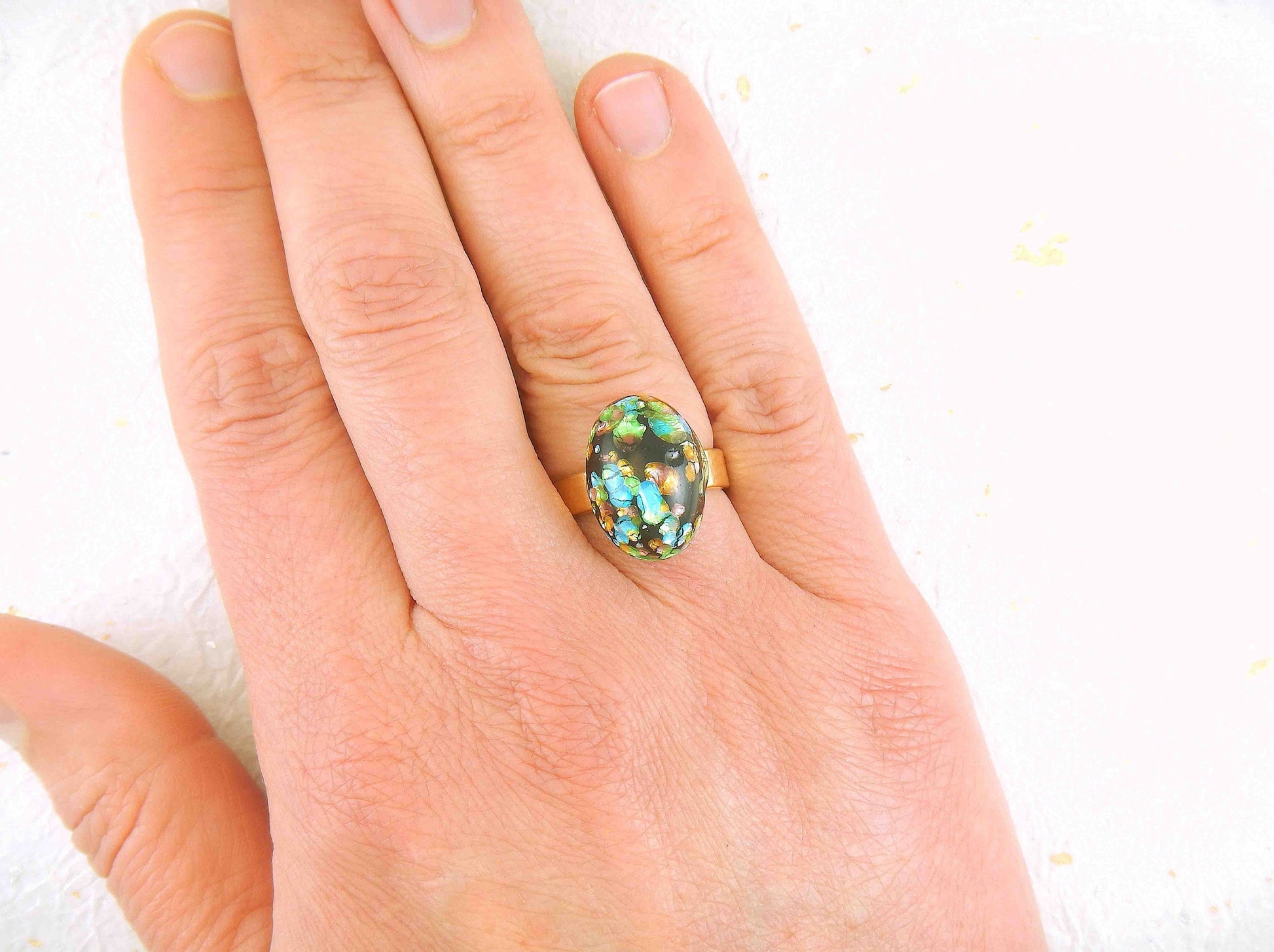 Finger ring with black oval vintage glass cabochon, blue-green-gold speckled, gold-toned stainless steel adjustable base