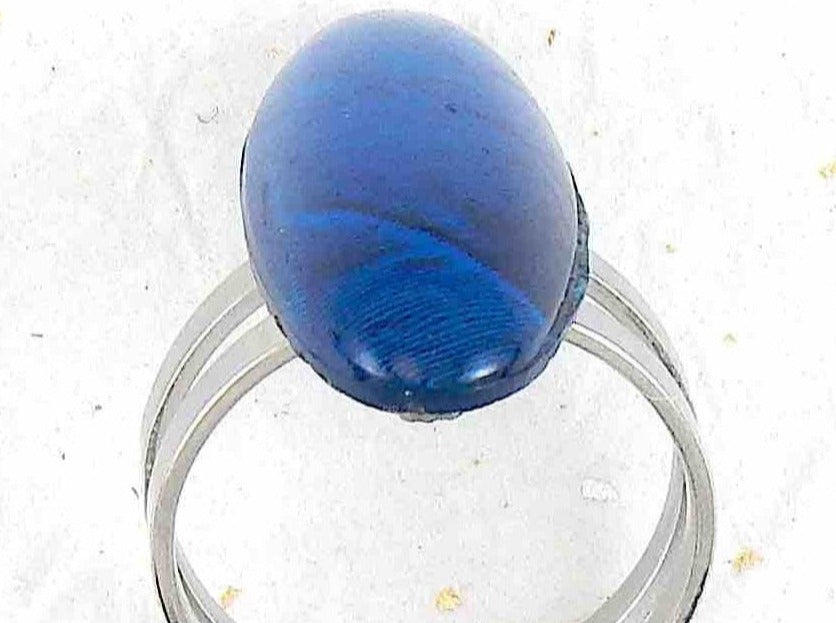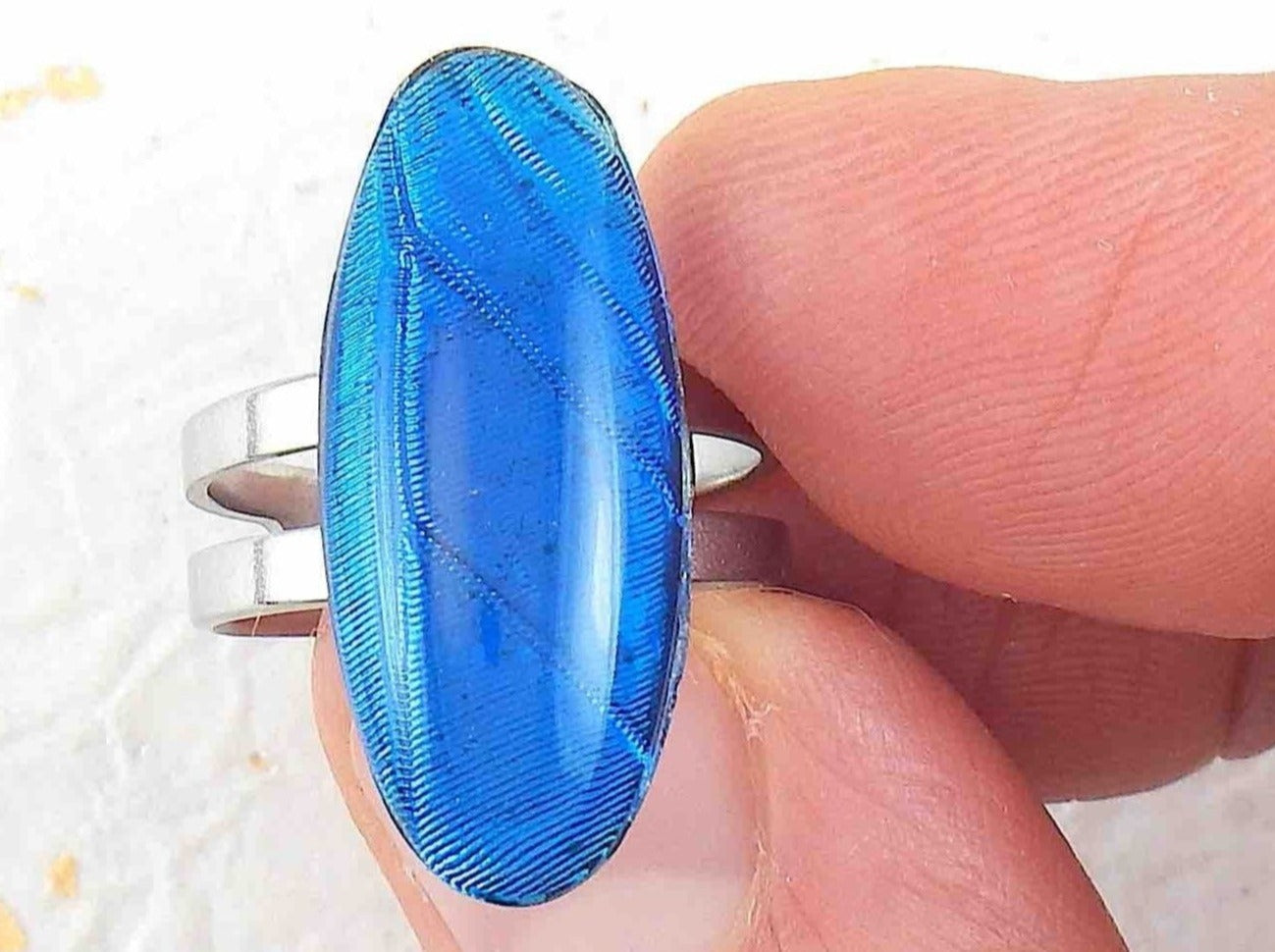 Finger ring with bright turquoise long oval vintage glass cabochon, butterfly wing pattern, adjustable stainless steel base