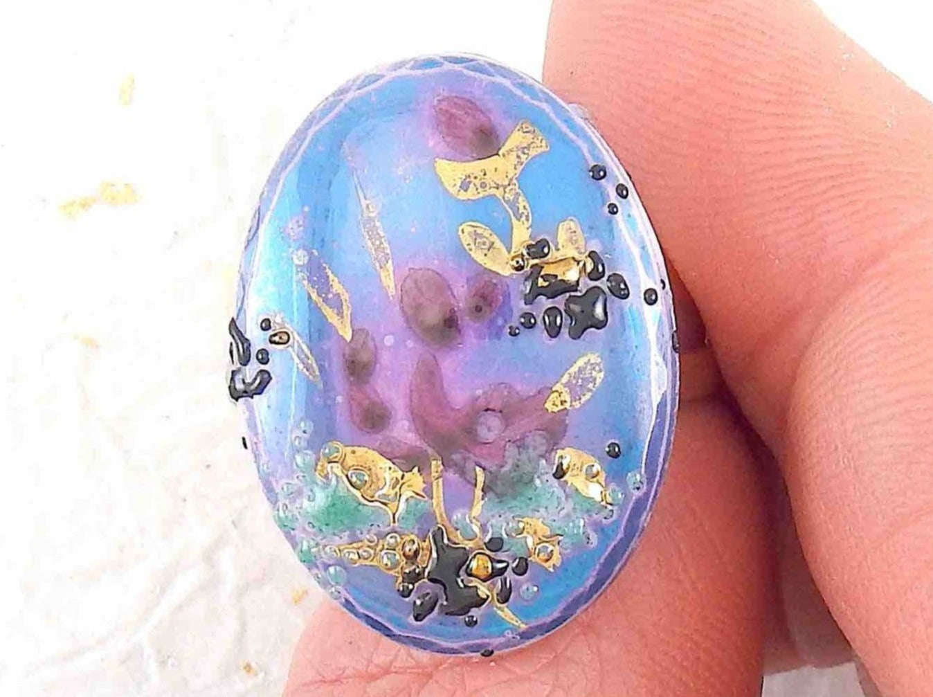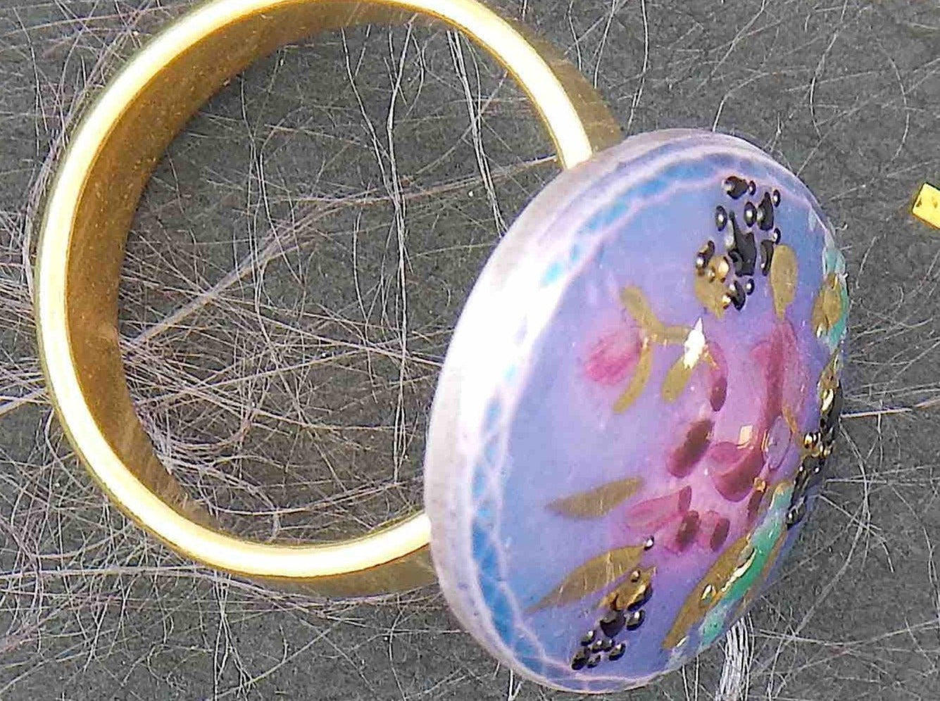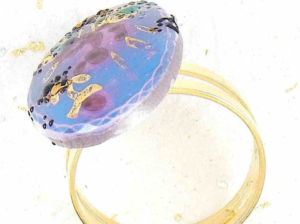 Finger ring with hand-painted blue-pink-gold-black oval vintage glass cabochon, abstract flower pattern, gold-toned stainless steel adjustable base