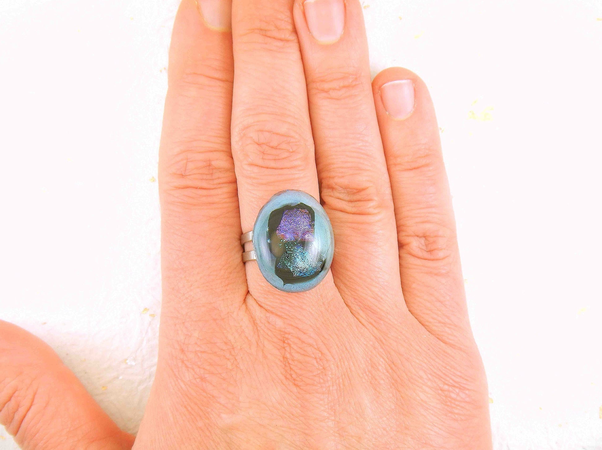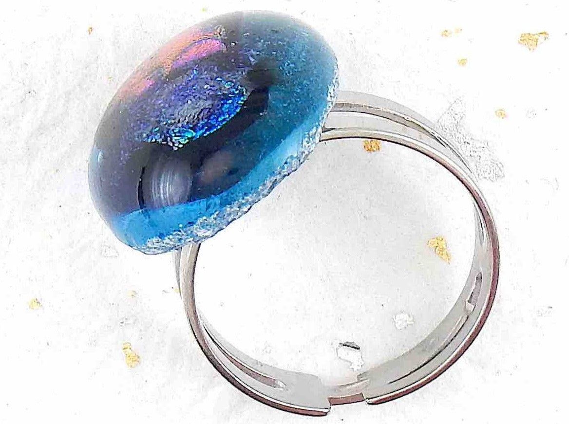 Finger ring with large oval turquoise cabochon (Murano style glass handmade in Montreal), blue-pink dichroic glass, stainless steel adjustable base (US 8-9)