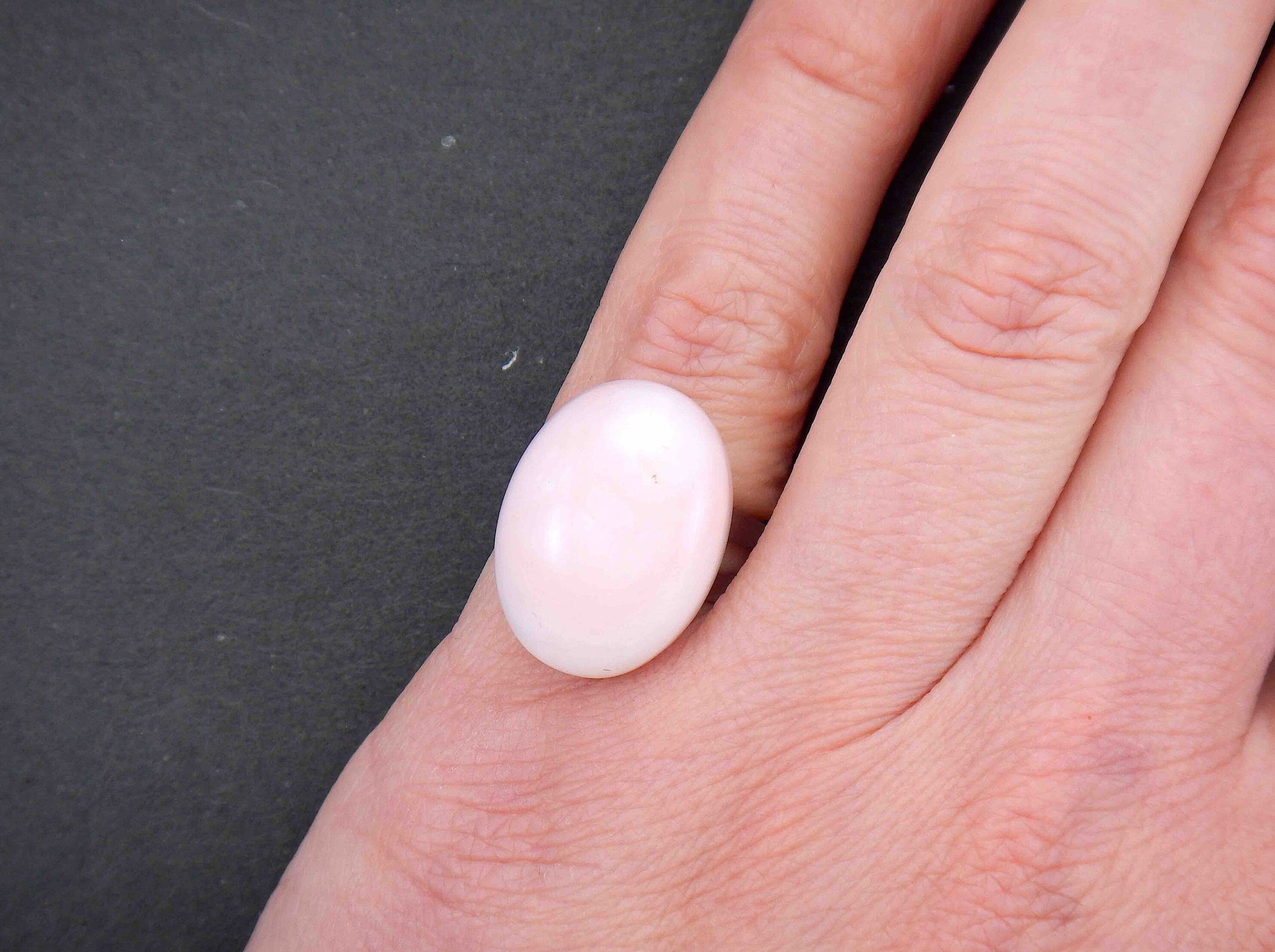 Finger ring with oval natural pink opal stone cabochon, stainless steel adjustable base (US 5-6)
