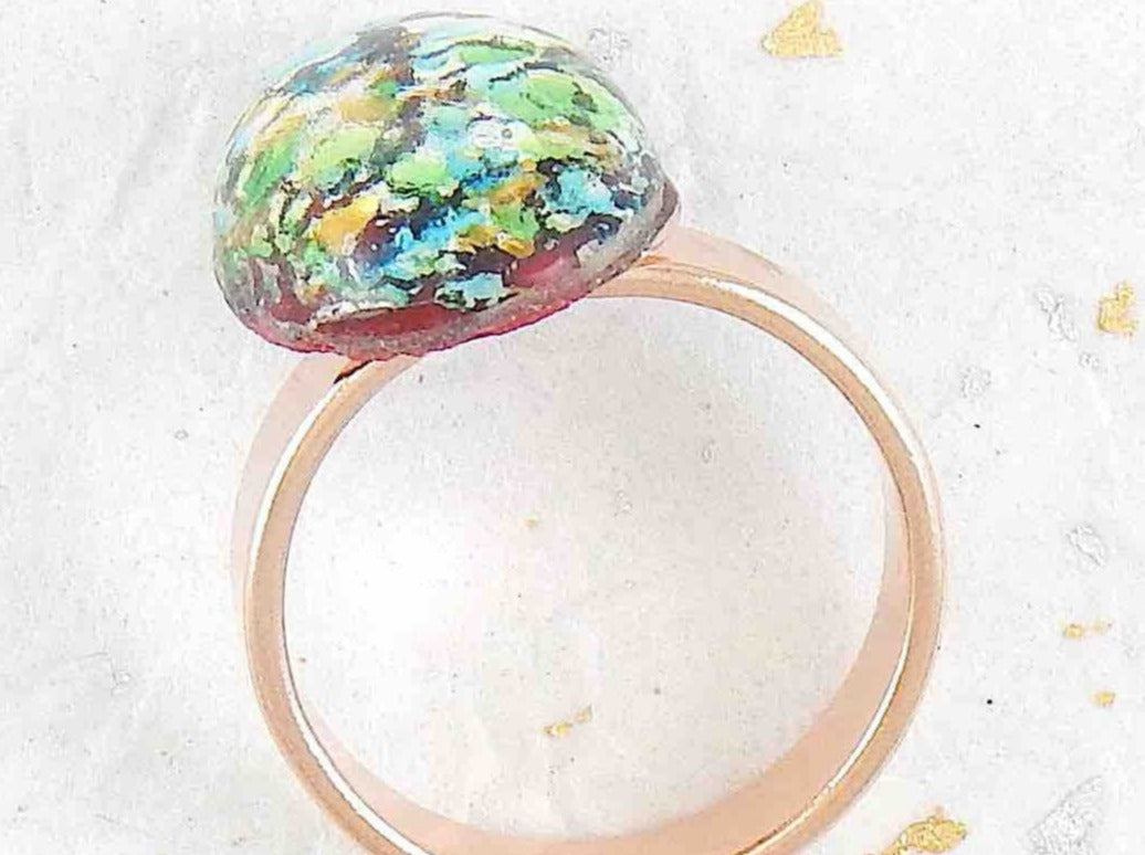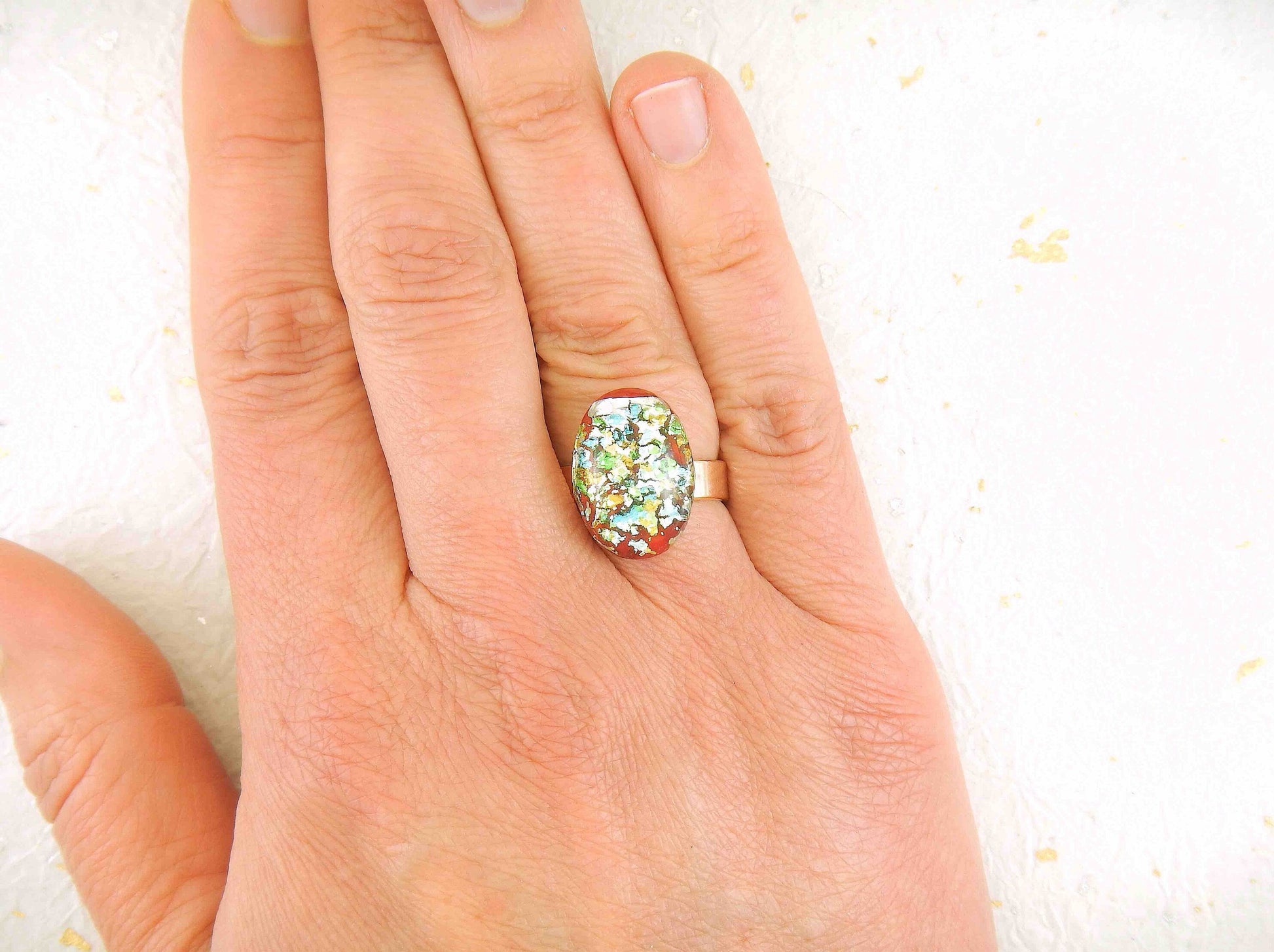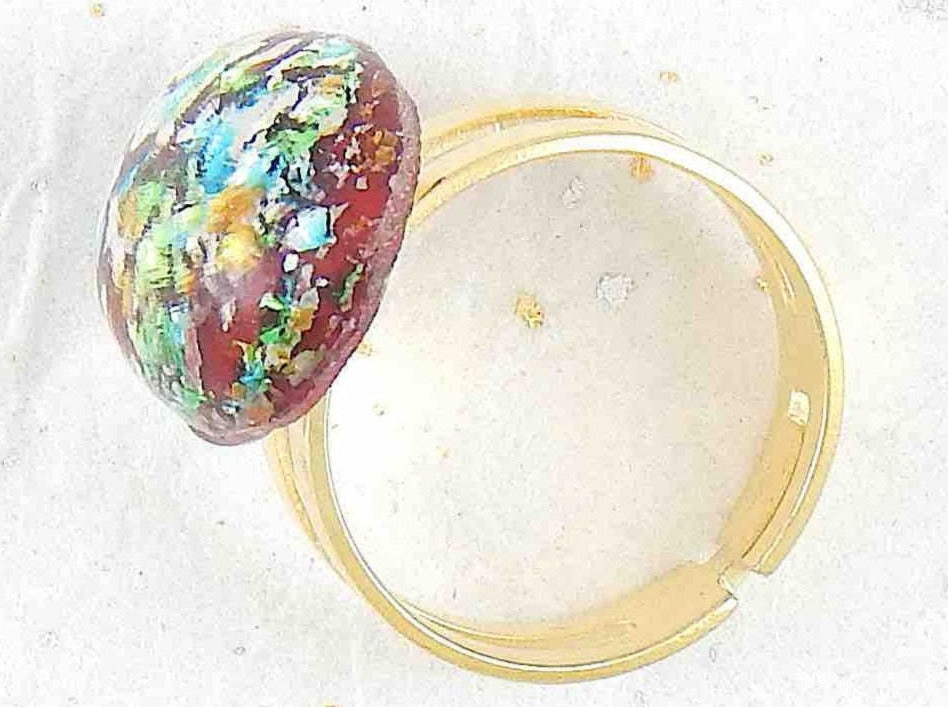 Finger ring with red oval vintage glass cabochon, blue-green-gold-silver speckles, stainless steel adjustable base