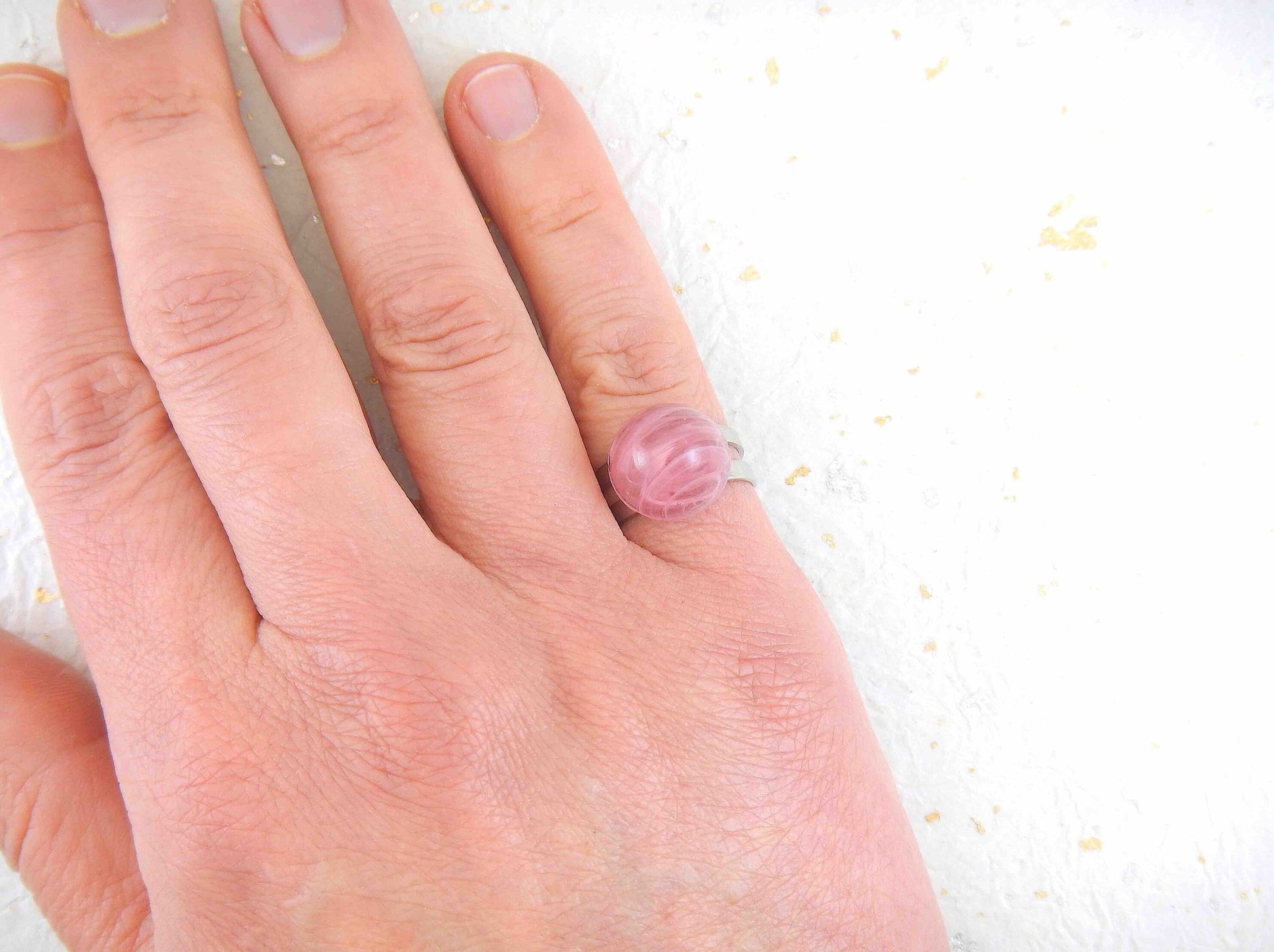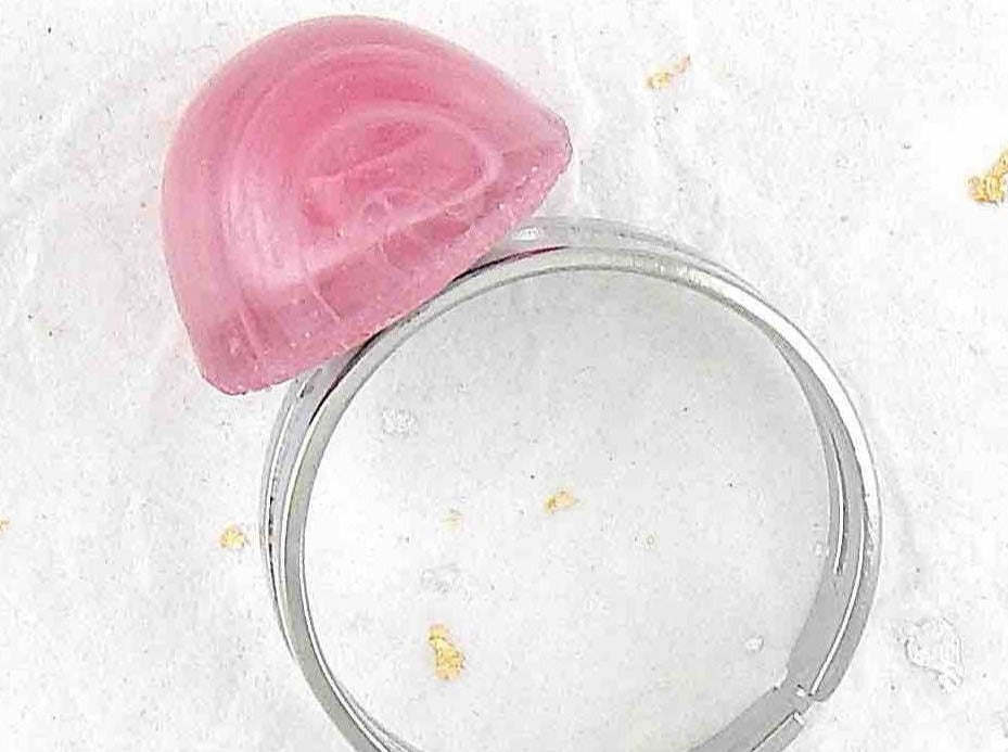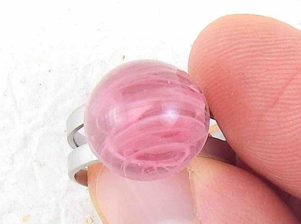 Finger ring with small marbled pink vintage glass dome, adjustable stainless steel base