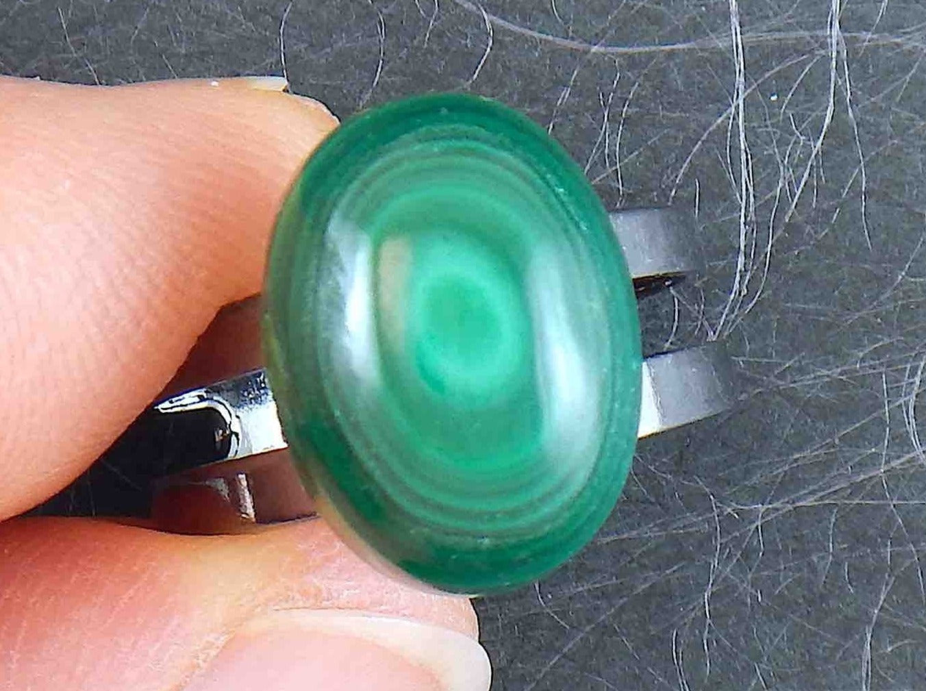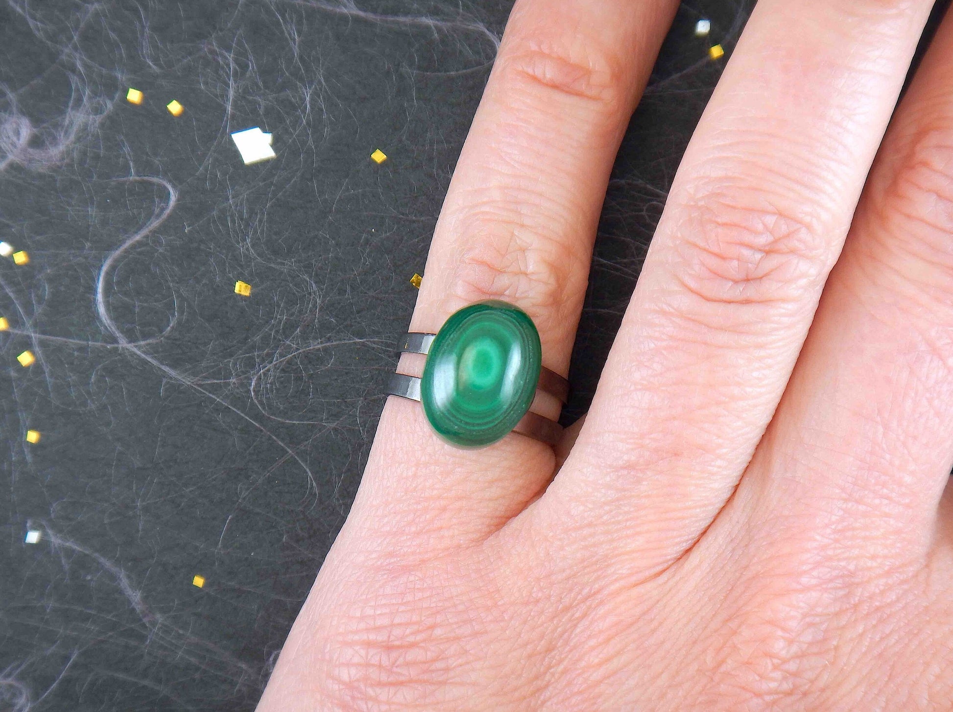 Finger ring with small oval malachite stone cabochon, concentric dark and light green rings, black nickel metal adjustable base (US 5-6)