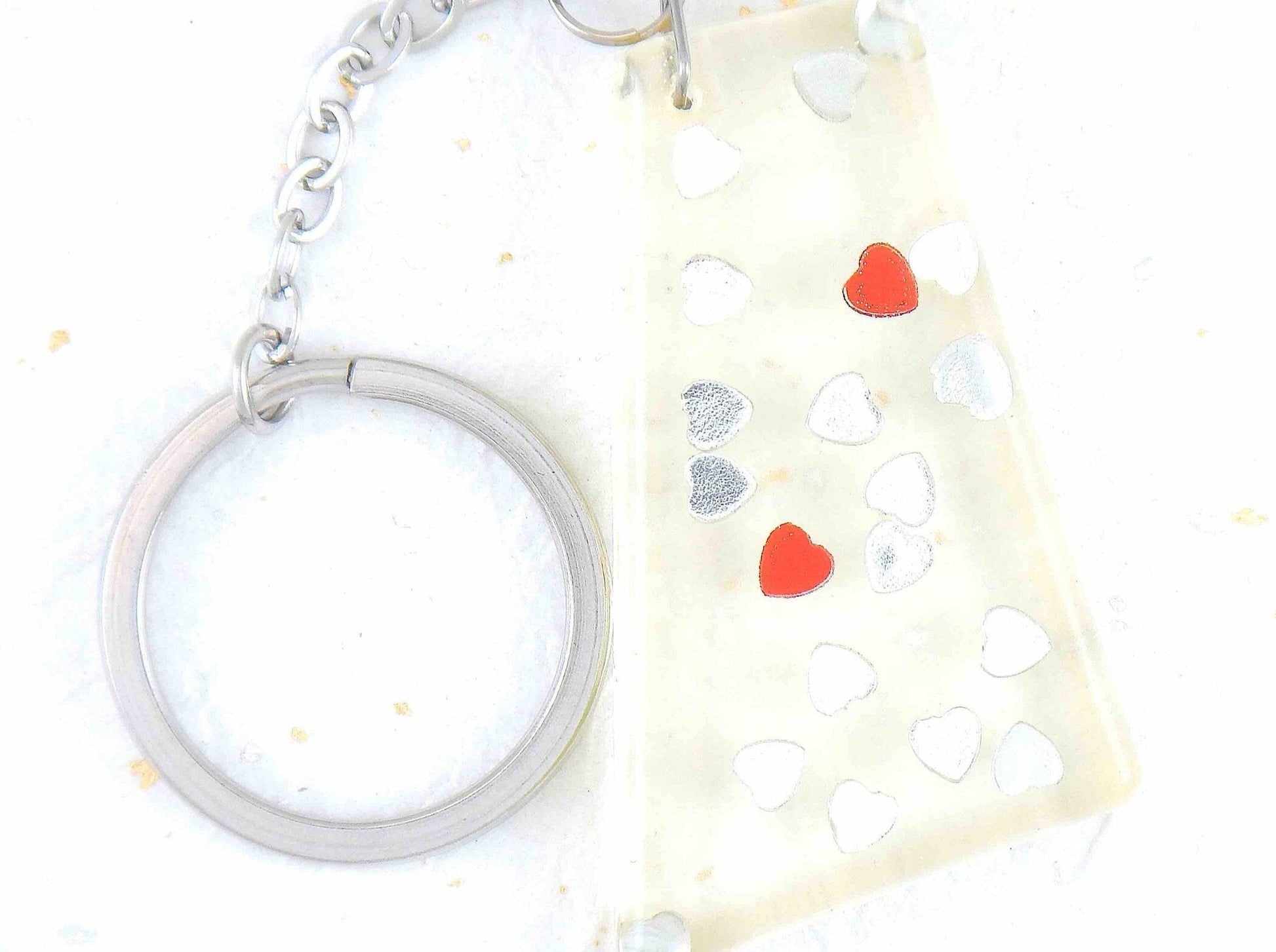Keychain with handmade resin parallelepiped, tiny red and silver hearts, stainless steel chain