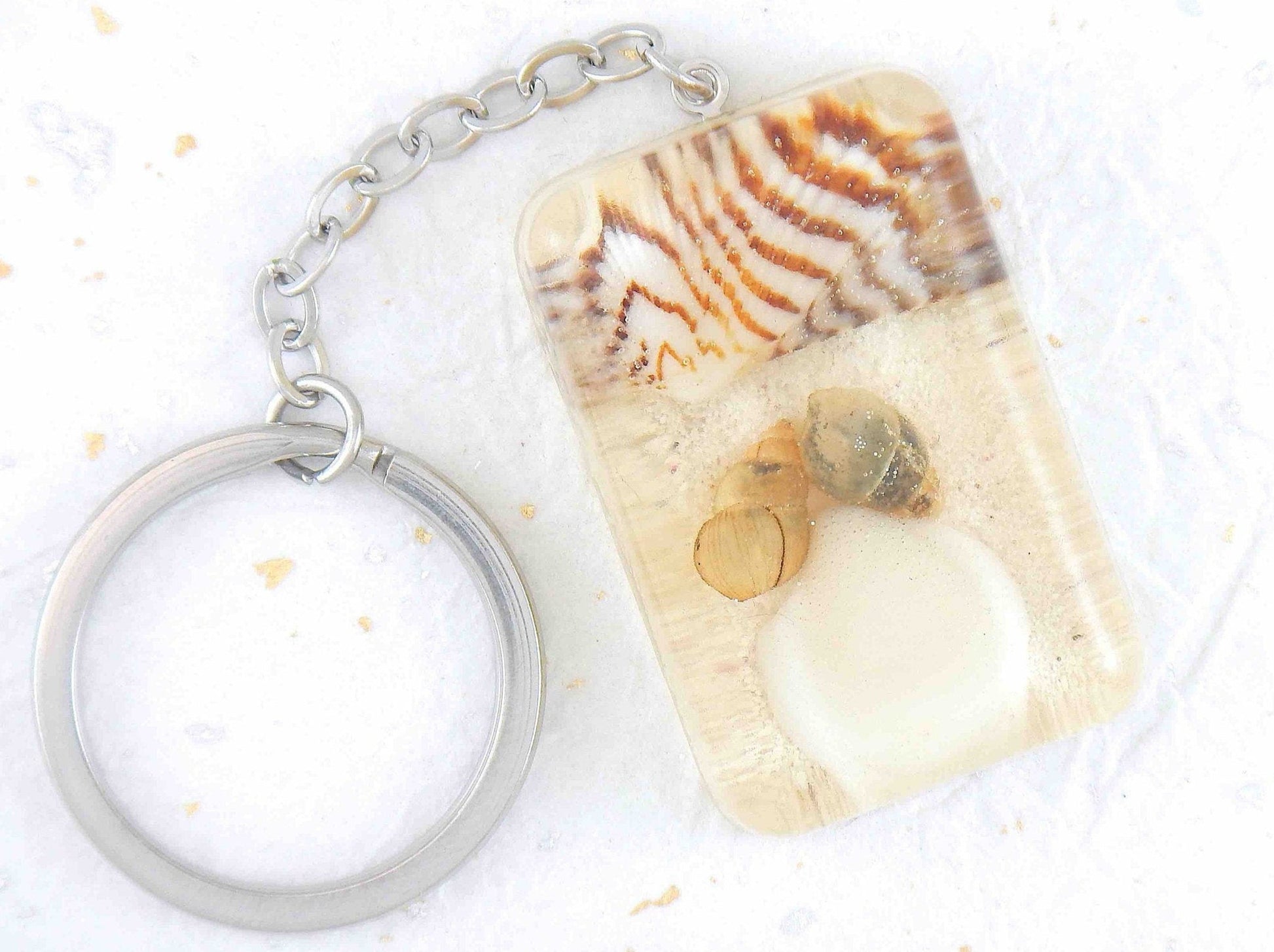 Keychain with handmade resin rectangle, white beach sand, brown and white striped shells, stainless steel chain