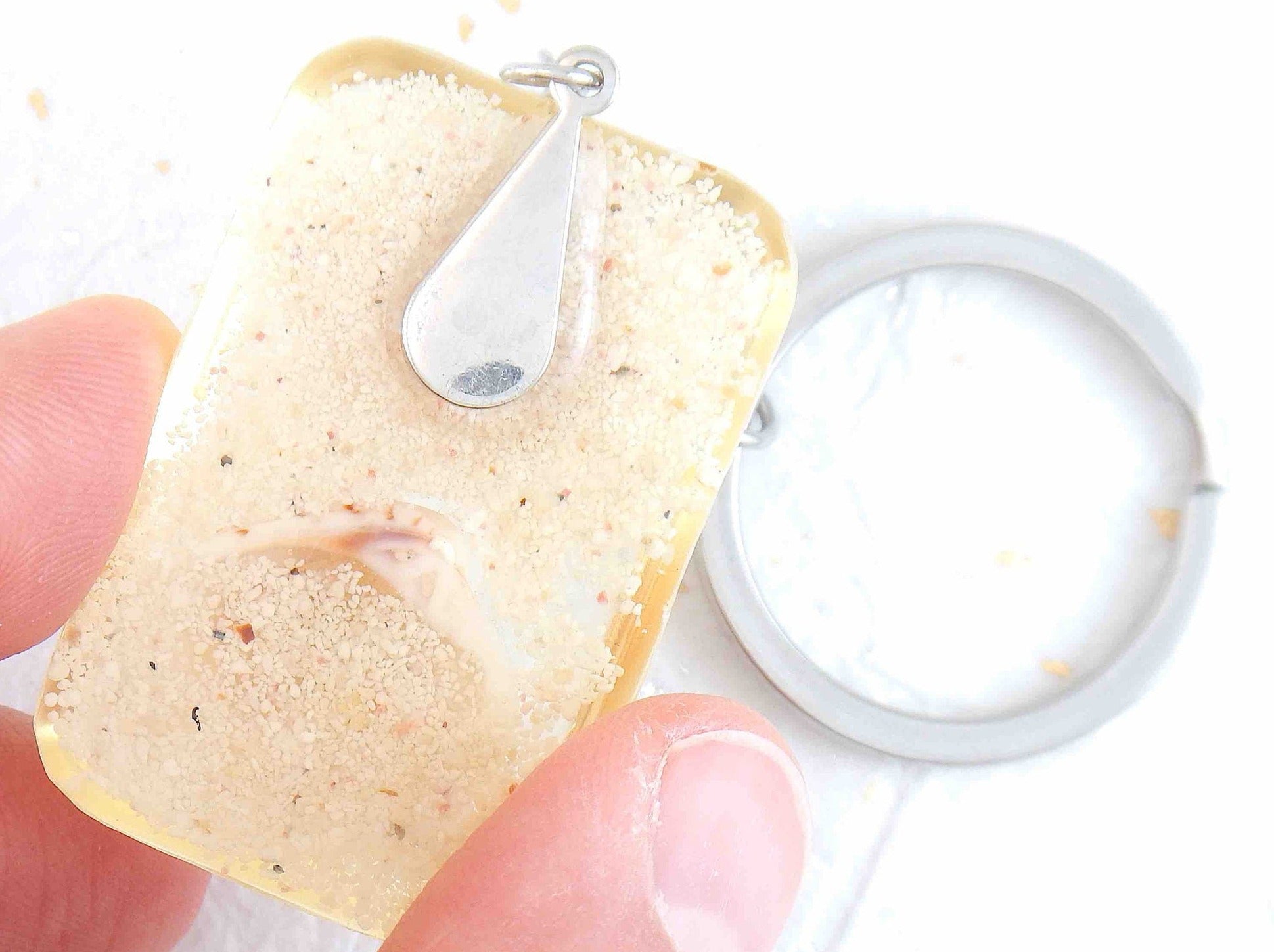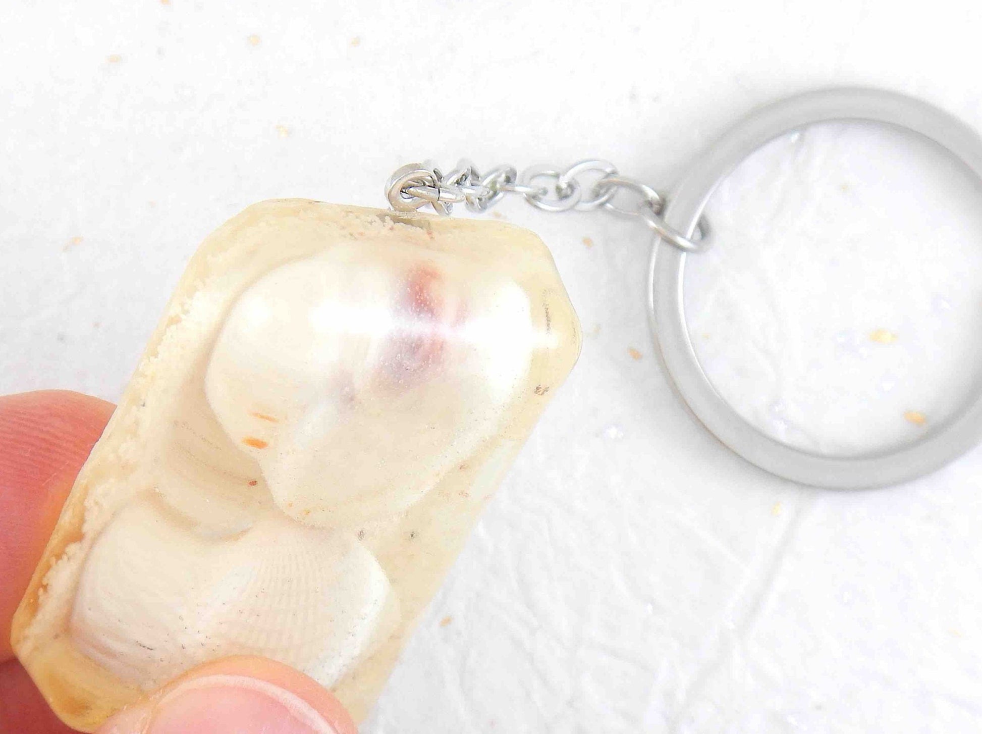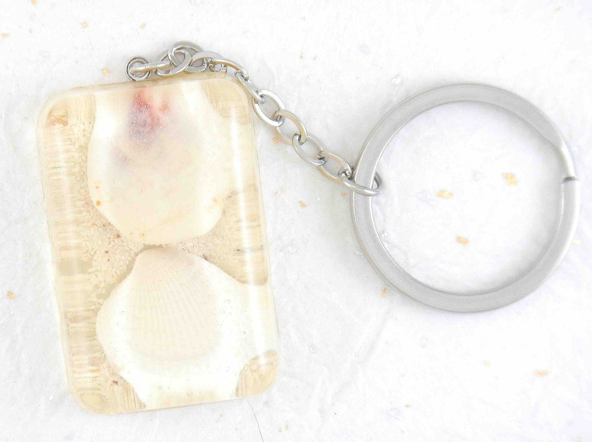 Keychain with handmade resin rectangle, white beach sand, white and pink shells, stainless steel chain