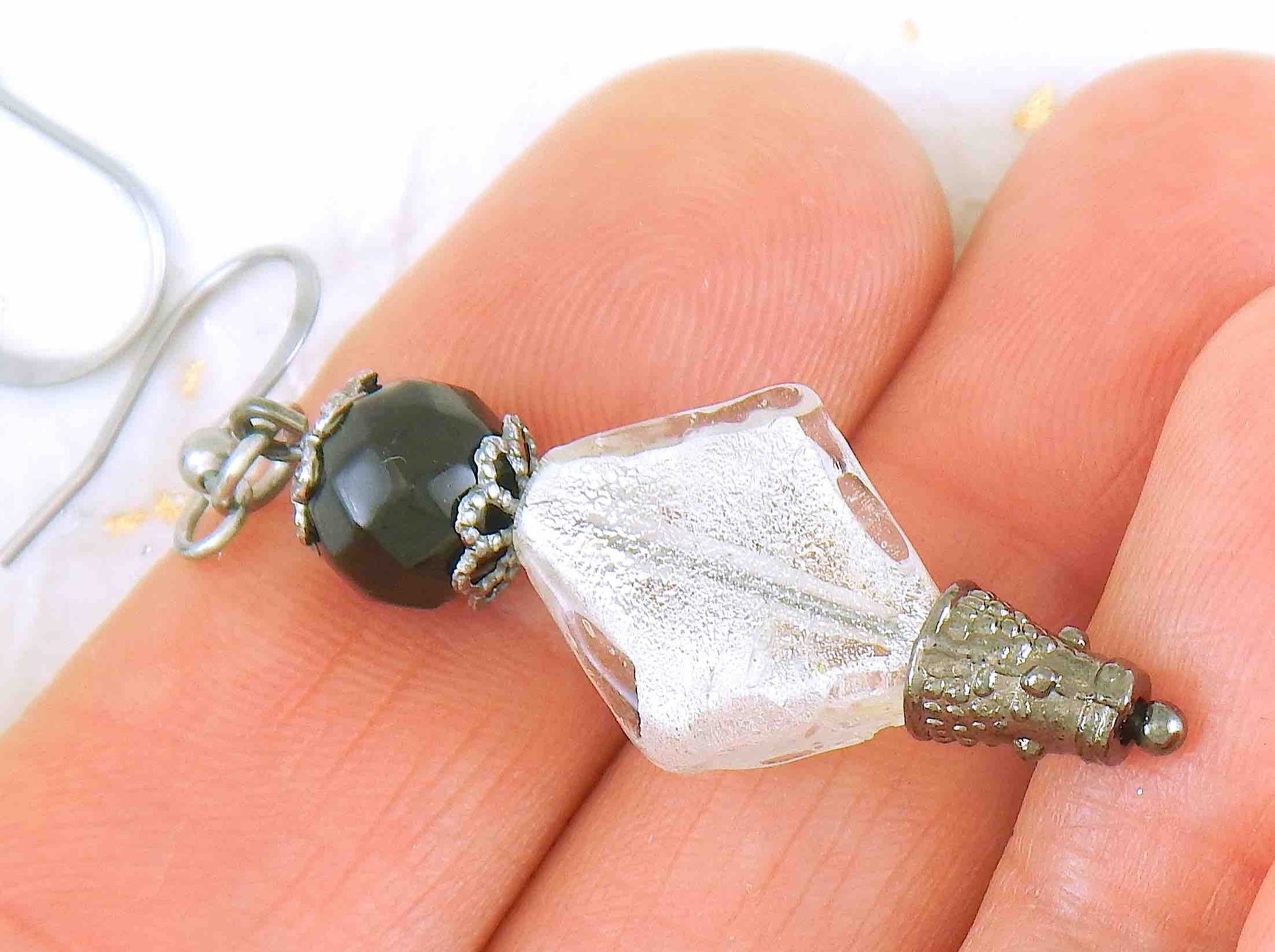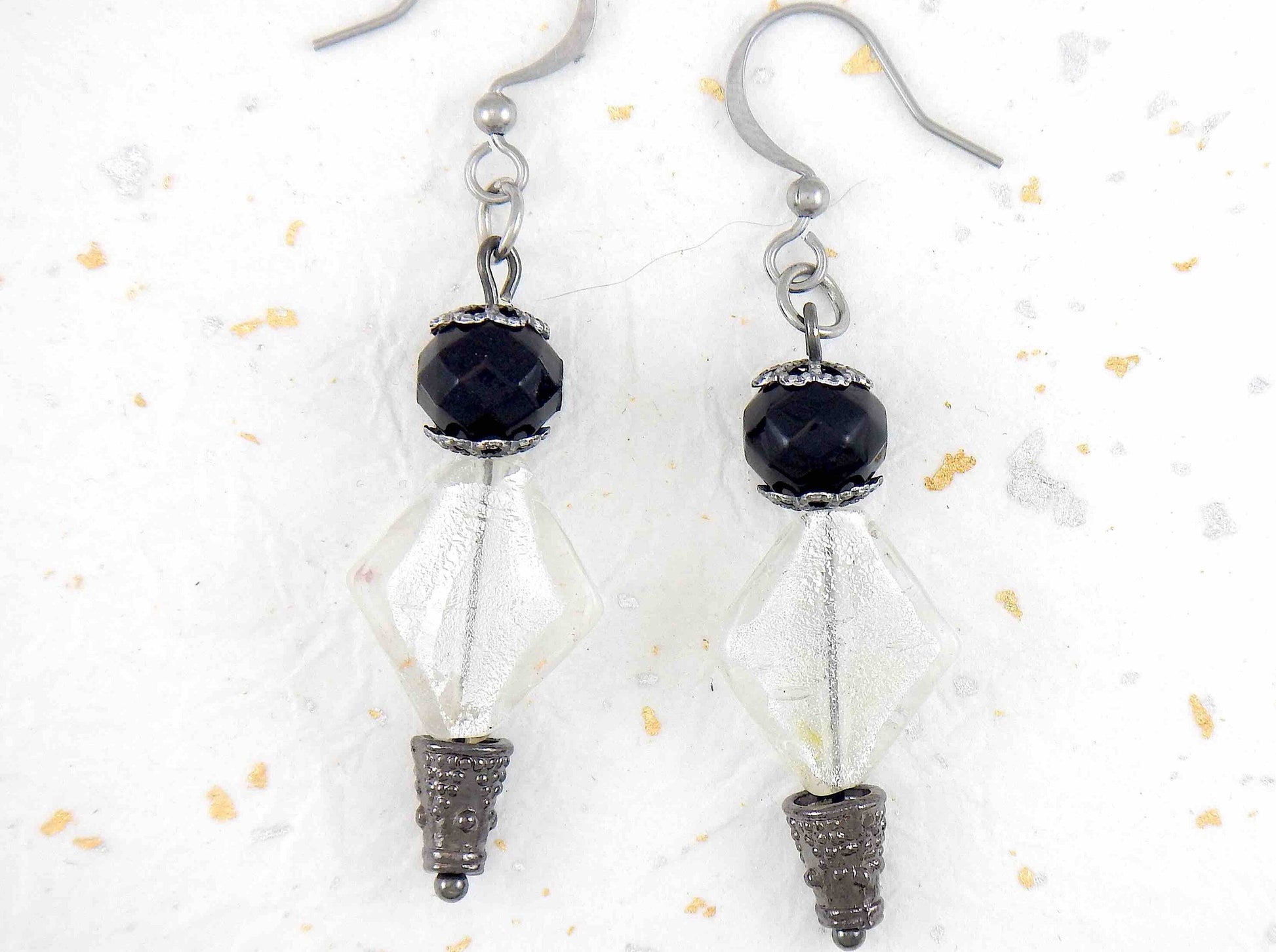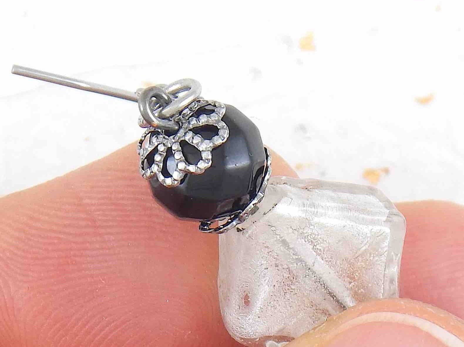 Long earrings with black balls, white lozenges and black nickel caps, stainless steel hooks