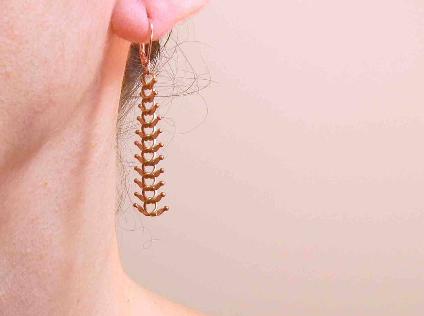 Long earrings with centipede-shaped rose gold chain, rose-gold plated metal lever back hooks
